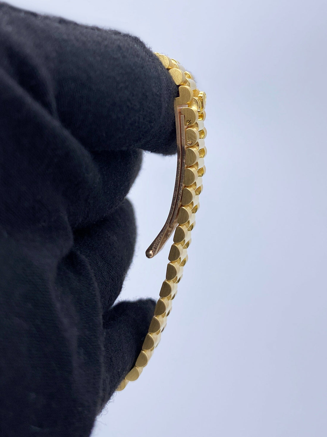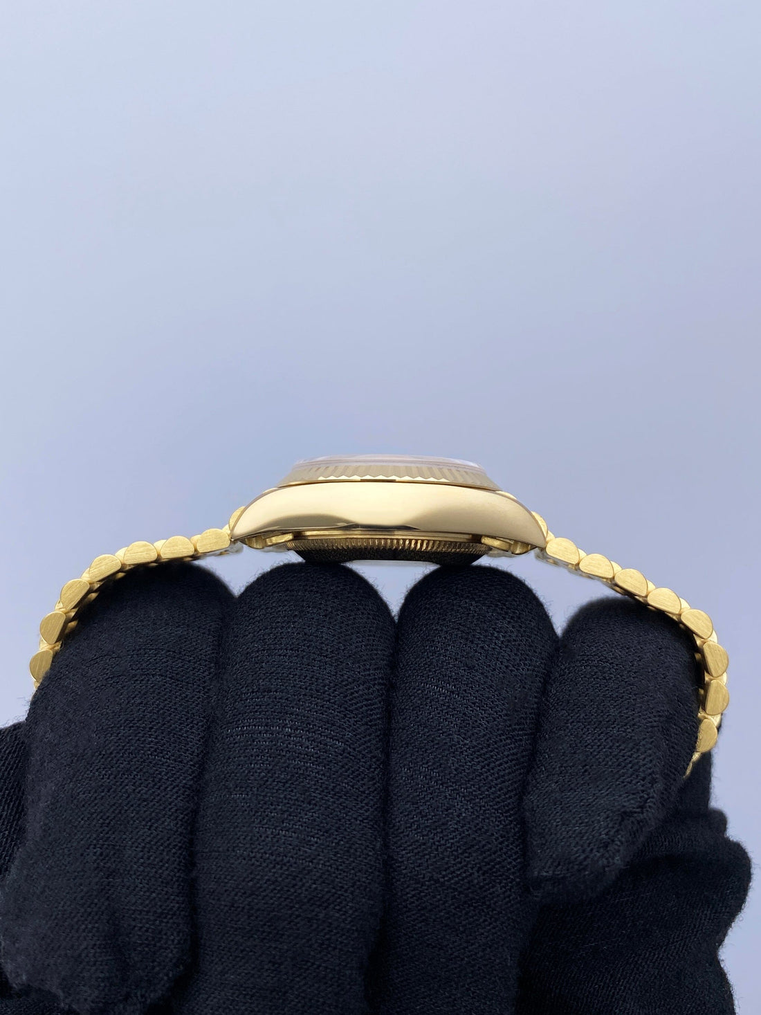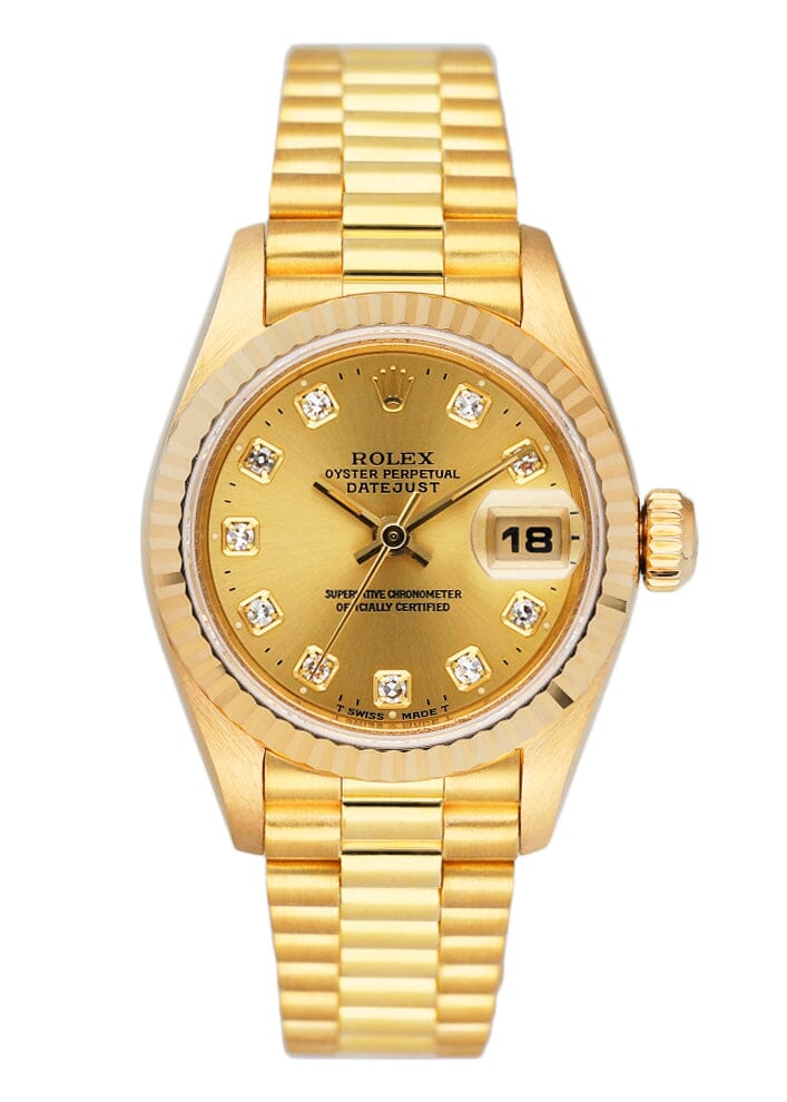 Rolex Oyster Perpetual Datejust 69178 Ladies Watch. 26mm 18K yellow gold case with a fluted bezel. Champagne dial with gold hands and original factory diamond set hour markers. Minute markers on the outer dial. Date display at the 3 o'clock position. 18K yellow gold President bracelet with 18K rose gold hidden fold over clasp. Will fit up to 6-Inch wrist. Sapphire crystal. 18K yellow gold case back. Automatic self-winding movement. This watch comes with original Box and Papers.