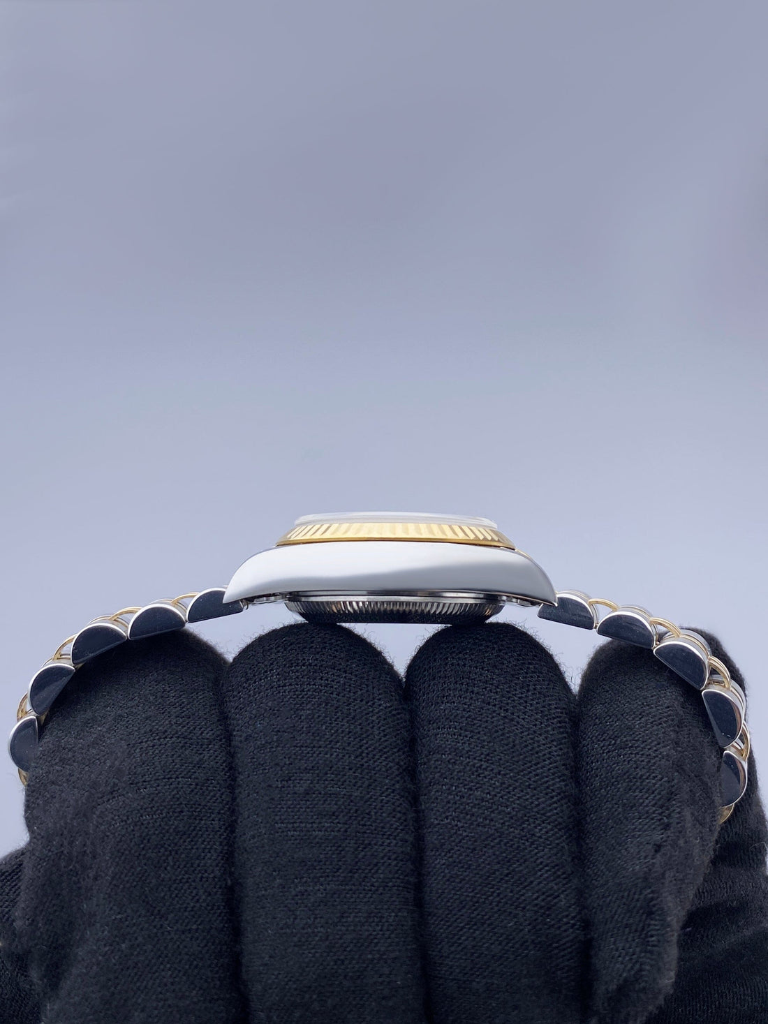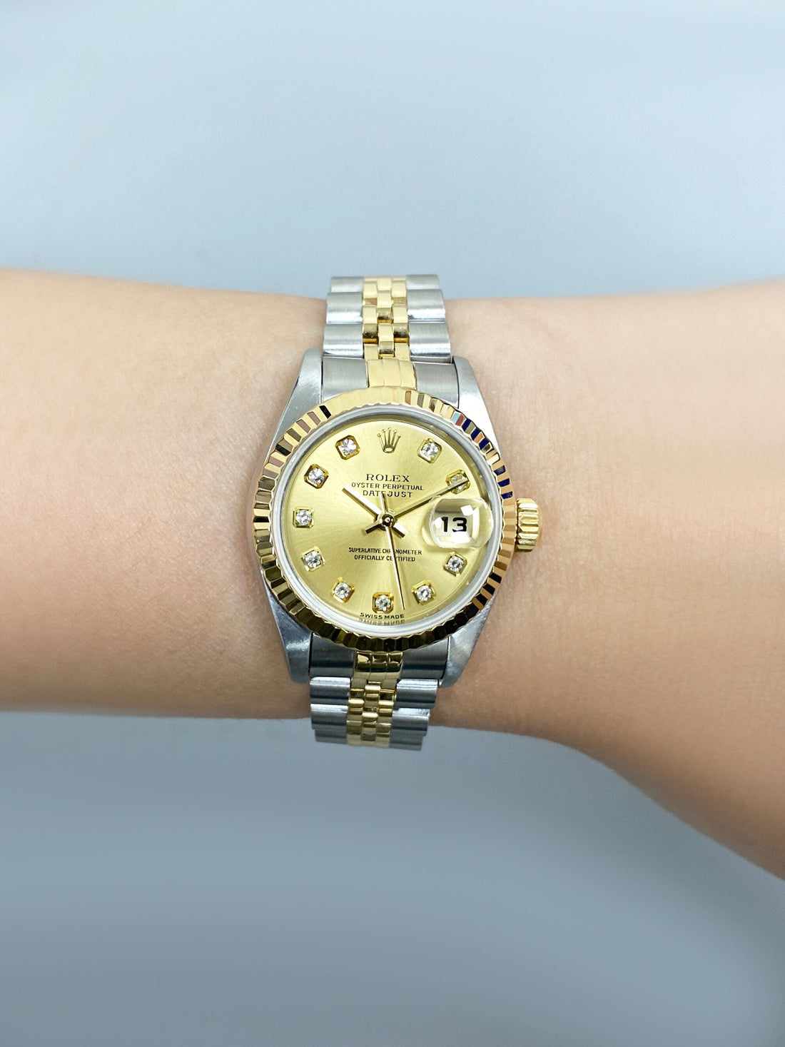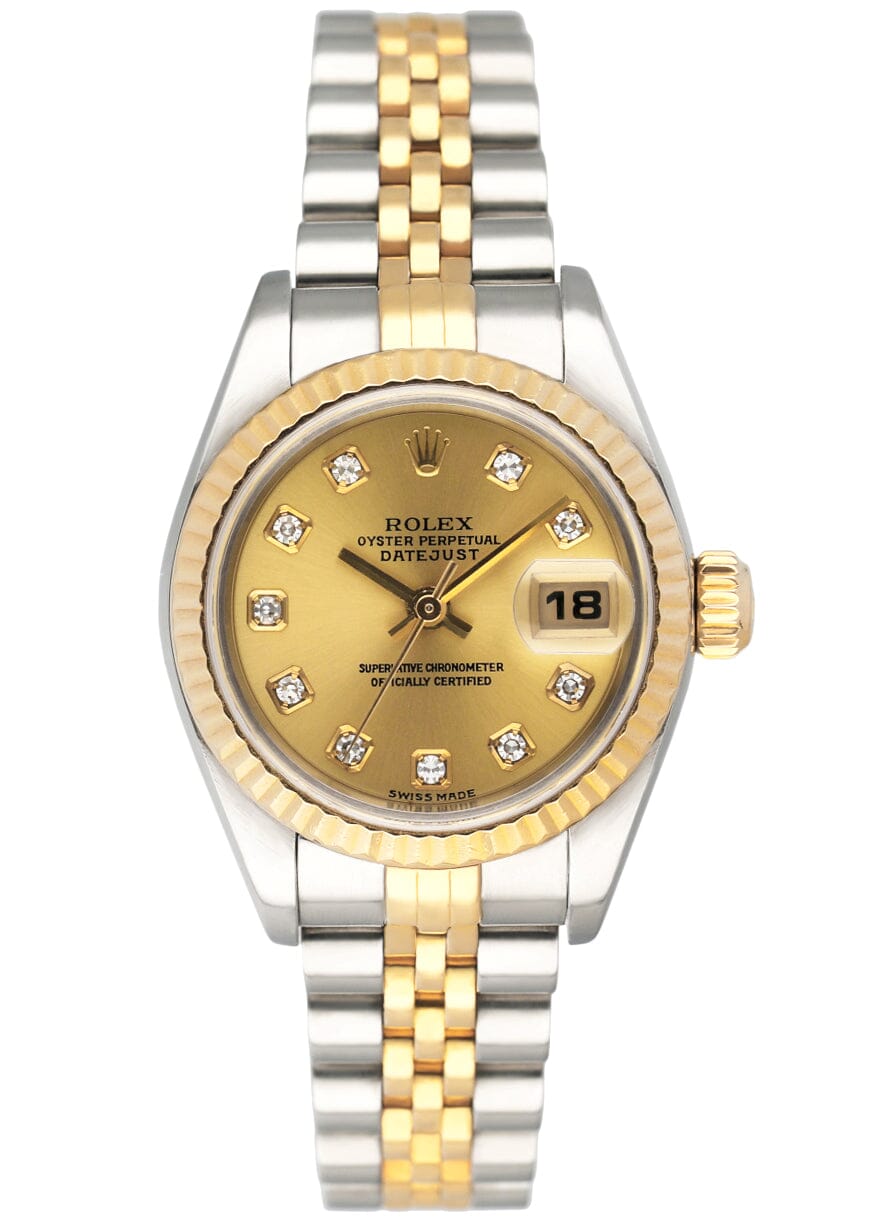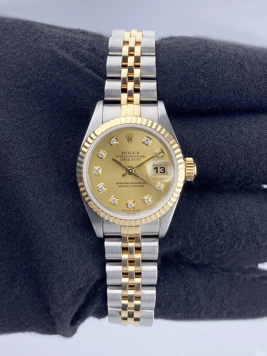Rolex Datejust 79173 Ladies Watch. 26mm Stainless Steel case with 18K yellow gold fluted bezel. Champagne dial with gold hands and original factory diamond set hour marker. Date display at the 3 o'clock position. Stainless steel & 18K yellow gold jubilee bracelet with fold over clasp. Will fit up to a 6-inch wrist. Sapphire crystal. Stainless steel case back. Automatic self-winding movement.