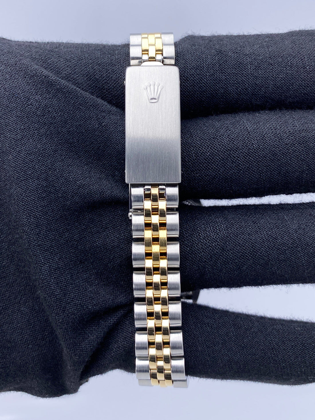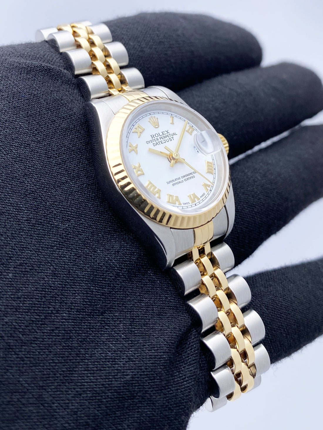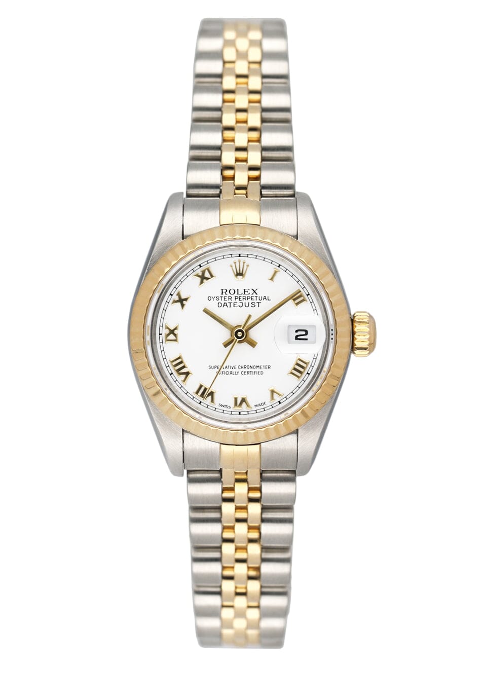 Rolex Datejust 79173 Ladies Watch. 26mm Stainless Steel case with 18K yellow gold fluted bezel. White dial with gold hands and Roman numeral hour marker. Date display at the 3 o'clock position. Stainless steel & 18K yellow gold jubilee bracelet with fold over clasp. Will fit up to a 6-inch wrist. Sapphire crystal. Stainless steel case back. Automatic self-winding movement.