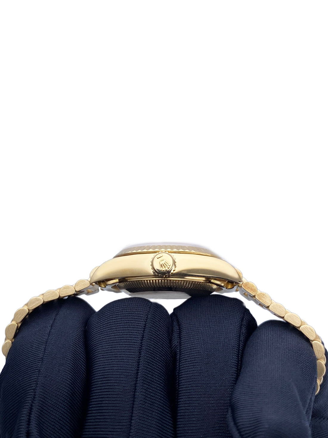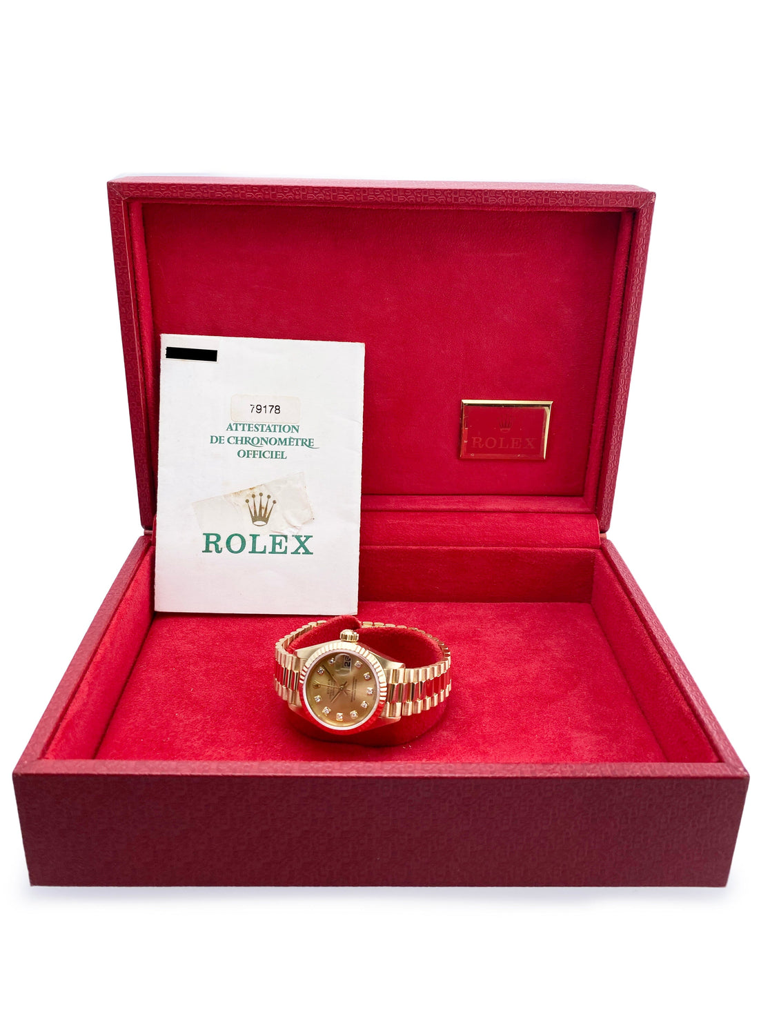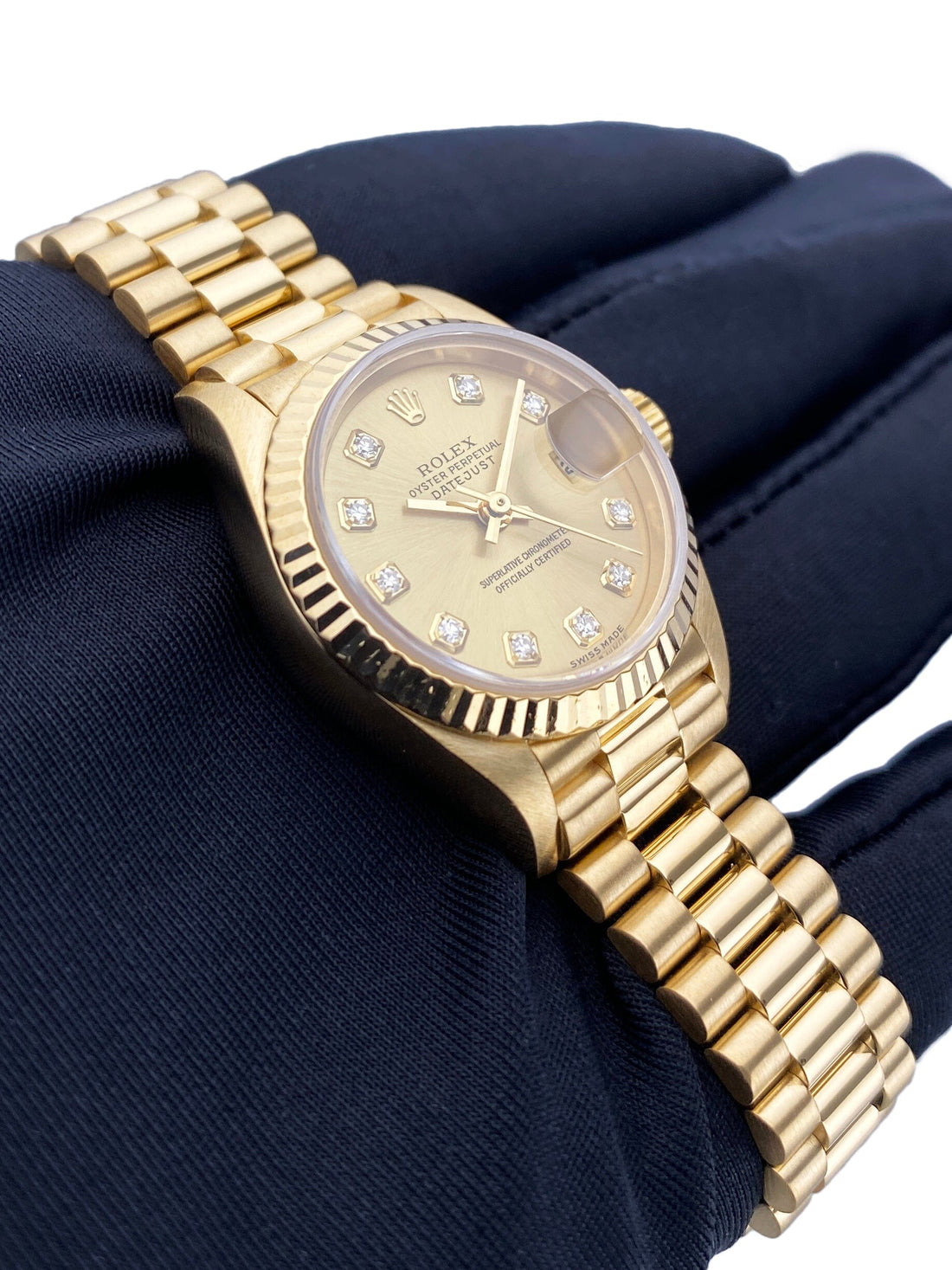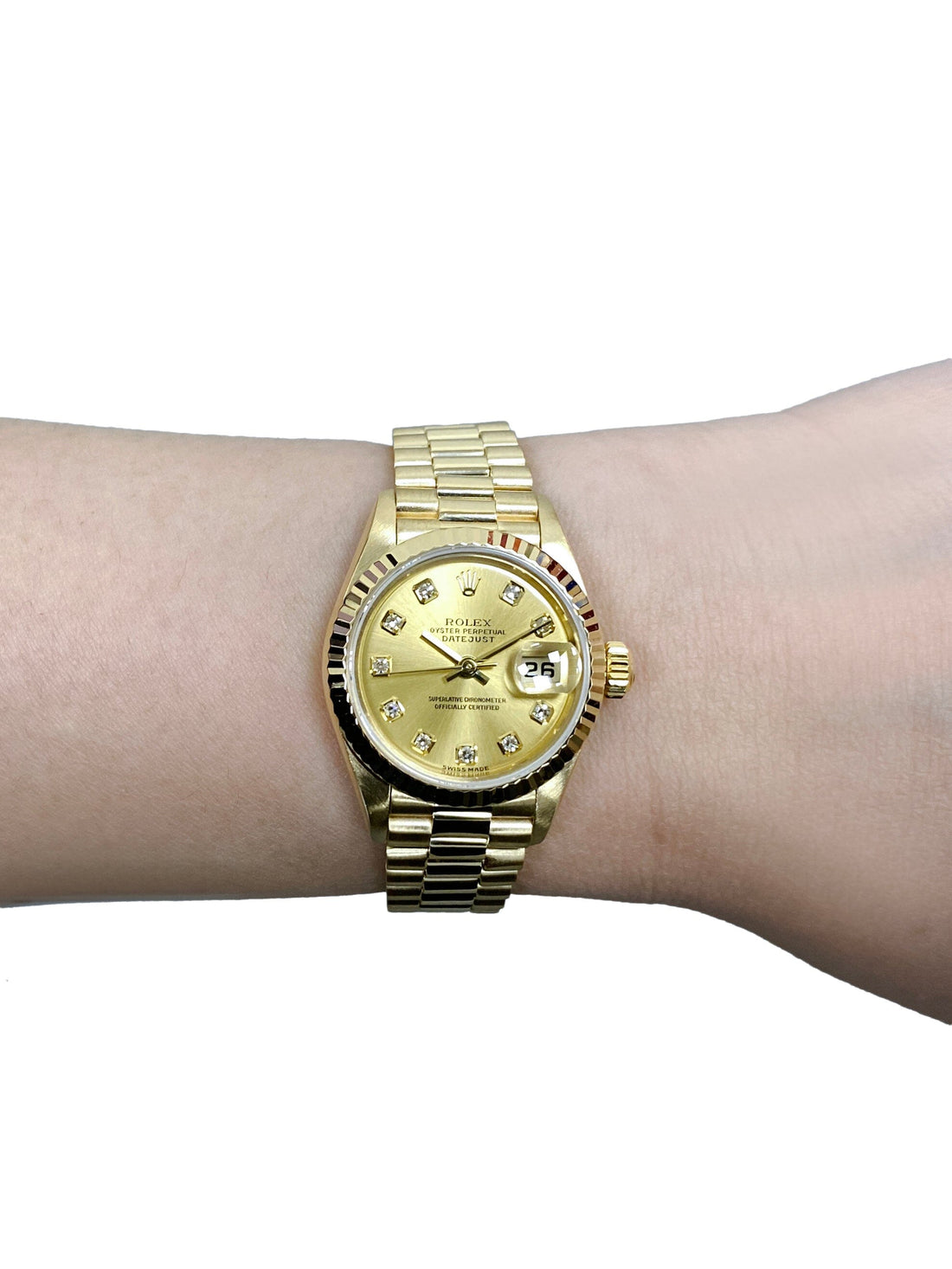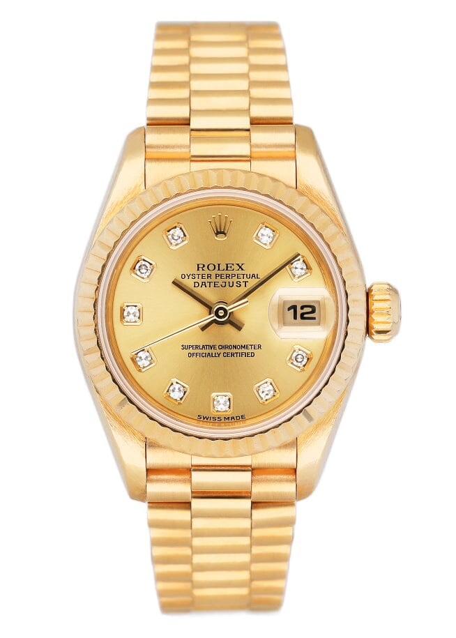 Rolex Oyster Perpetual Datejust 79178 Ladies Watch. 26mm 18K yellow gold case. 18K yellow gold fluted bezel. Champagne dial with gold hands and original factory diamond set hour markers. Minute markers on the outer dial. Date display at the 3 o'clock position. 18K yellow gold President bracelet with 18K rose gold hidden fold over clasp. Will fit up to 5.75-Inch wrist. Sapphire crystal. 18K yellow gold case back. Automatic self-winding movement. This watch comes with original Box and Papers.