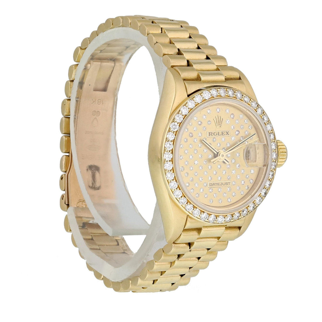 Rolex Datejust Pleiade Dial 69138 Ladies Watch. 26mm 18k Yellow Gold case. Yellow Gold None bezel. Champagne Pleiade Diamond Dial with gold hands and index hour markers. Minute markers on the outer dial. Date display at the 3 o'clock position. Yellow Gold Bracelet with Fold Over Clasp. Will fit up to a 6.75-inch wrist. Sapphire Crystal, yellow gold case back. Automatic self-winding chronometer movement. This watch is backed by our two year warranty.