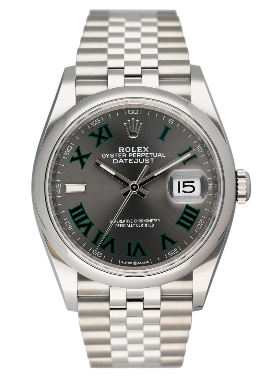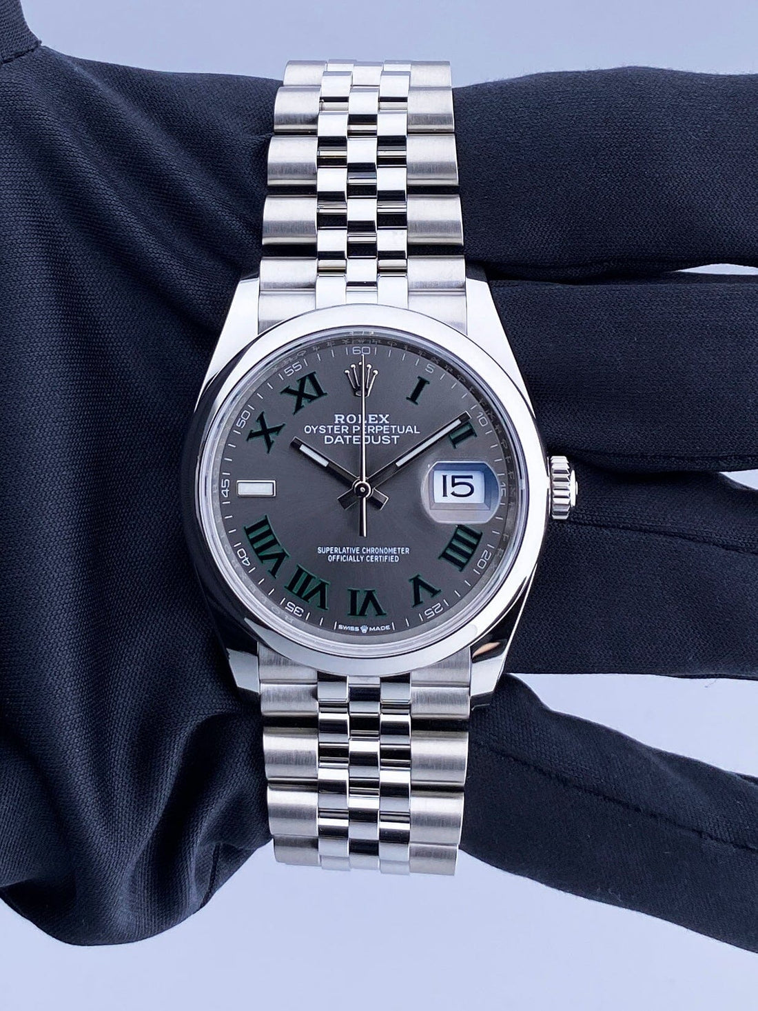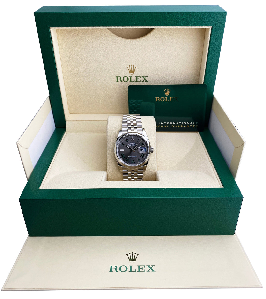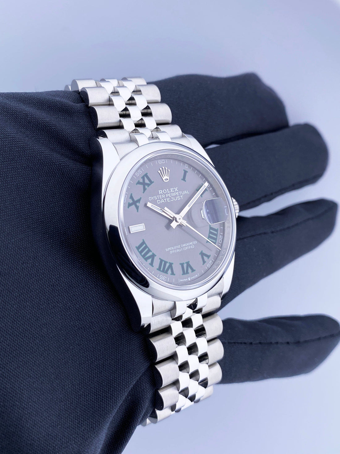 Rolex Datejust Wimbledon 126200 Mens Watch. 36mm stainless steel case. Stainless steel smooth bezel. Silver-grey dial with luminous steel hands. Roman numerals and luminous index hour marker. Date display at a 3 o'clock position. Stainless steel Jubilee bracelet with stainless steel fold over clasp. Will fit up to a 7.5-Inch wrist. Sapphire crystal. Stainless steel case back. Automatic self-winding movement. This watch comes with original Box and Papers.