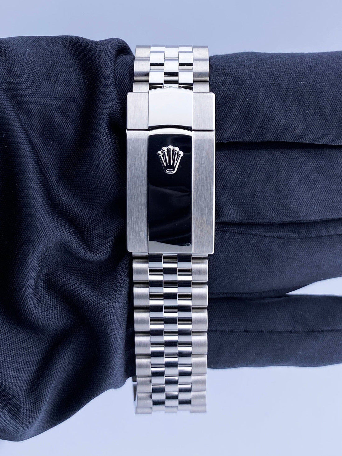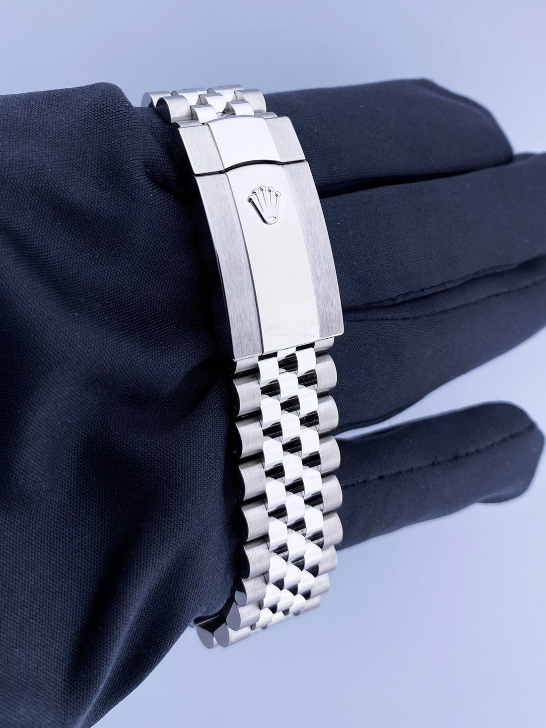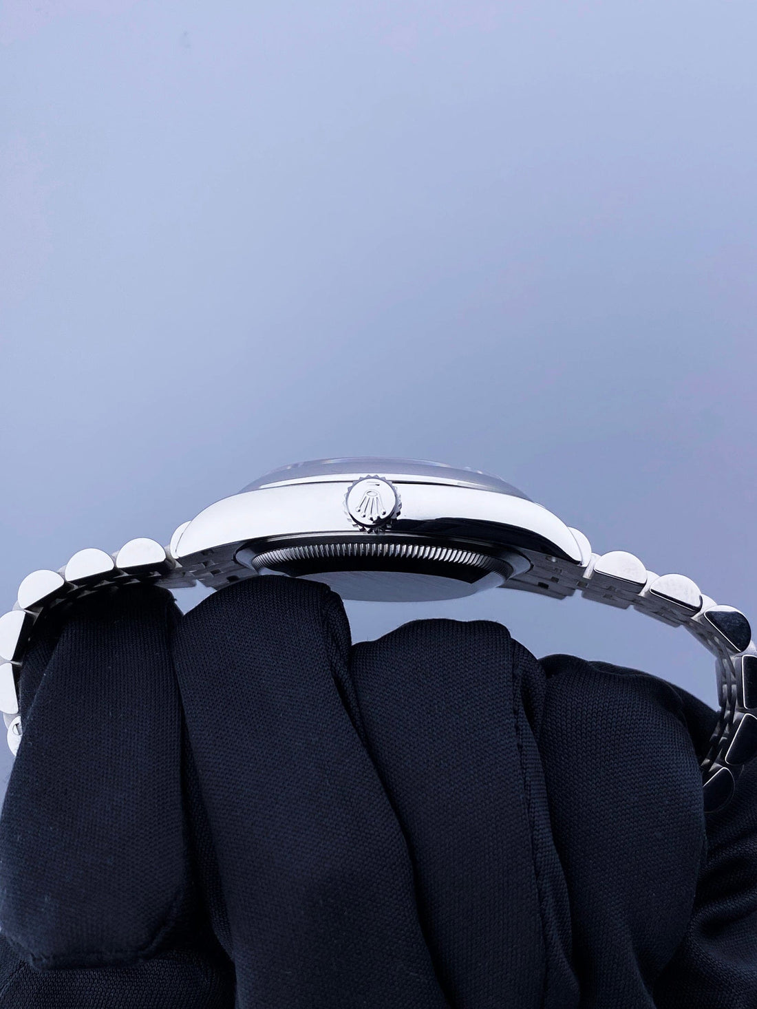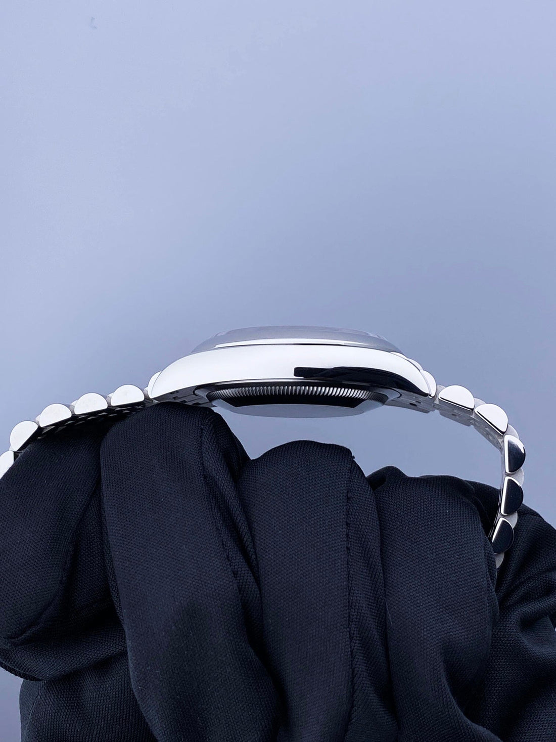 Rolex Datejust Wimbledon 126200 Mens Watch. 36mm stainless steel case. Stainless steel smooth bezel. Silver-grey dial with luminous steel hands. Roman numerals and luminous index hour marker. Date display at a 3 o'clock position. Stainless steel Jubilee bracelet with stainless steel fold over clasp. Will fit up to a 7.5-Inch wrist. Sapphire crystal. Stainless steel case back. Automatic self-winding movement. This watch comes with original Box and Papers.