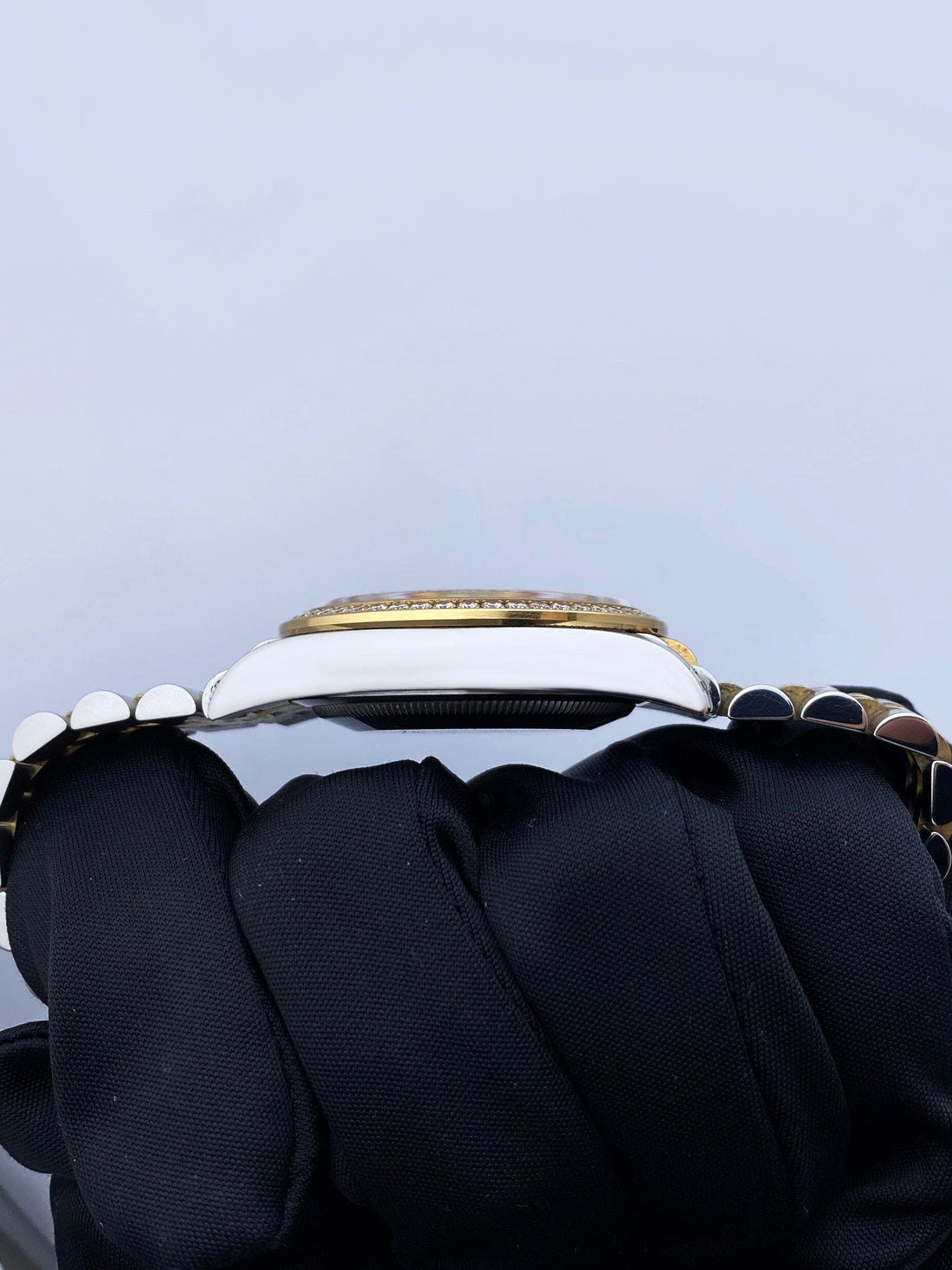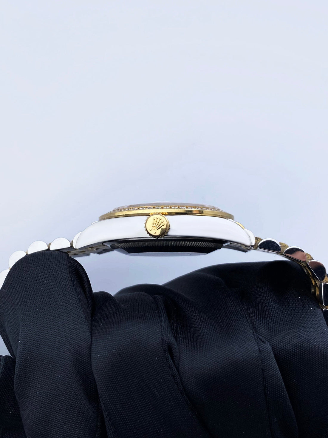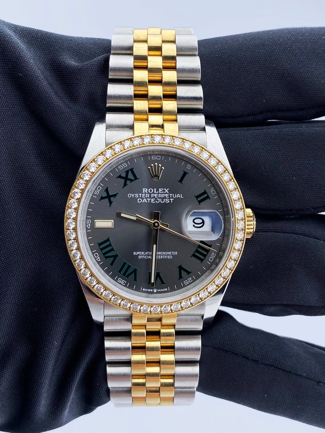 Rolex Datejust Wimbledon 126283RBR Mens Watch. 36mm stainless steel case. 18K yellow gold bezel with factory diamond set. Grey dial with yellow gold luminous hands. Roman numerals and luminous index hour marker. Date display at a 3 o'clock position. Stainless steel & 18K yellow gold Jubilee bracelet with stainless steel Fold Over Clasp. Will fit up to a 7.5-Inch wrist. Sapphire crystal and stainless steel case back. Automatic self-winding movement. This watch comes with Box and Papers.