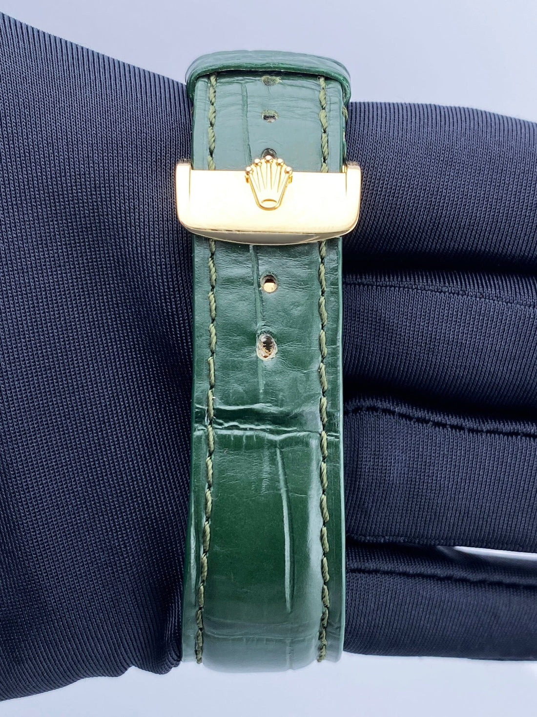 Rolex Day-Date 118138 Mens Watch. 36mm 18k yellow gold case. 18K yellow gold fluted bezel. Green dial with gold hands and index hour markers. Minute markers on the outer dial. Date display at the 3 o'clock position and day display at the 12 o'clock position. Green leather strap with 18K yellow gold deployment buckle. Will fit up to a 7.5-inch wrist. Sapphire crystal. 18K yellow gold case back. Automatic self-winding chronometer movement.