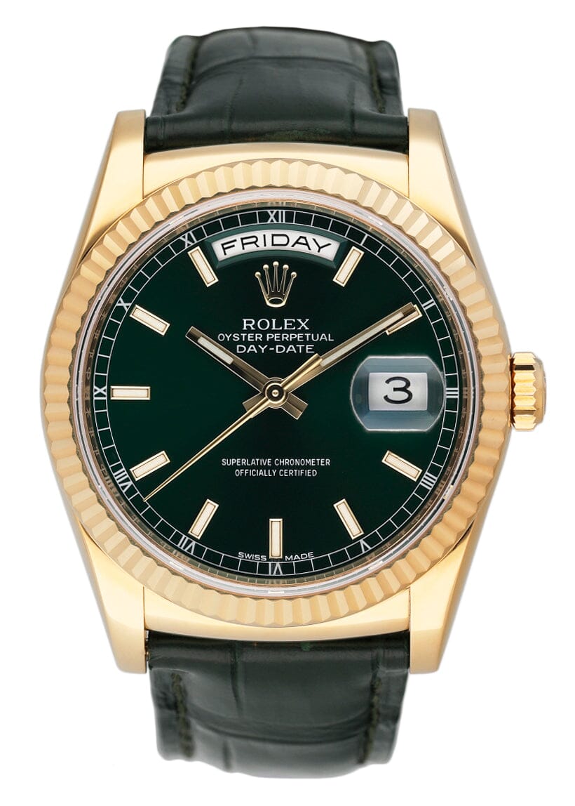 Rolex Day-Date 118138 Mens Watch. 36mm 18k yellow gold case. 18K yellow gold fluted bezel. Green dial with gold hands and index hour markers. Minute markers on the outer dial. Date display at the 3 o'clock position and day display at the 12 o'clock position. Green leather strap with 18K yellow gold deployment buckle. Will fit up to a 7.5-inch wrist. Sapphire crystal. 18K yellow gold case back. Automatic self-winding chronometer movement. This watch comes with original Box and Papers.