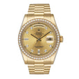 Rolex Day-Date 118348 Mens Watch. 36mm 18K yellow gold case. 18K yellow gold fluted bezel with factory diamond. Champagne dial with gold hands and factory diamond hour markers. The date is displayed at the 3 o'clock position and day display at the 12 o'clock position. 18K yellow gold President bracelet with hidden fold over clasp. Will fit up to a 6.75-inch wrist. Sapphire crystal. 18K yellow gold case back. Automatic self-winding chronometer movement. This watch comes with original Box and Papers.