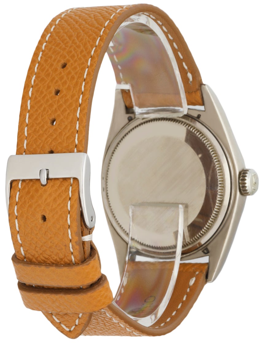 Rolex Day-Date 1803 men's watch 36mm 18k white gold case with 18K white gold fluted bezel. Silver dial with luminous hands and index hour markers. Minute markers on the outer dial. Date display at the 3 o'clock position. Day display at the 12 o'clock position. Brown leather after market strap with sliver tone buckle. Will fit up to a 7.25-inch wrist. Acrylic Crystal and 18K white gold case back. Automatic self-winding chronometer movement. Circa: 1967