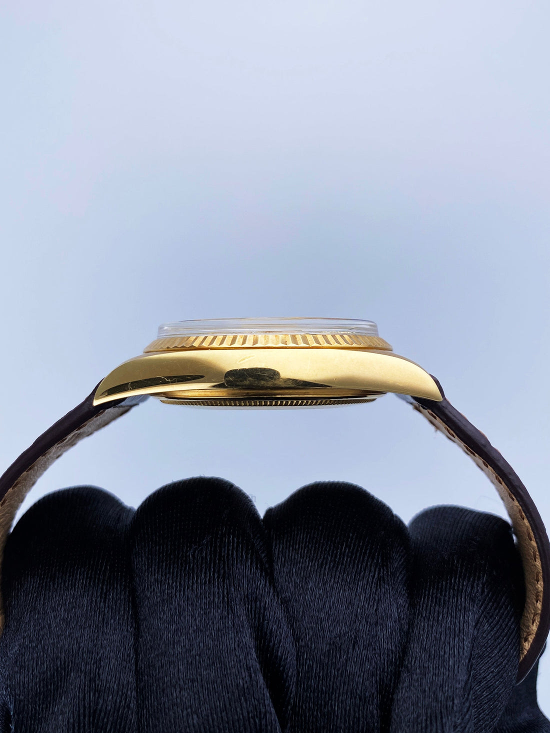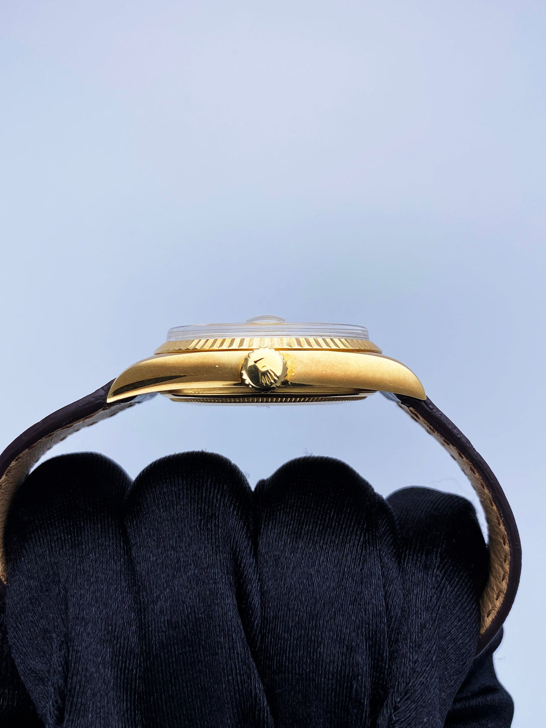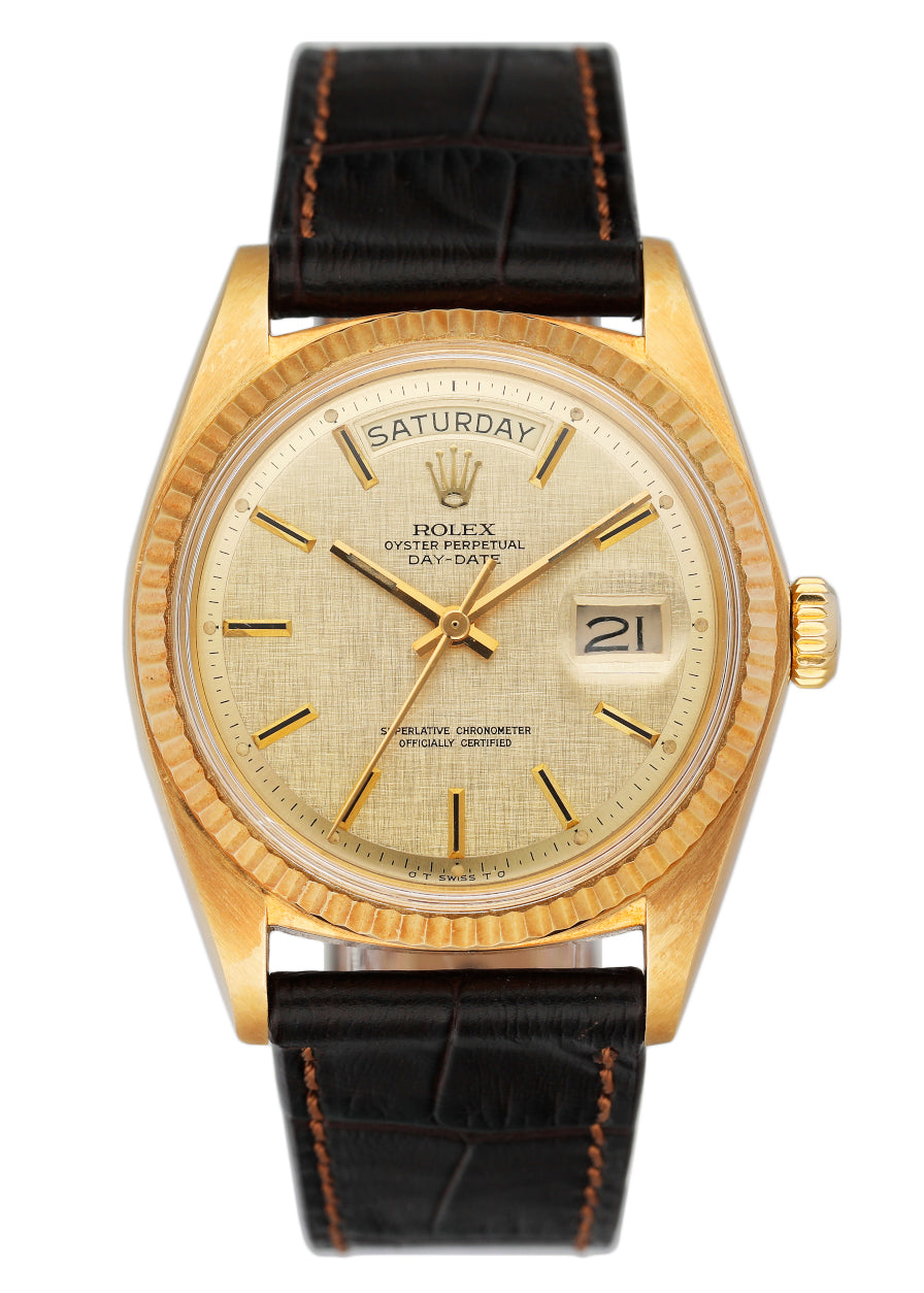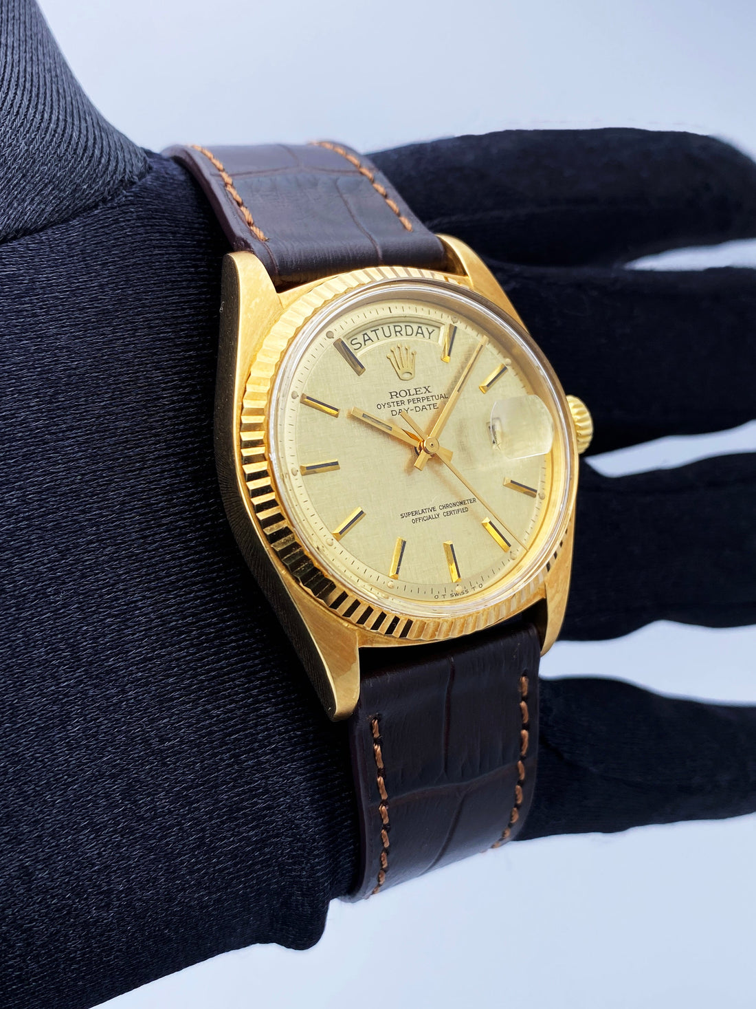 Rolex Day-Date 1803 Mens Watch. 36mm 18k yellow gold case with 18K yellow gold fluted bezel. Champagne linen dial with gold hands and index hour markers. Minute markers on the outer dial. Date display at the 3 o'clock position and day display at the 12 o'clock position. Brown aftermarket leather strap with buckle. Will fit up to a 7-inch wrist. Acrylic crystal. 18K yellow gold case back. Automatic self-winding chronometer movement. Circa: 1973.