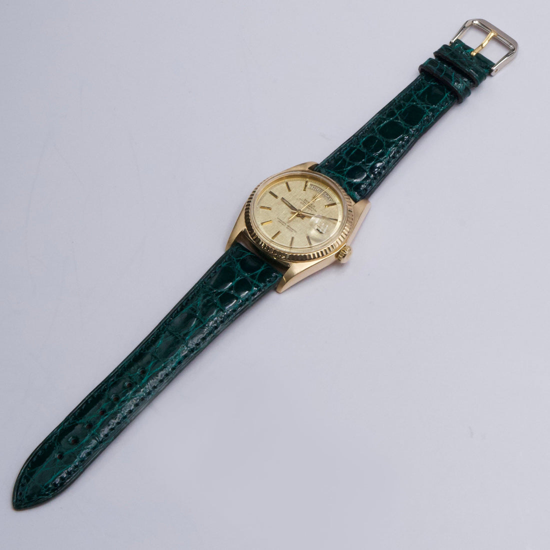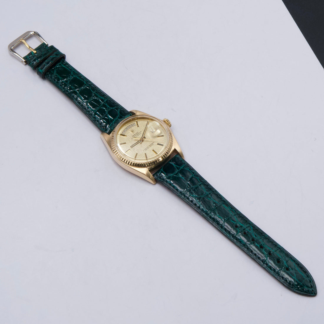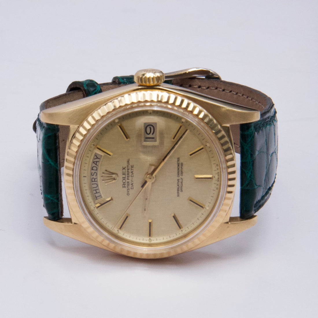 Rolex Day-Date 1803 Mens Watch. 36mm 18k yellow gold case. 18K yellow gold fluted bezel. Champagne satin dial with gold hands and index hour markers. Minute markers on the outer dial. Date display at the 3 o'clock position and day display at the 12 o'clock position. Green aftermarket leather strap with buckle. Will fit up to a 7-inch wrist. Acrylic crystal. 18K yellow gold case back. Automatic self-winding chronometer movement.