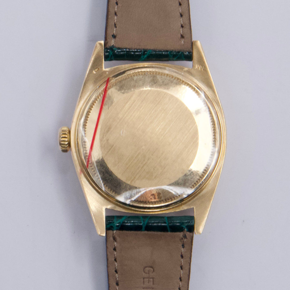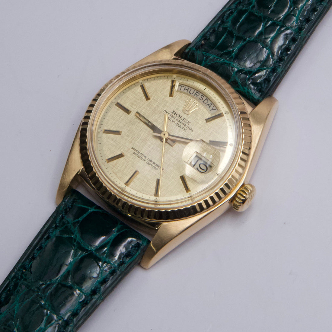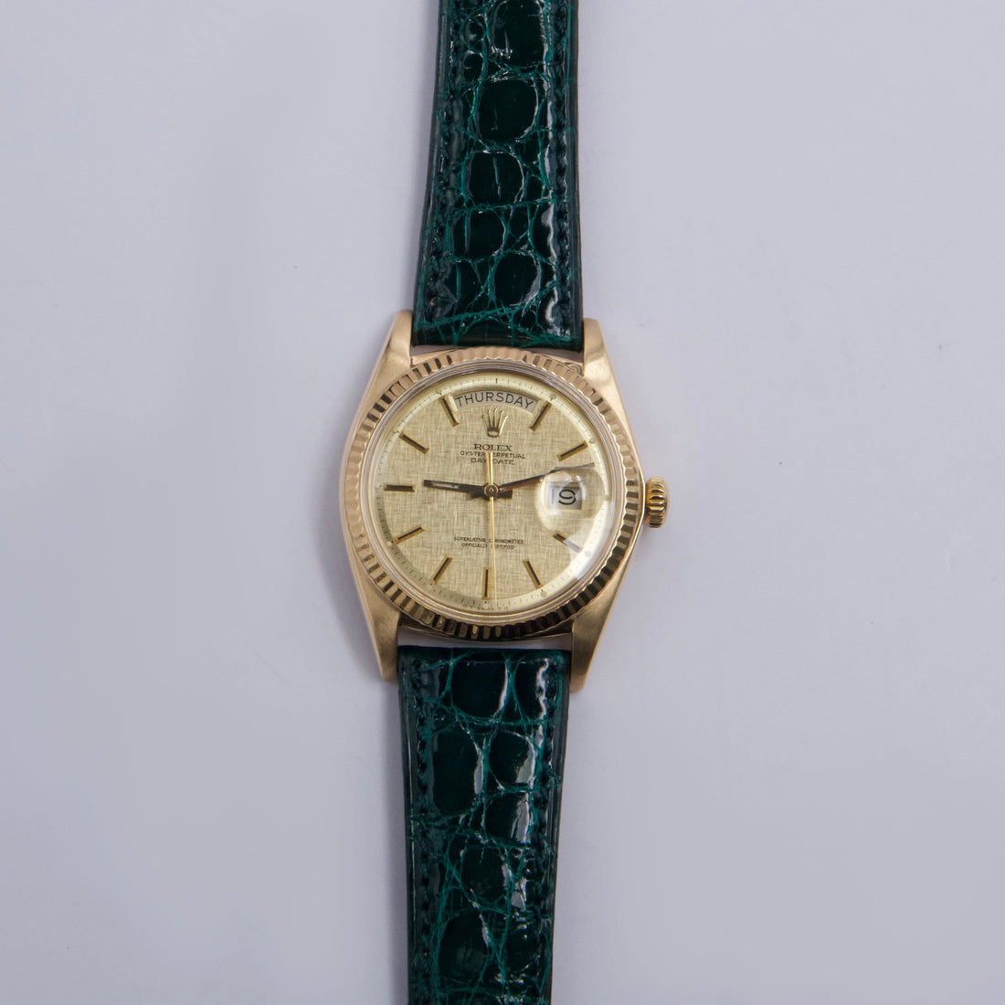 Rolex Day-Date 1803 Mens Watch. 36mm 18k yellow gold case. 18K yellow gold fluted bezel. Champagne satin dial with gold hands and index hour markers. Minute markers on the outer dial. Date display at the 3 o'clock position and day display at the 12 o'clock position. Green aftermarket leather strap with buckle. Will fit up to a 7-inch wrist. Acrylic crystal. 18K yellow gold case back. Automatic self-winding chronometer movement.