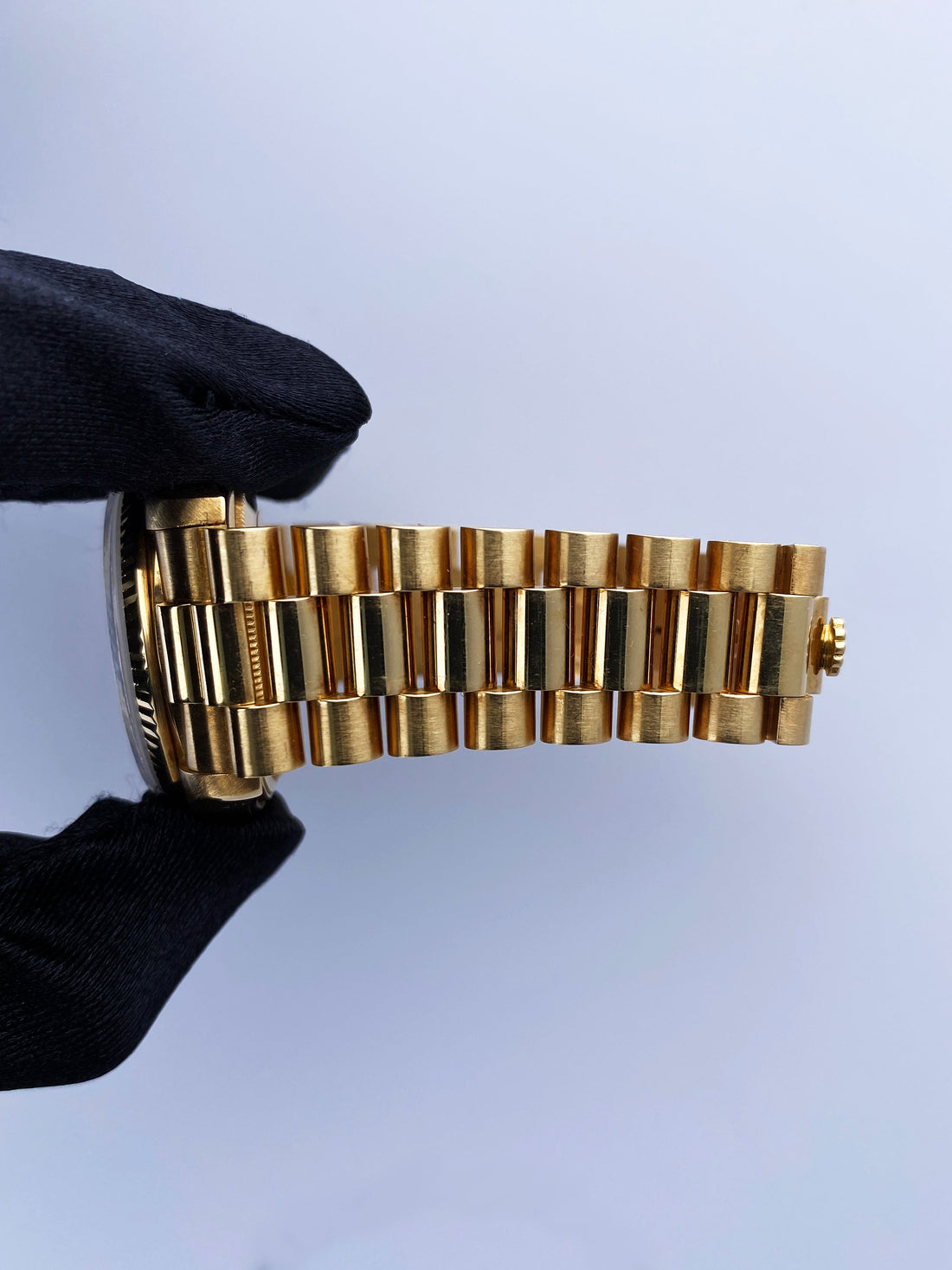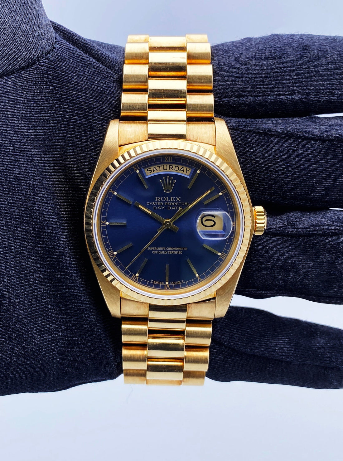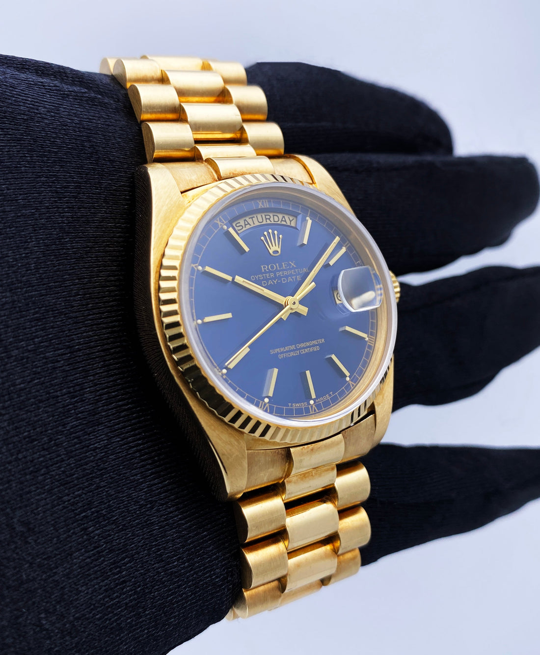 Rolex Day-Date 18038 Mens Watch. 36mm 18K yellow gold case with 18K yellow gold fluted bezel. Blue dial with gold hands and index hour markers. Minute markers on the outer dial. Date display at the 3 o'clock position and day display at the 12 o'clock position. 18K yellow gold President bracelet with hidden fold over clasp. Will fit up to a 6.25-inch wrist. Sapphire crystal. 18K yellow gold case back. Automatic self-winding chronometer movement.