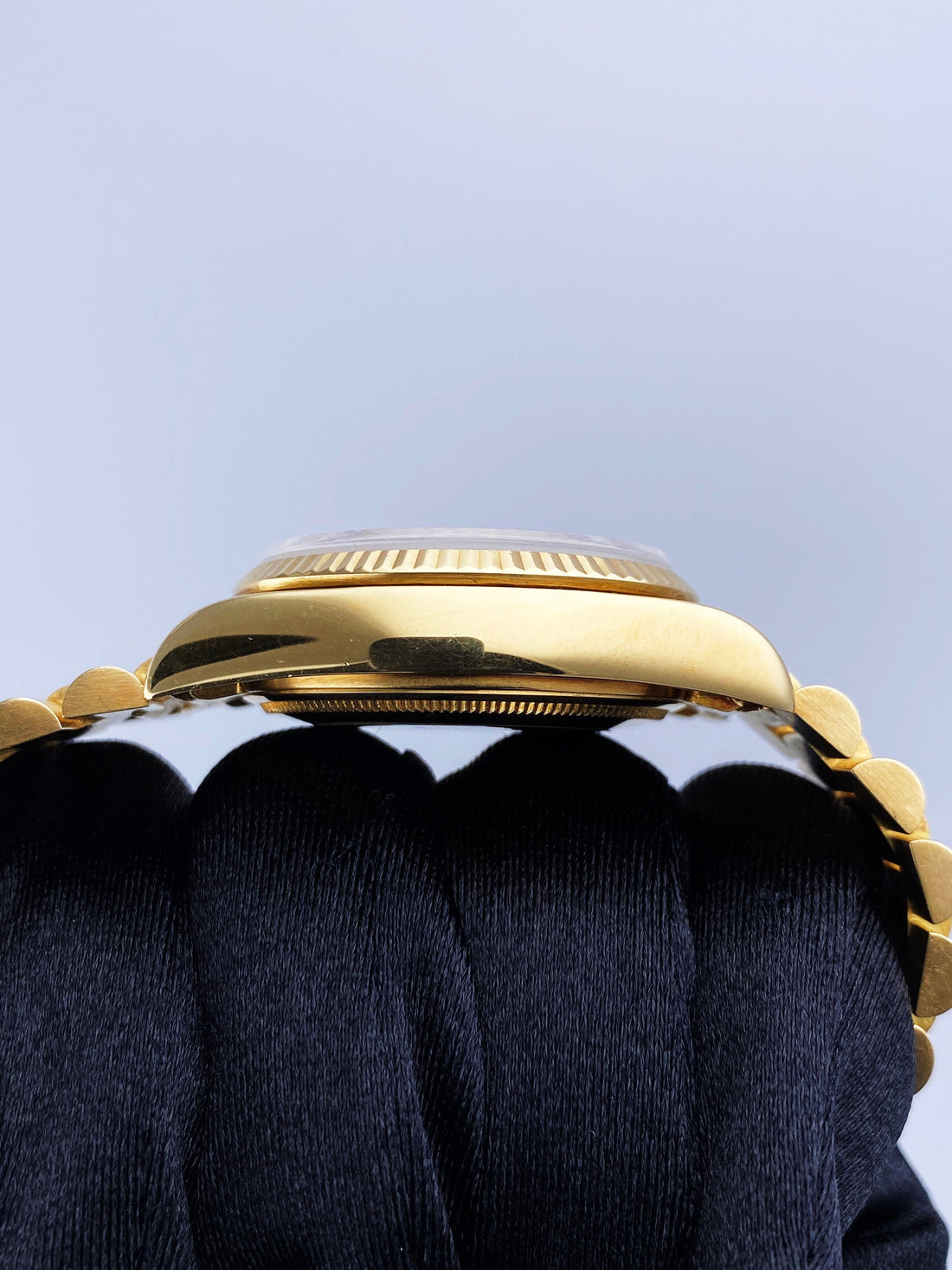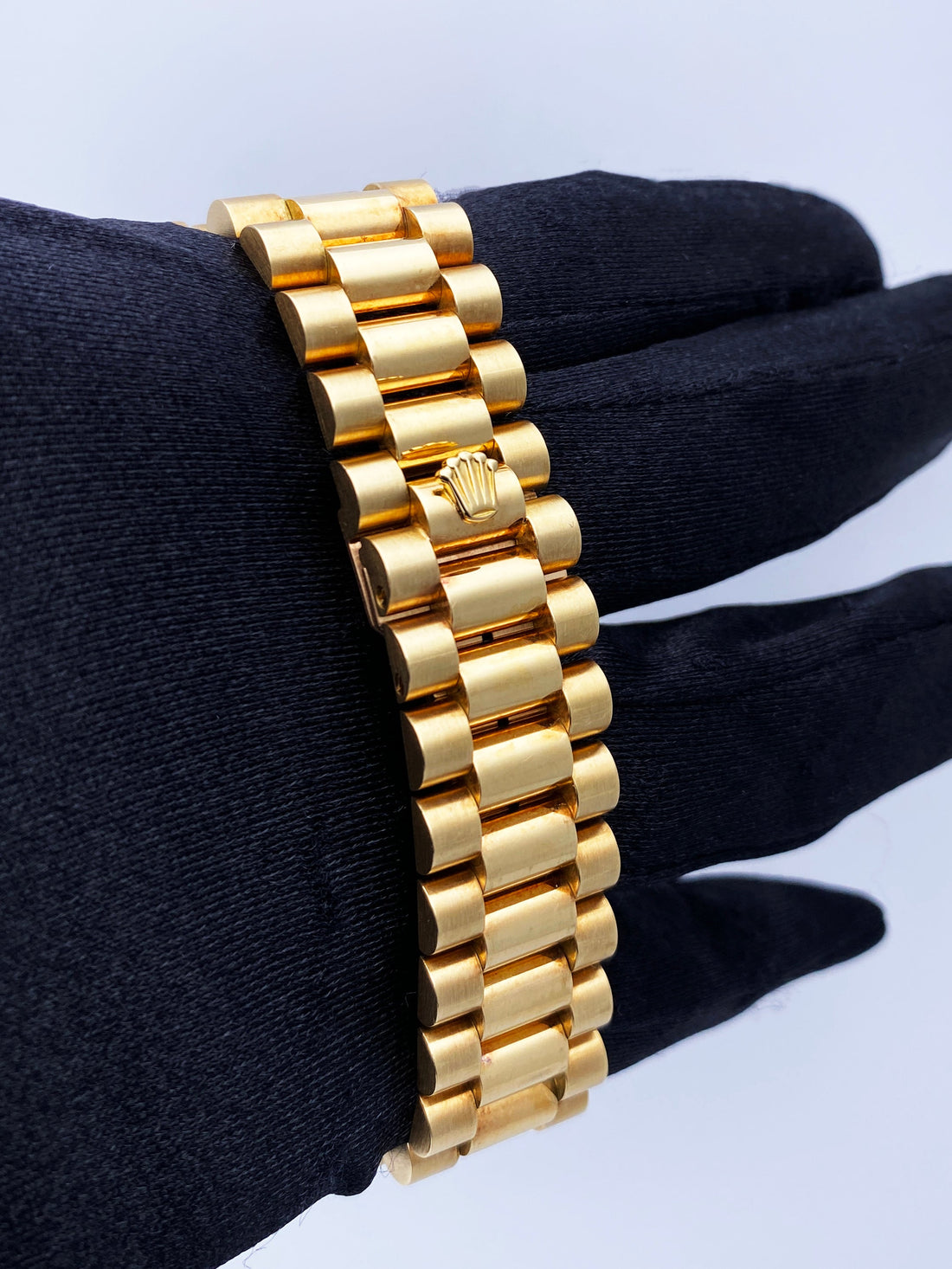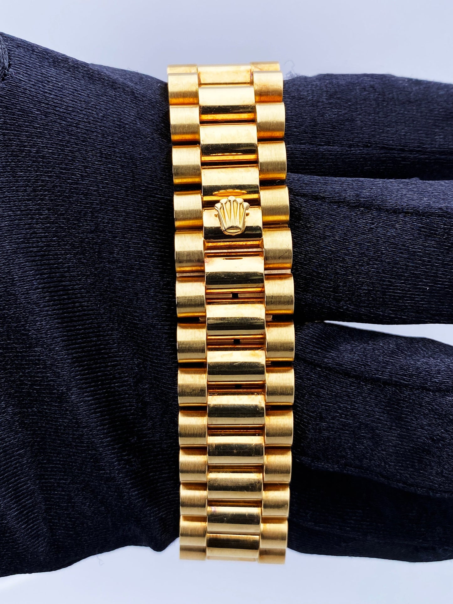 Rolex Day-Date 18038 Mens Watch. 36mm 18K yellow gold case with 18K yellow gold fluted bezel. Blue dial with gold hands and index hour markers. Minute markers on the outer dial. Date display at the 3 o'clock position and day display at the 12 o'clock position. 18K yellow gold President bracelet with hidden fold over clasp. Will fit up to a 6.25-inch wrist. Sapphire crystal. 18K yellow gold case back. Automatic self-winding chronometer movement.