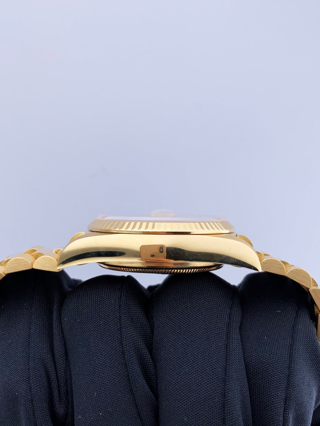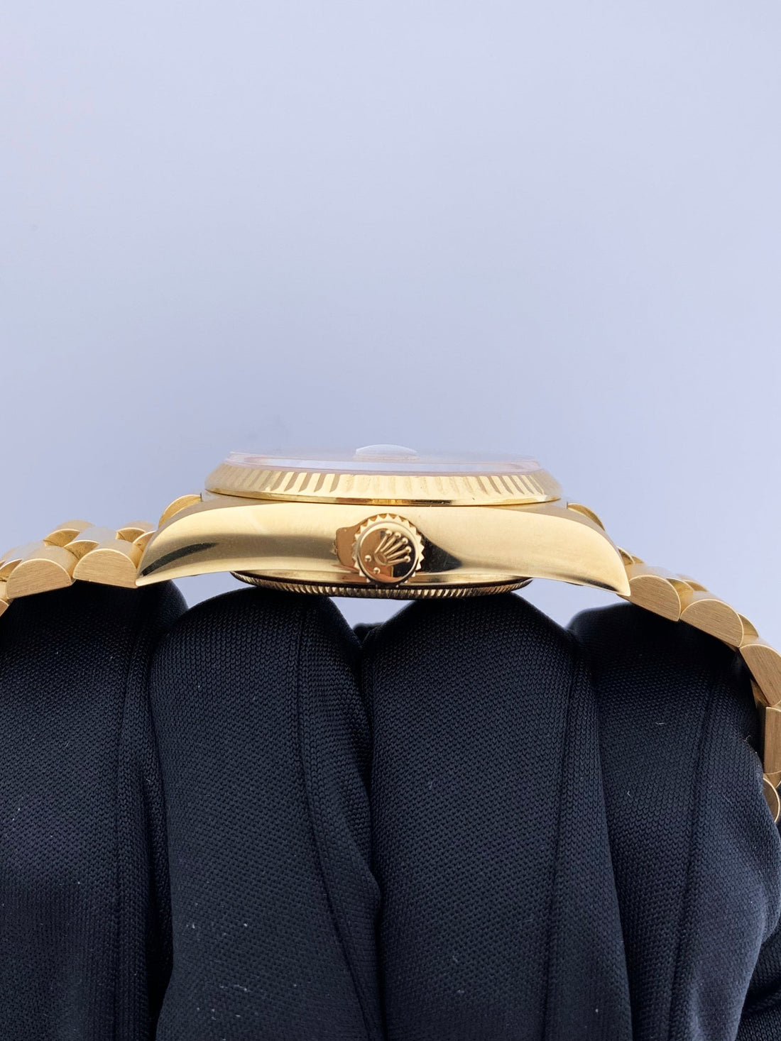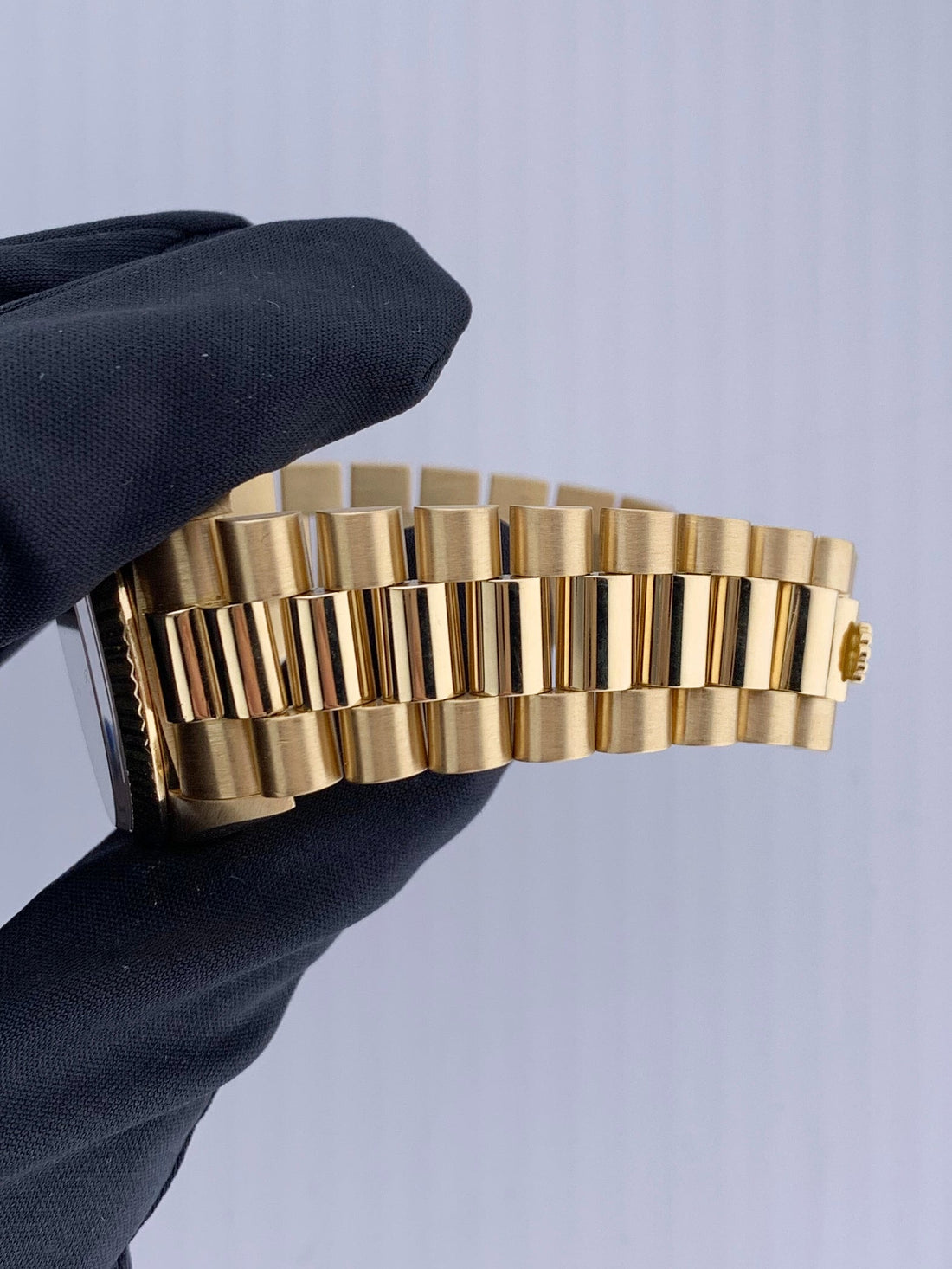 Rolex Day-Date 18038 Men's Watch. 36mm 18k Yellow gold case with 18k yellow gold fluted bezel. Champagne tapestry dial with gold hands and index hour markers. Date display at the 3 o'clock position. Day display at the 12 o'clock position. 18k Yellow Gold President bracelet with hidden Fold Over Clasp. Will fit up to a 6.75-inch wrist. Sapphire Crystal. 18K yellow gold case back. Automatic self-winding chronometer movement. This will come with Box and Papers.