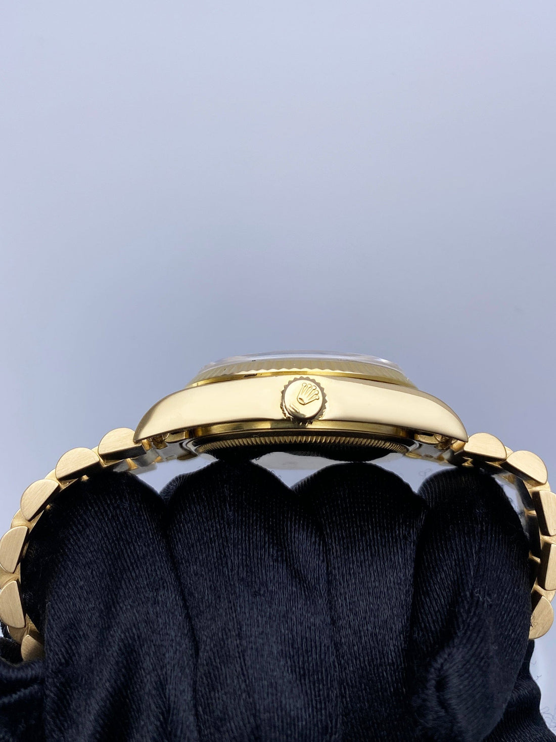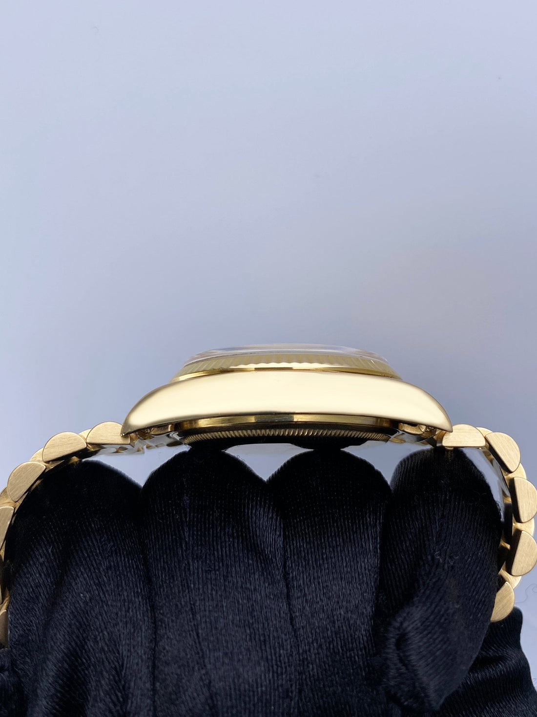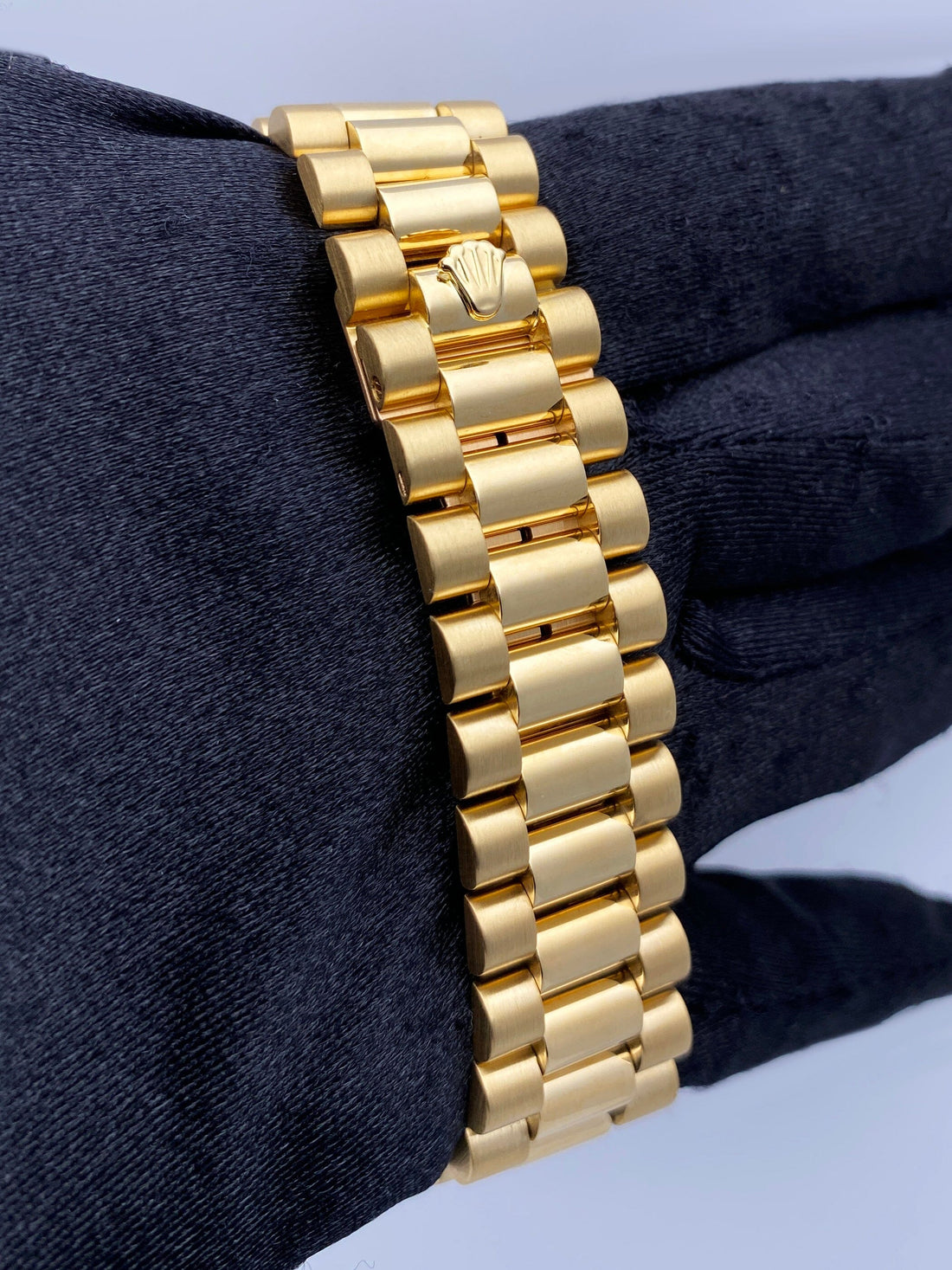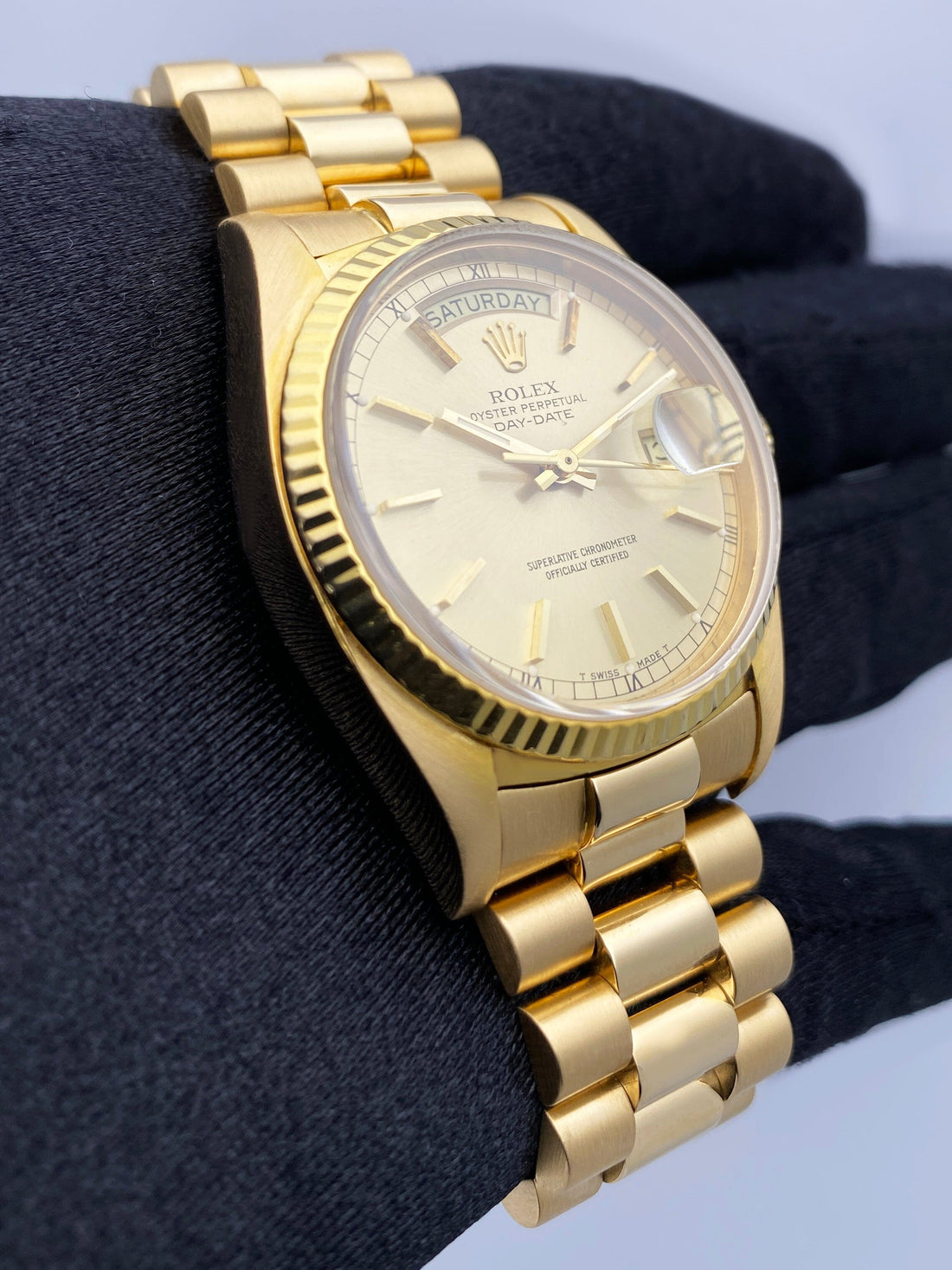 Rolex Day-Date 18038 Mens Watch. 36mm 18K yellow gold case with 18K yellow gold fluted bezel. Champagne dial with gold hands and index hour markers. Minute markers on the outer dial. Date display at the 3 o'clock position and day display at the 12 o'clock position. 18K yellow gold president bracelet with hidden fold over clasp. Will fit up to a 6.5-inch wrist. Sapphire Crystal. 18K yellow gold case back. Automatic self-winding chronometer movement. This watch comes with original Box and Papers.