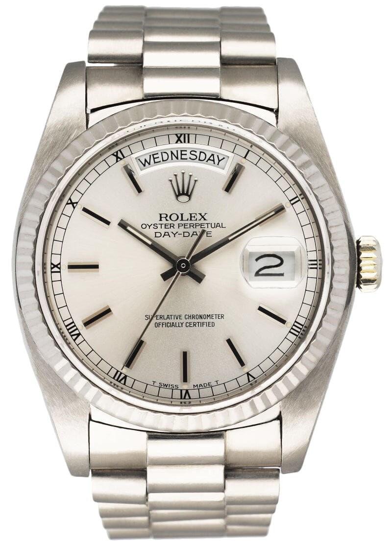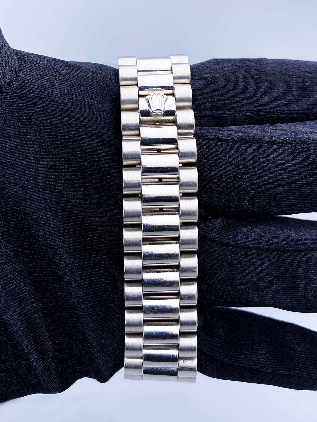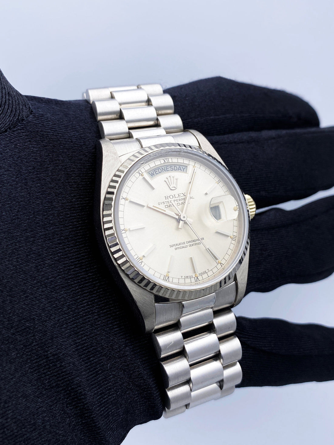 Rolex Day-Date 18039 Mens Watch. 36mm 18K white gold case with 18K white gold fluted bezel. Silver dial with luminous hands and index hour marker. Minute markers on the outer dial. Date display at the 3 o'clock position. Day display at 12 o'clock position. 18K white gold President bracelet with hidden fold over clasp. Will fit up to a 7-inch wrist. Sapphire crystal. 18K white gold case back. Automatic self-winding movement.