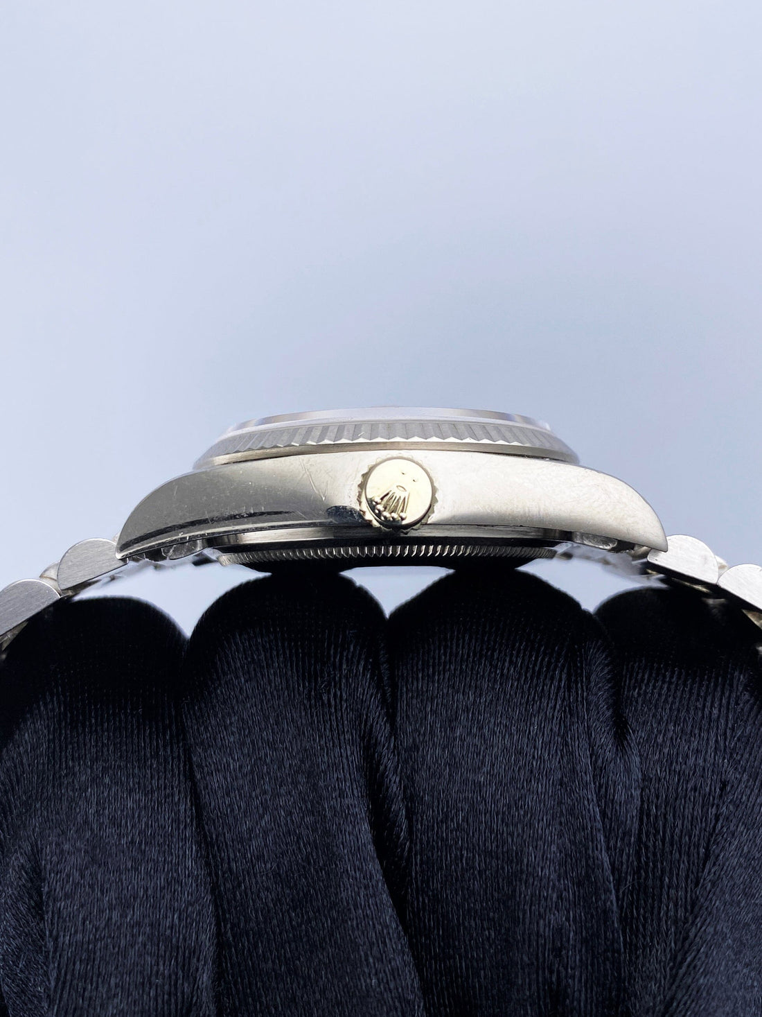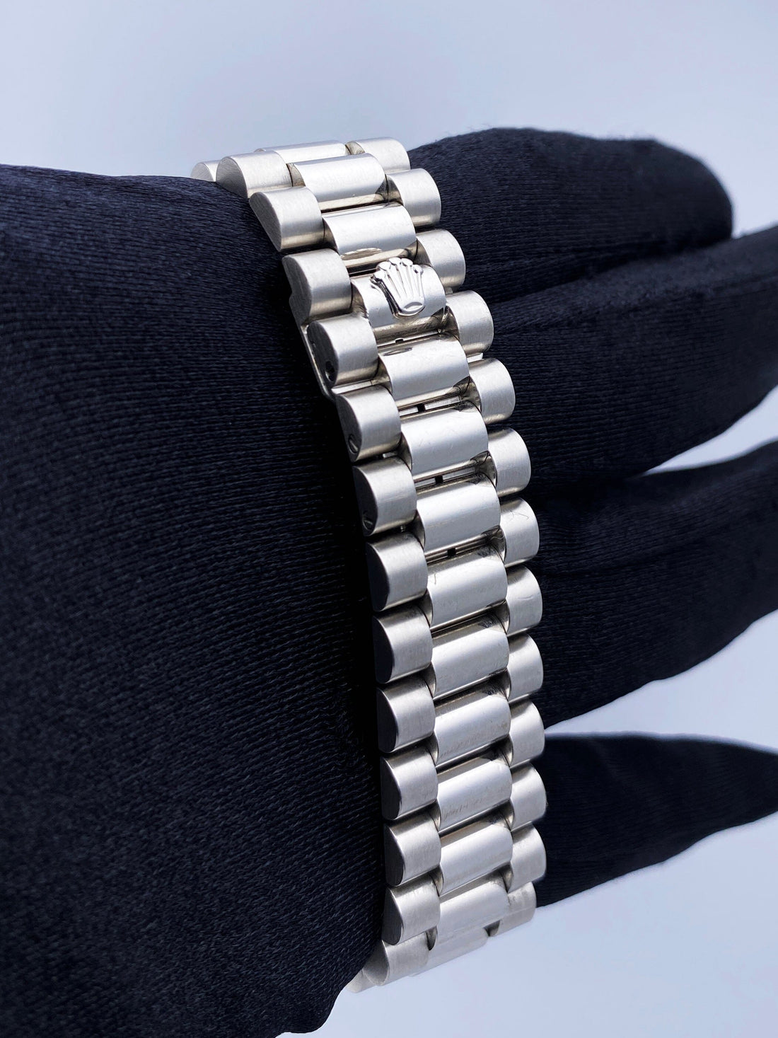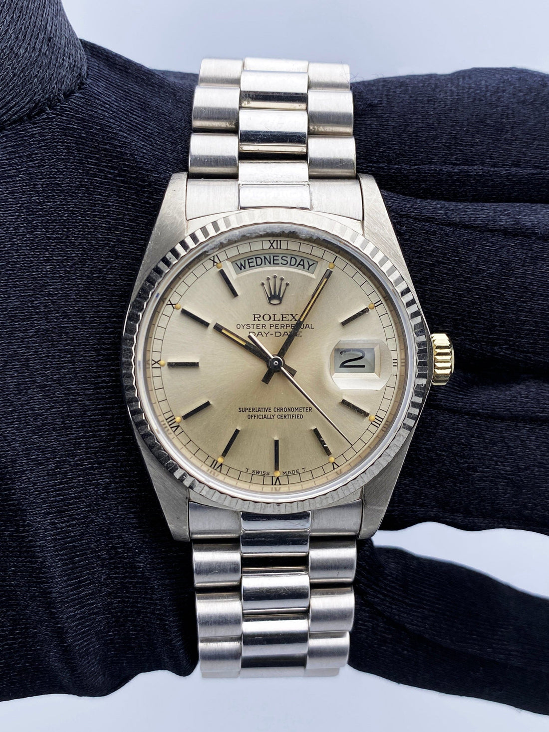Rolex Day-Date 18039 Mens Watch. 36mm 18K white gold case with 18K white gold fluted bezel. Silver dial with luminous hands and index hour marker. Minute markers on the outer dial. Date display at the 3 o'clock position. Day display at 12 o'clock position. 18K white gold President bracelet with hidden fold over clasp. Will fit up to a 7-inch wrist. Sapphire crystal. 18K white gold case back. Automatic self-winding movement.