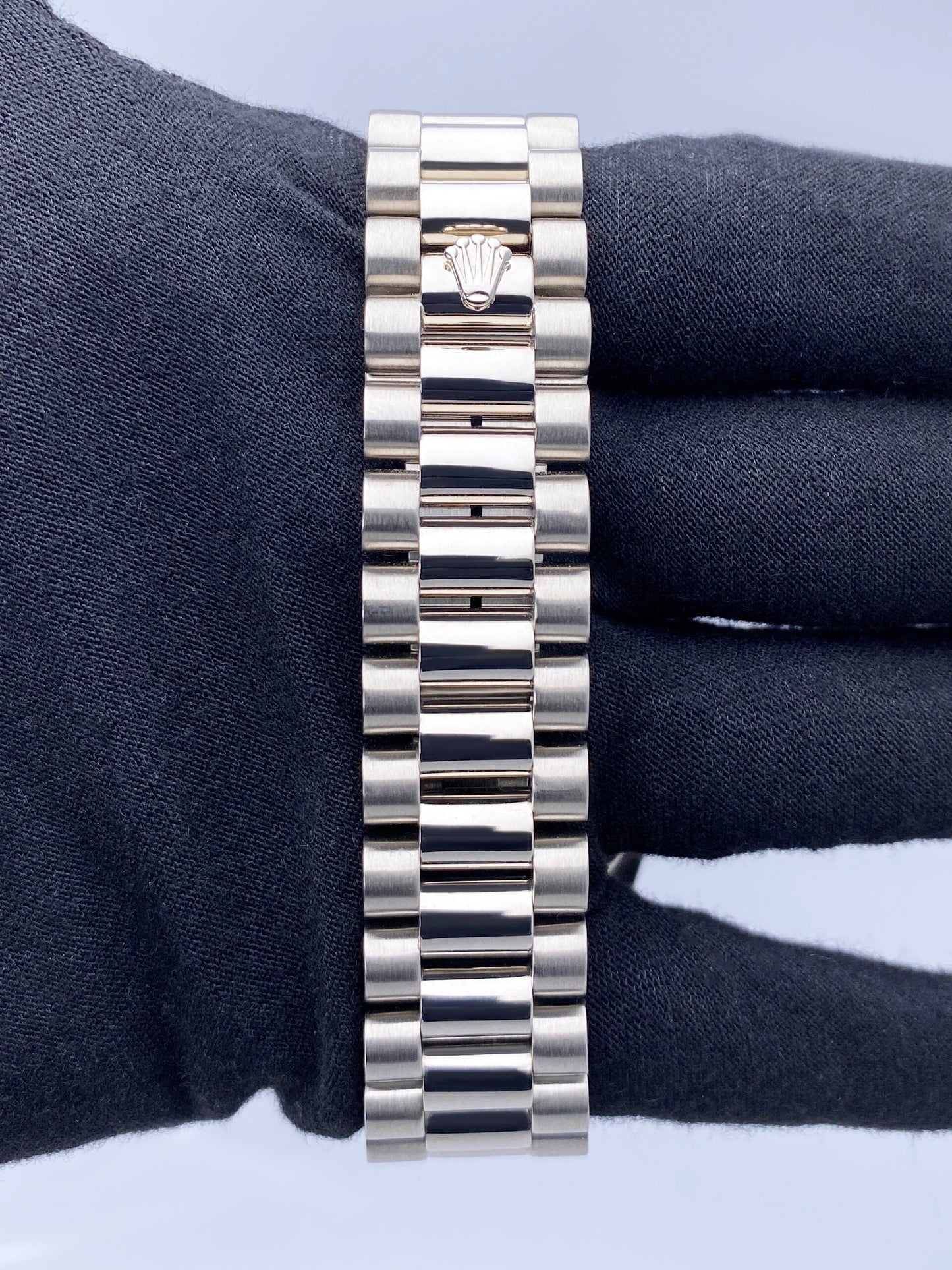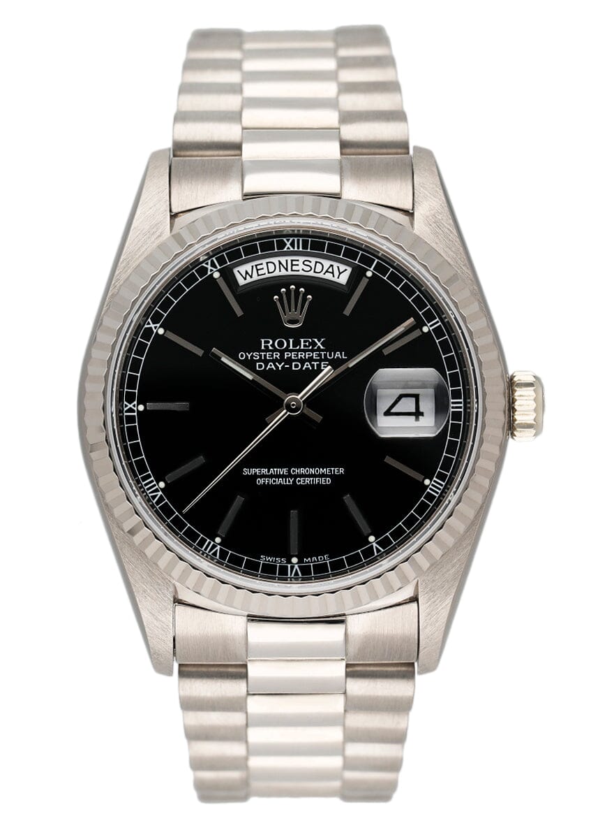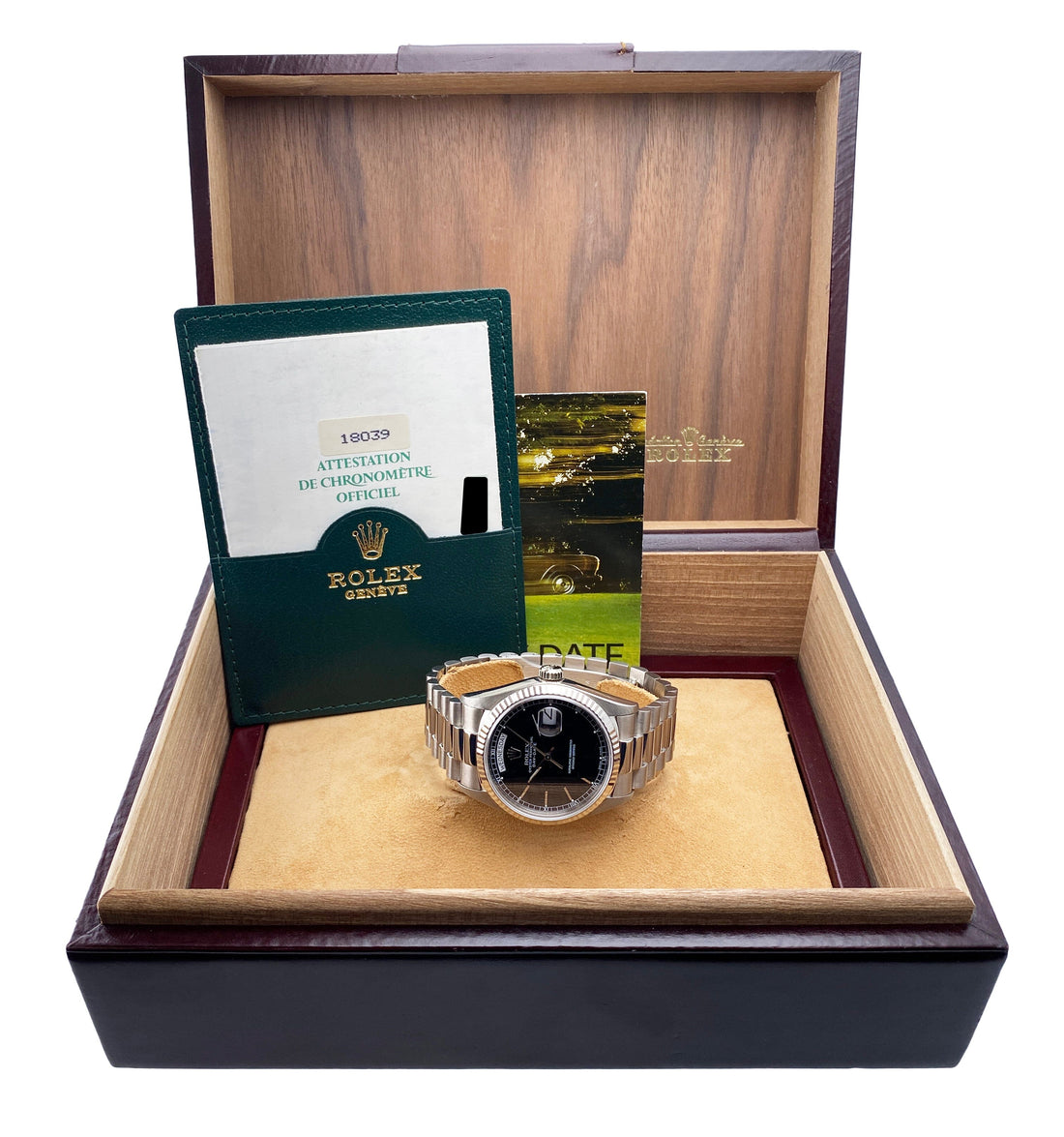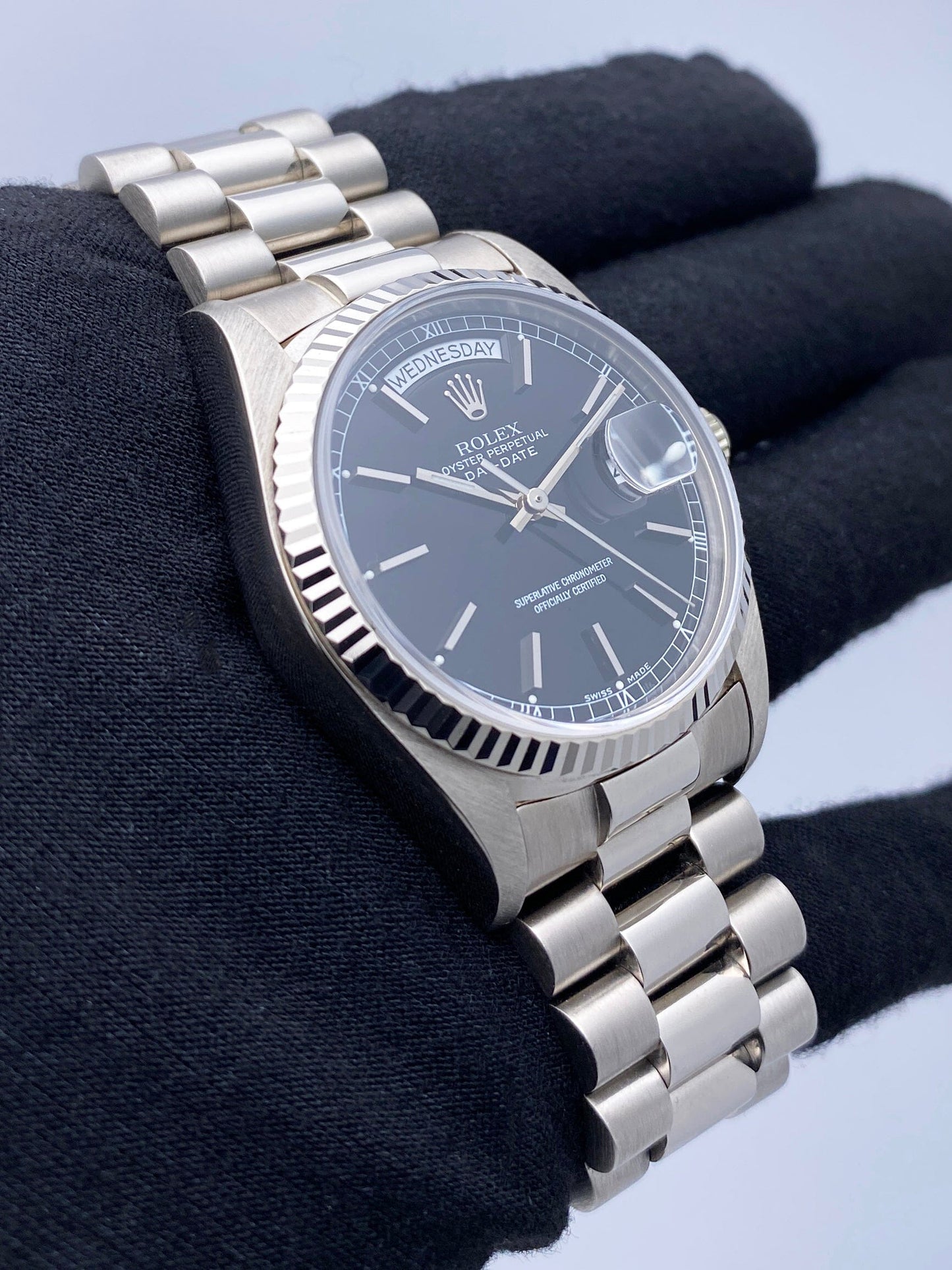 Rolex Day-Date 18039 Mens Watch. 36mm 18K white gold case with 18K white gold fluted bezel. Black dial with luminous hands and index hour marker. Minute markers on the outer dial. Date display at the 3 o'clock position. Day display at 12 o'clock position. 18K white gold President bracelet with 18K white gold hidden fold over clasp. Will fit up to a 6.5-inch wrist. Sapphire crystal. 18K white gold case back. Automatic self-winding movement. This watch comes with original Box and Papers.
