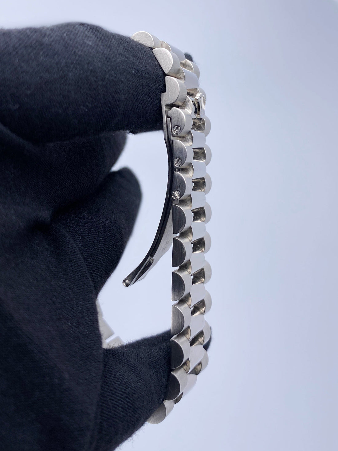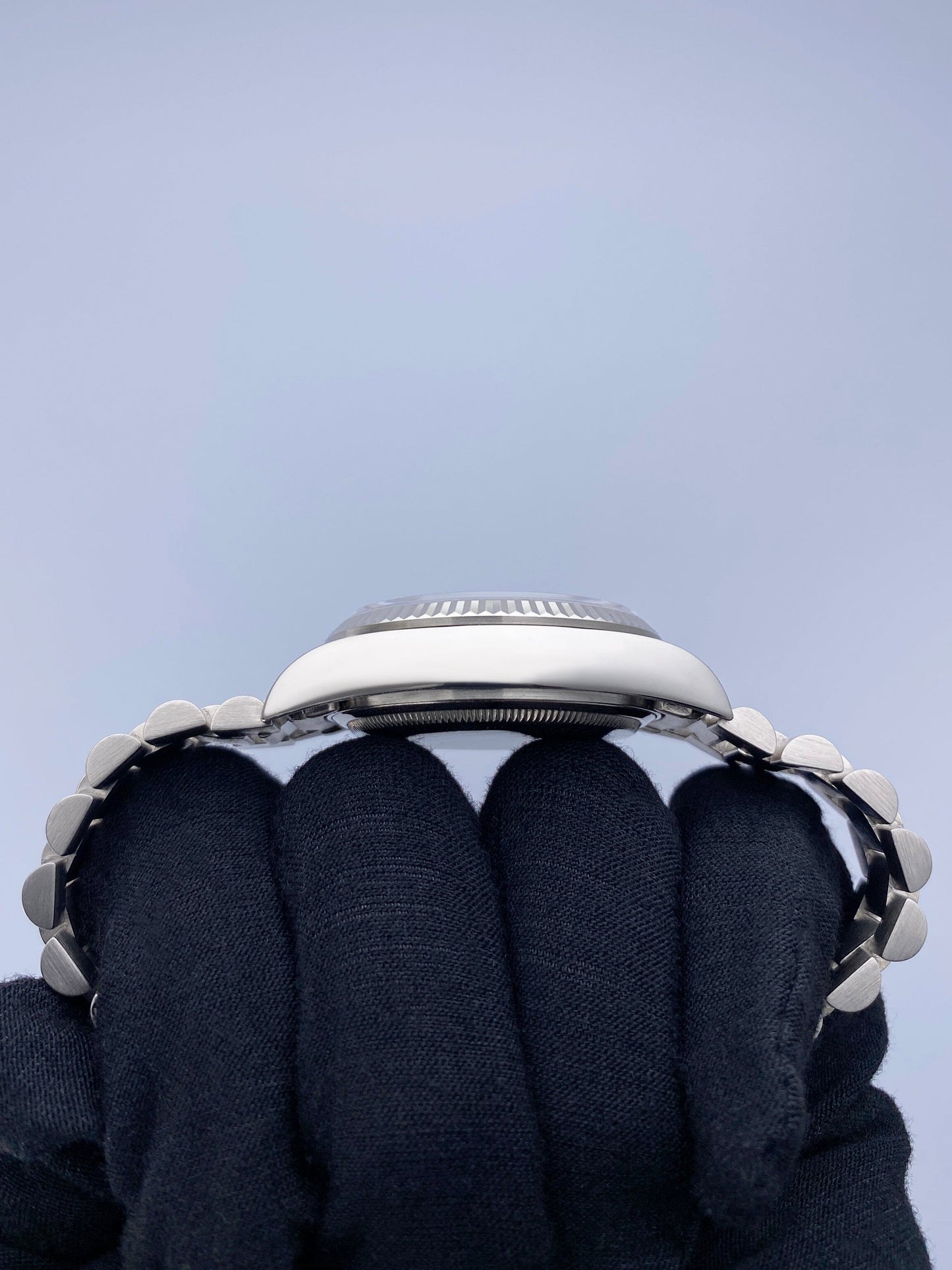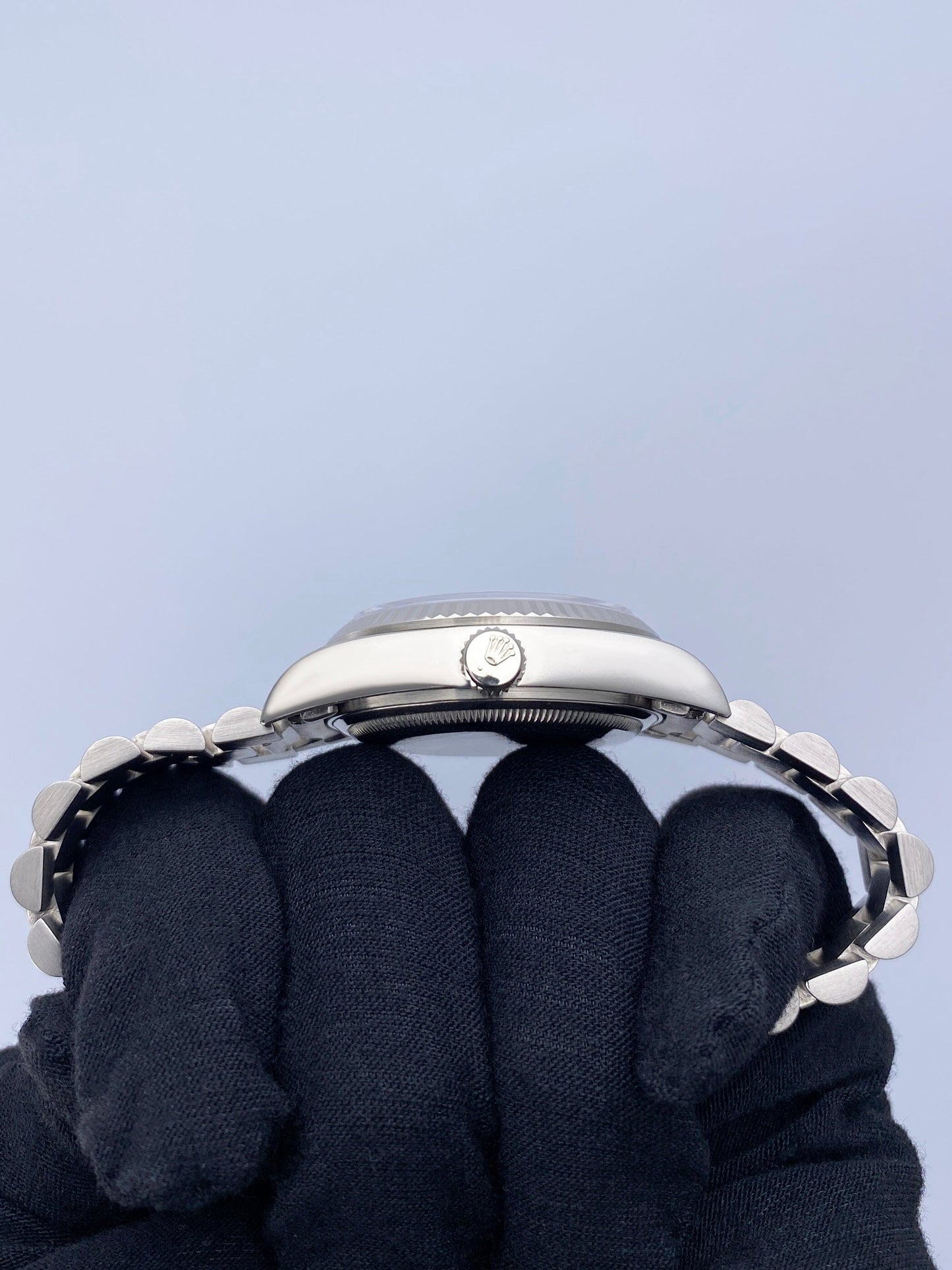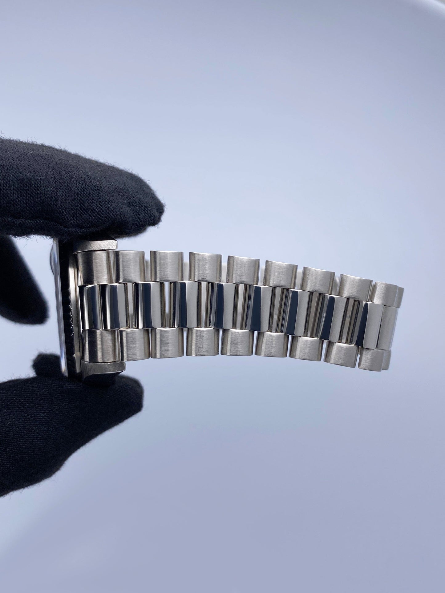 Rolex Day-Date 18039 Mens Watch. 36mm 18K white gold case with 18K white gold fluted bezel. Black dial with luminous hands and index hour marker. Minute markers on the outer dial. Date display at the 3 o'clock position. Day display at 12 o'clock position. 18K white gold President bracelet with 18K white gold hidden fold over clasp. Will fit up to a 6.5-inch wrist. Sapphire crystal. 18K white gold case back. Automatic self-winding movement. This watch comes with original Box and Papers.