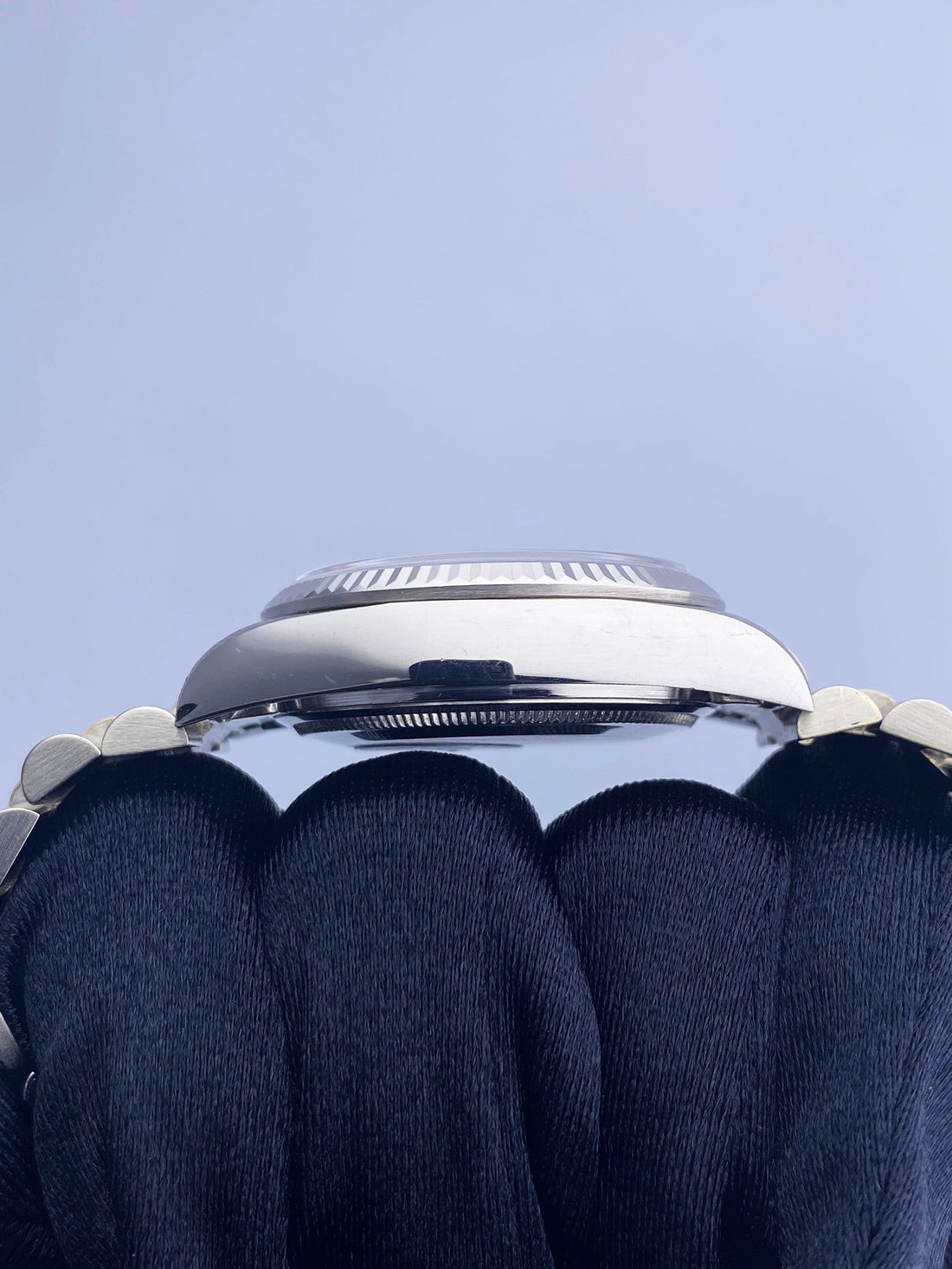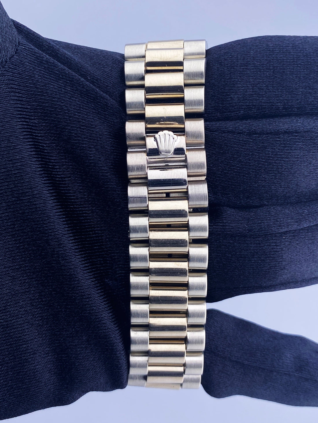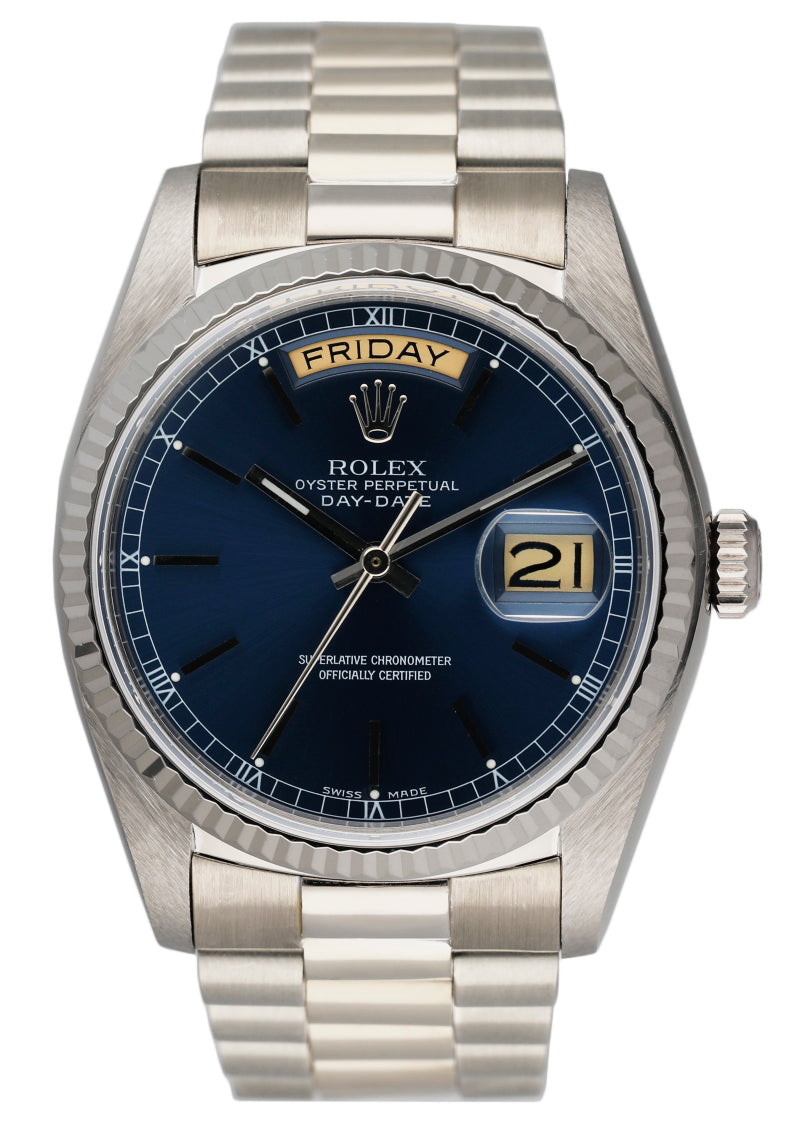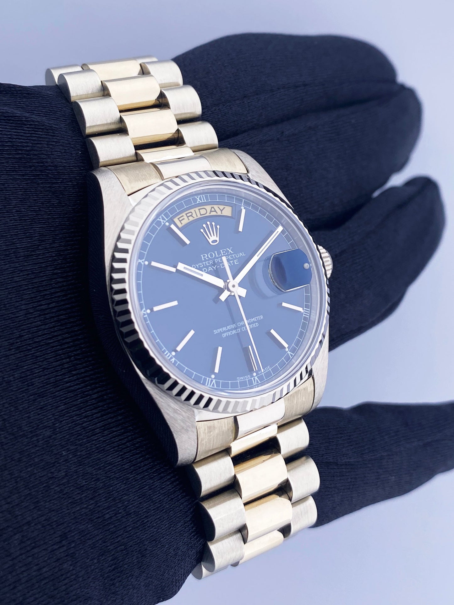 Rolex Day-Date 18039 Mens Watch. 36mm 18K white gold case with 18K white gold fluted bezel. Blue dial with luminous hands and index hour marker. Minute markers on the outer dial. Date display at the 3 o'clock position. Day display at 12 o'clock position. 18K white gold President bracelet with hidden Fold Over Clasp. Will fit up to a 6.25-inch wrist. Sapphire crystal. 18K white gold case back. Automatic self-winding movement.