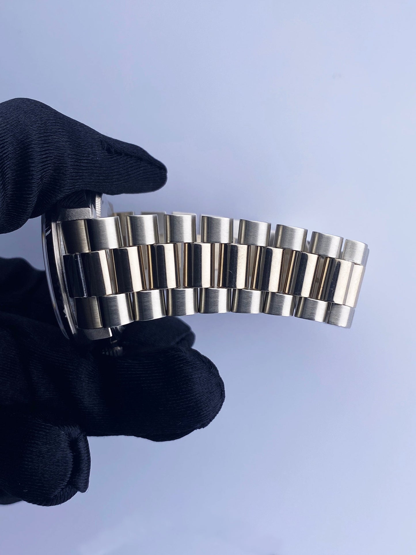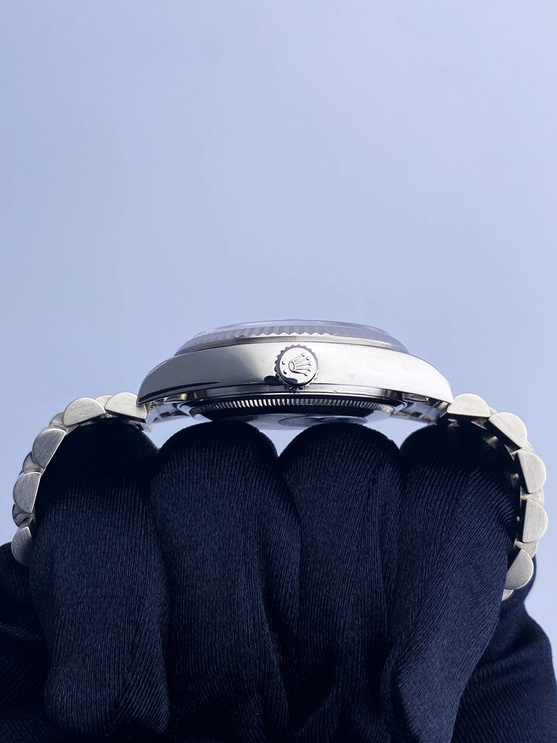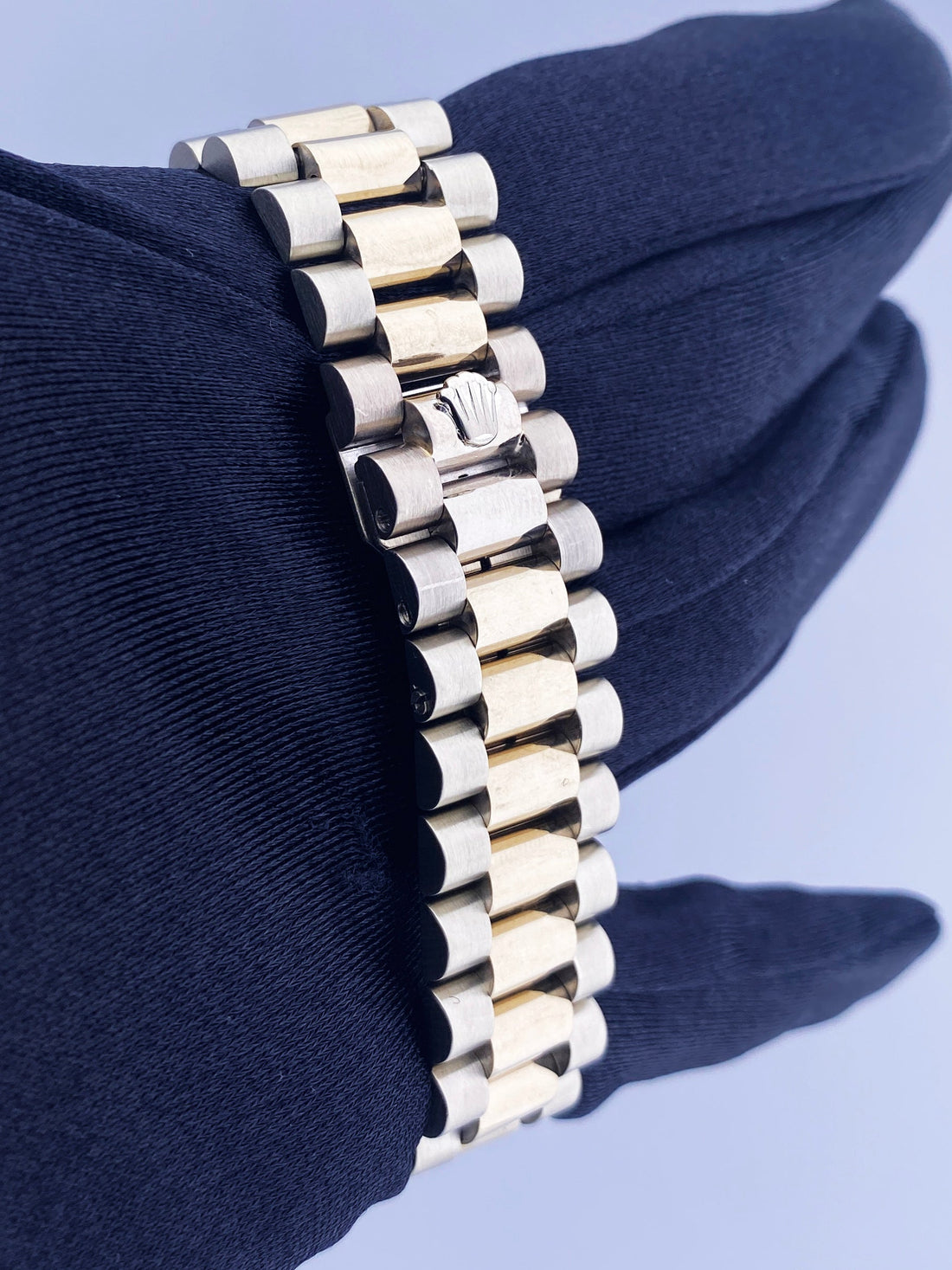 Rolex Day-Date 18039 Mens Watch. 36mm 18K white gold case with 18K white gold fluted bezel. Blue dial with luminous hands and index hour marker. Minute markers on the outer dial. Date display at the 3 o'clock position. Day display at 12 o'clock position. 18K white gold President bracelet with hidden Fold Over Clasp. Will fit up to a 6.25-inch wrist. Sapphire crystal. 18K white gold case back. Automatic self-winding movement.