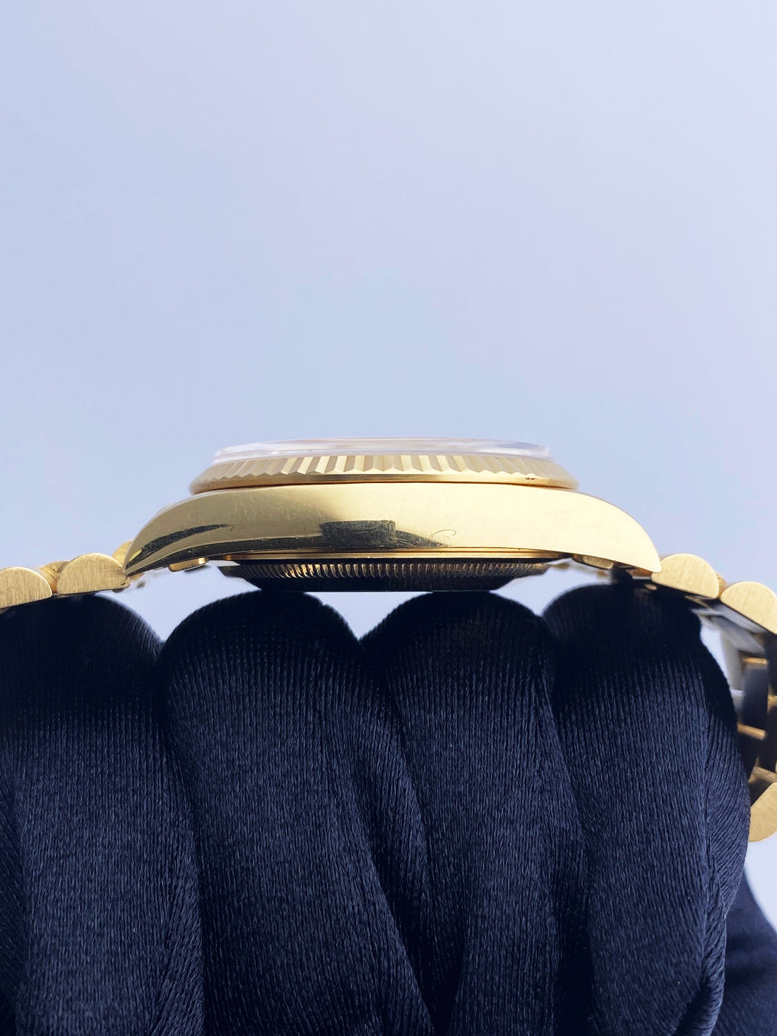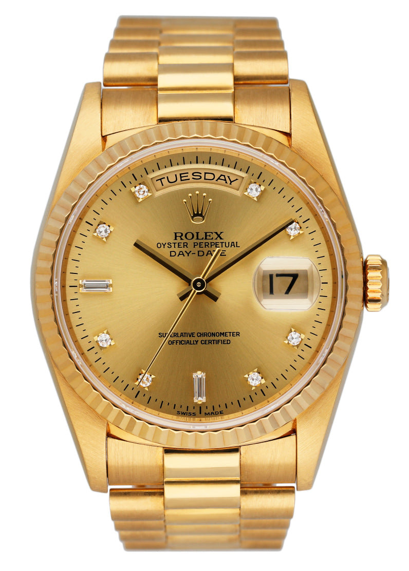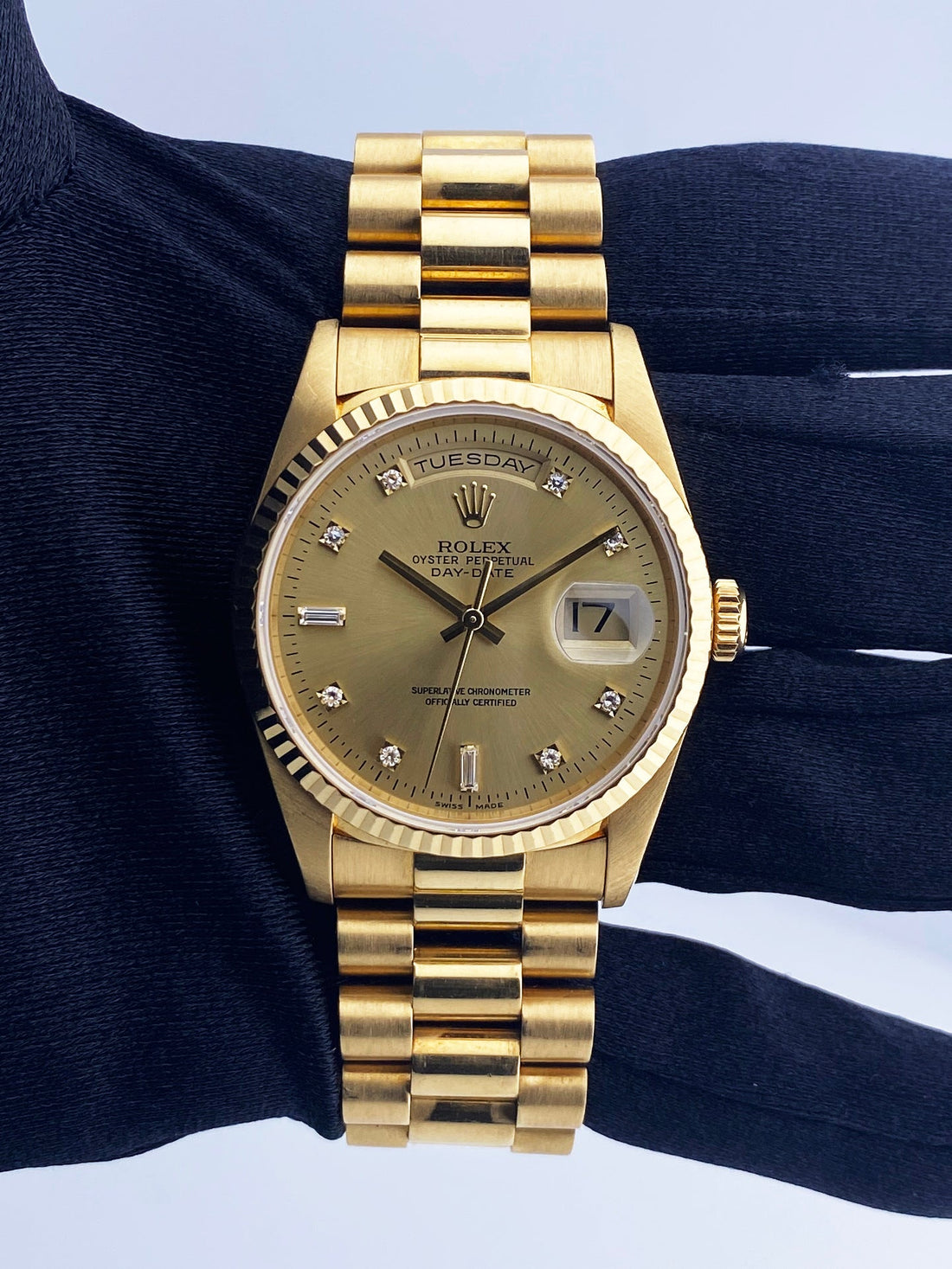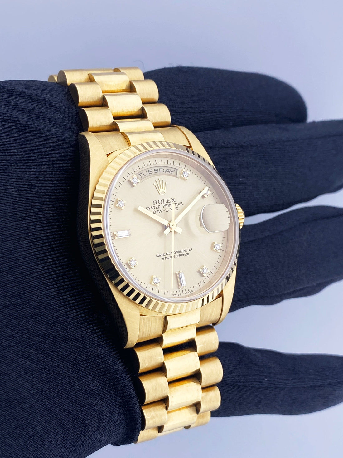Rolex Day Date 18238 Mens Watch. 36mm 18K yellow gold case with 18K yellow gold fluted bezel. Champagne dial with gold hands and original factory diamonds set hour marker. Date display at 3 o'clock position and day display at 12 o'clock position. 18K yellow gold President bracelet with 18K yellow gold hidden fold over clasp. Will fit up to 6.5-Inch wrist. Sapphire crystal. 18K yellow gold case back. Automatic self-winding movement. Circa: 1995.