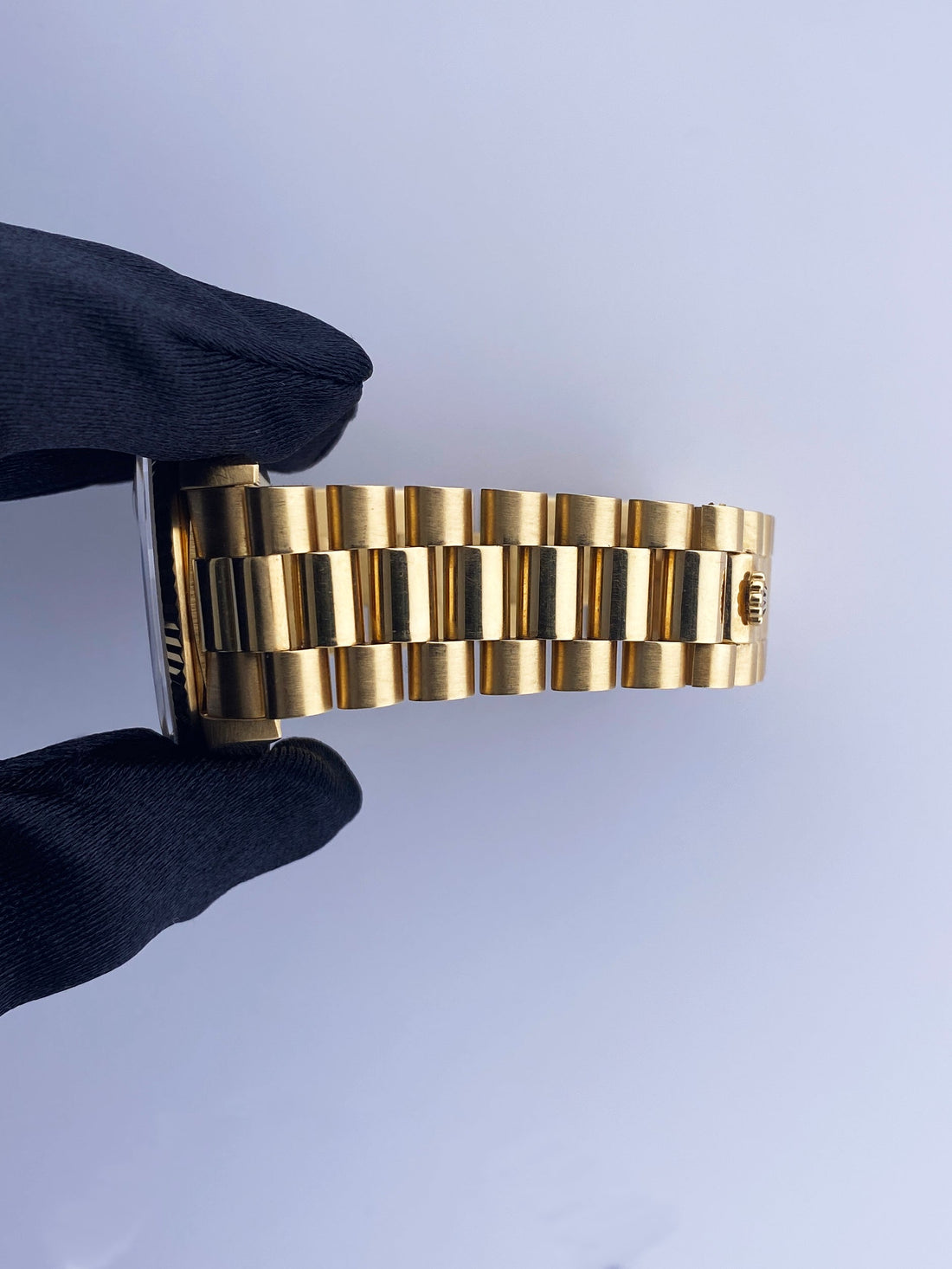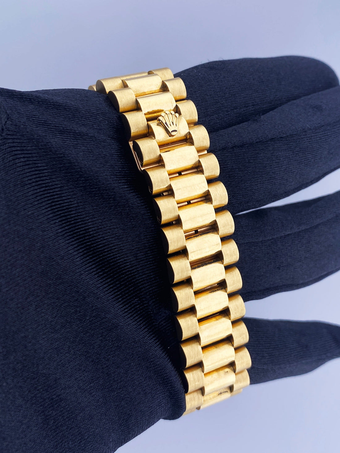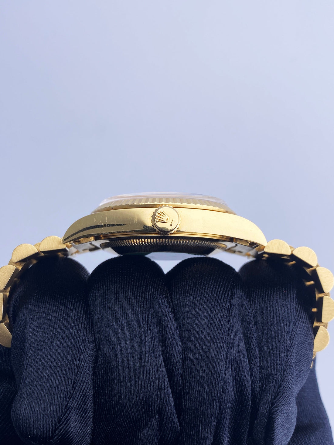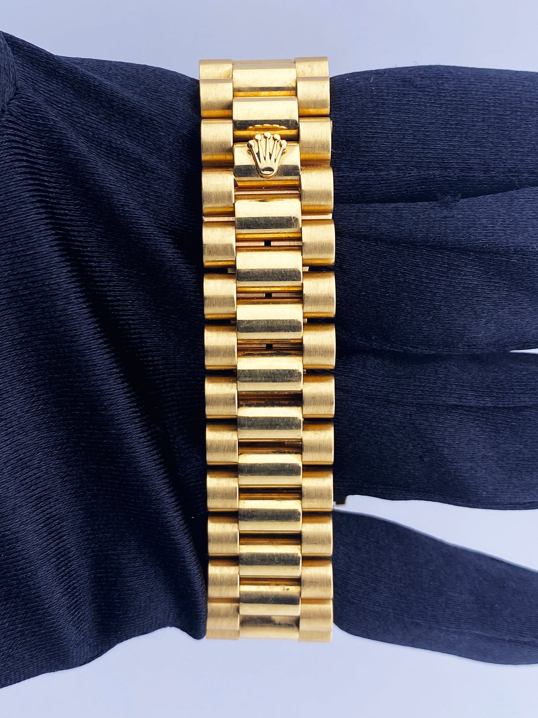 Rolex Day Date 18238 Mens Watch. 36mm 18K yellow gold case with 18K yellow gold fluted bezel. Champagne dial with gold hands and original factory diamonds set hour marker. Date display at 3 o'clock position and day display at 12 o'clock position. 18K yellow gold President bracelet with 18K yellow gold hidden fold over clasp. Will fit up to 6.5-Inch wrist. Sapphire crystal. 18K yellow gold case back. Automatic self-winding movement. Circa: 1995.