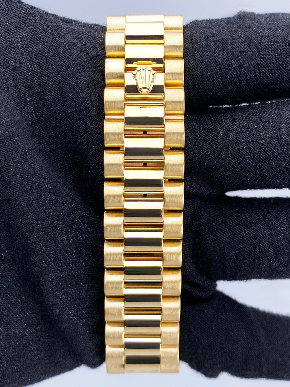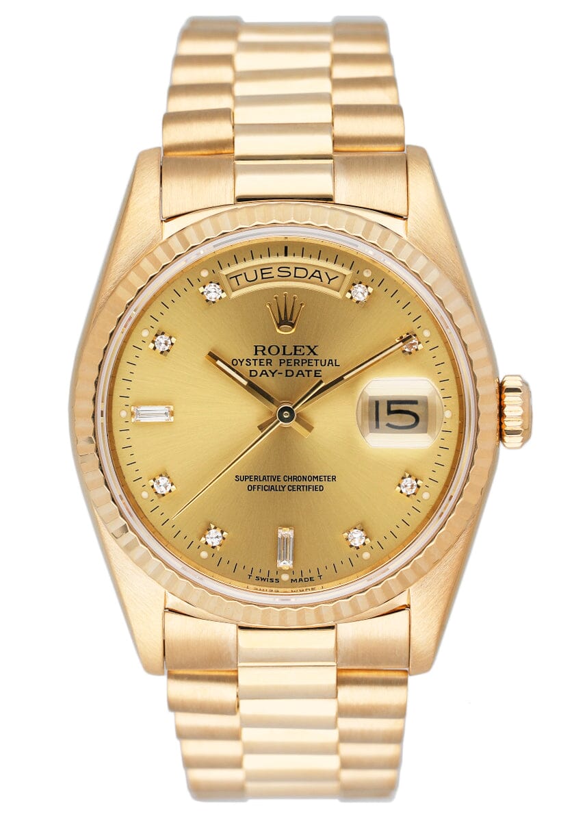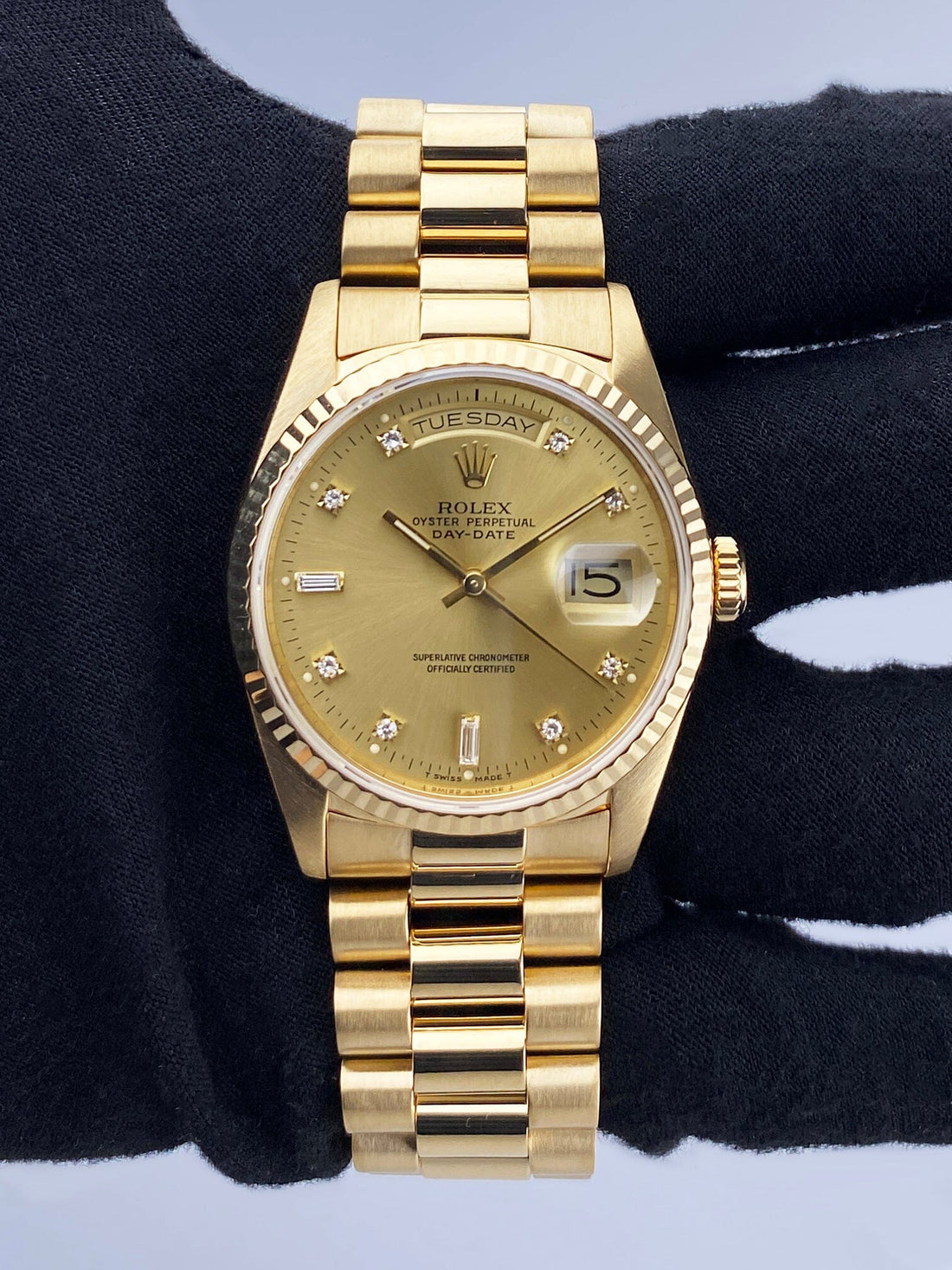 Rolex Day Date 18238 Mens Watch. 36mm 18K yellow gold case with 18K yellow gold fluted bezel. Champagne dial with gold hands and factory diamonds hour marker. Date display at 3 o'clock position and day display at 12 o'clock position. 18K yellow gold President bracelet with 18K yellow gold hidden fold over clasp. Will fit up to 7-Inch wrist. Sapphire crystal. 18K yellow gold case back. Automatic self-winding movement.
