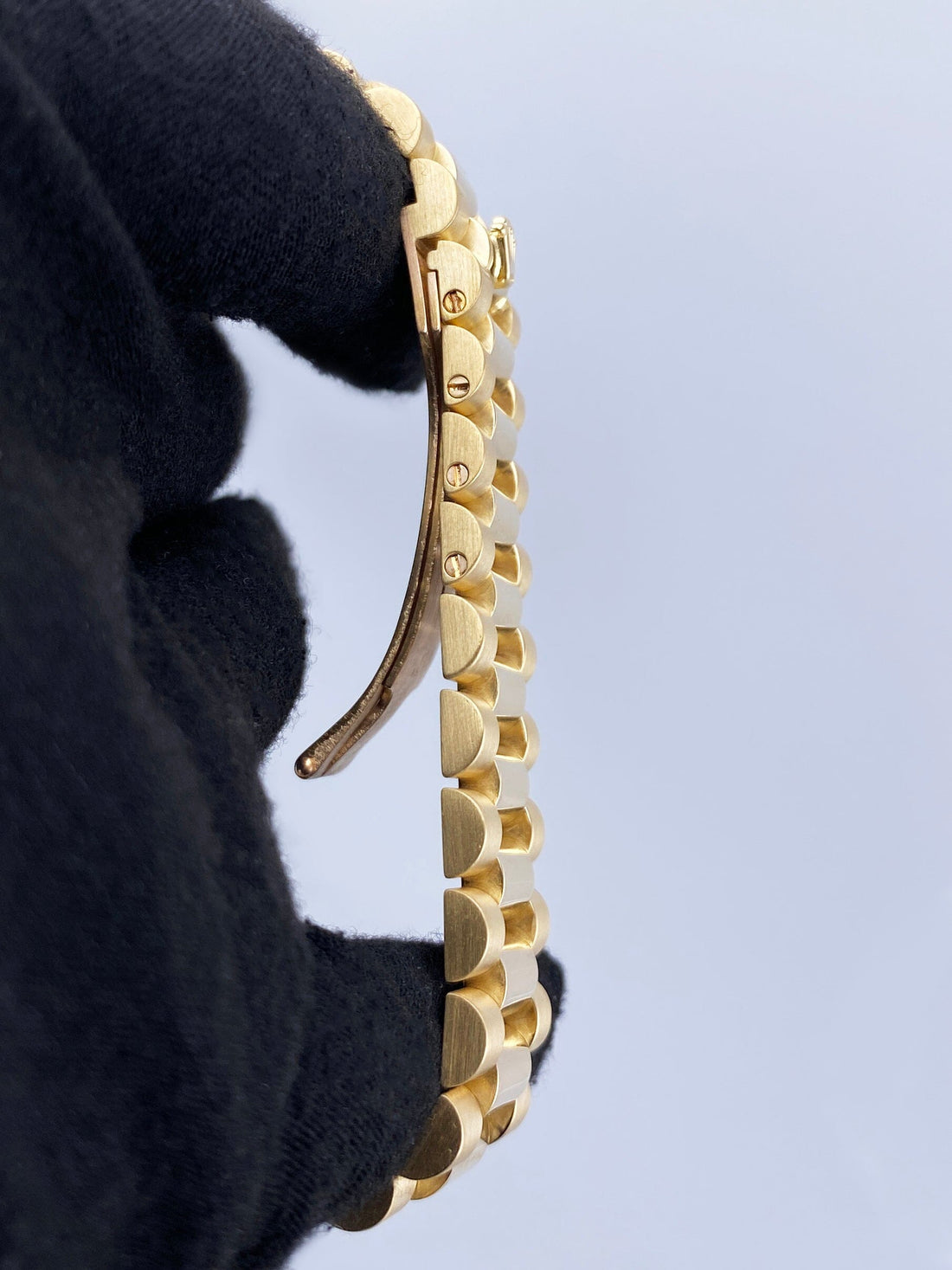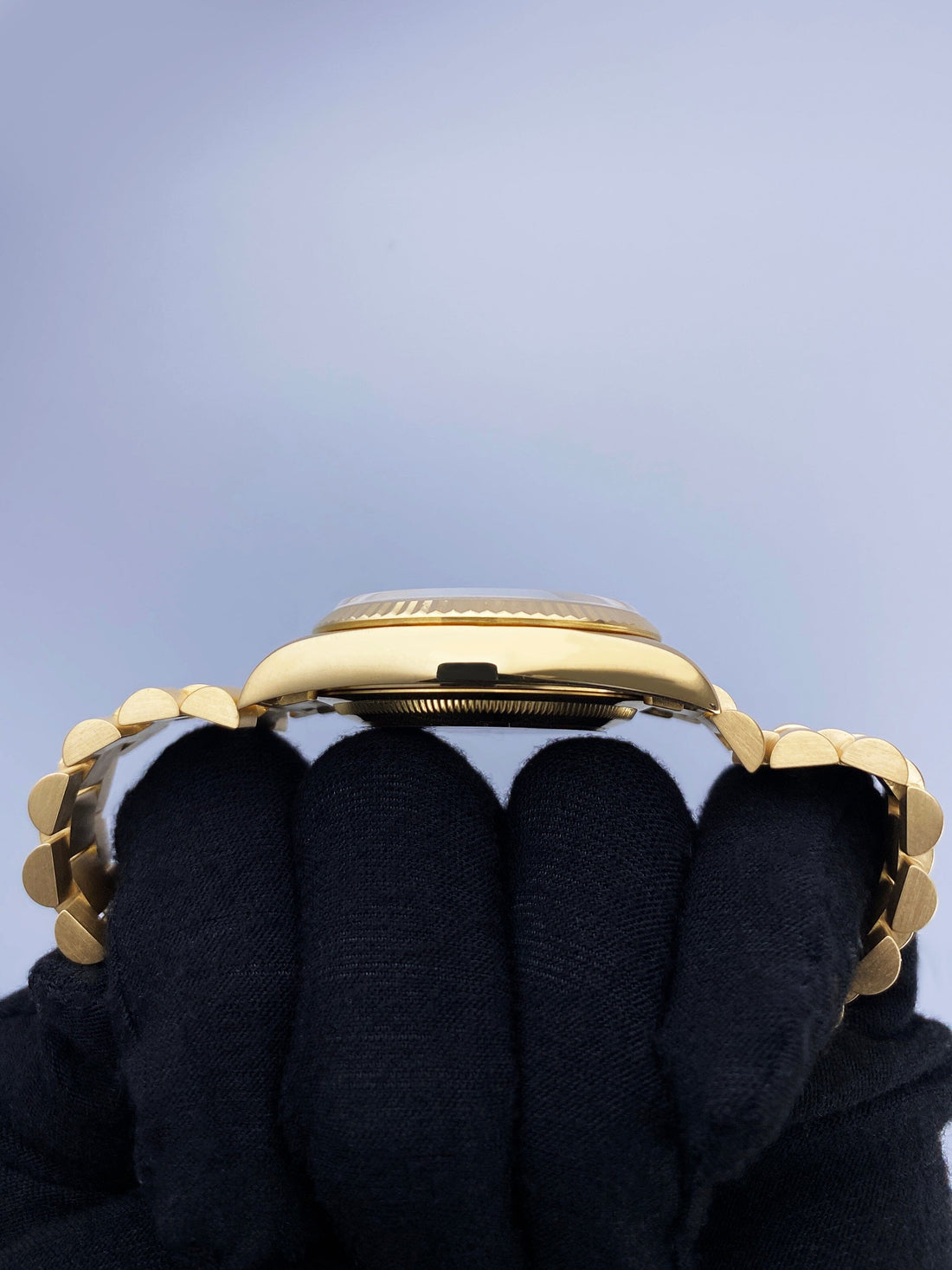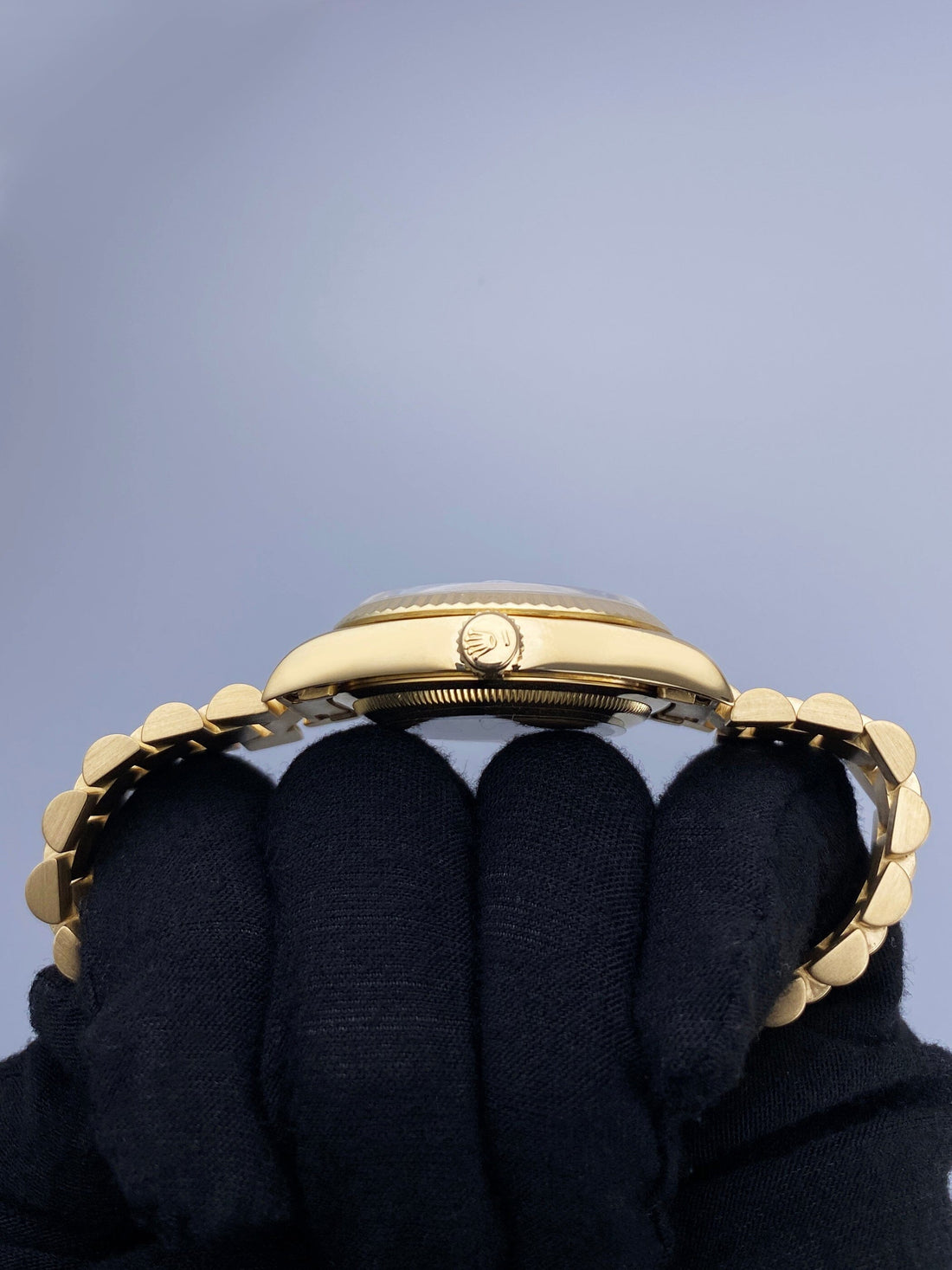 Rolex Day Date 18238 Mens Watch. 36mm 18K yellow gold case with 18K yellow gold fluted bezel. Champagne dial with gold hands and factory diamonds hour marker. Date display at 3 o'clock position and day display at 12 o'clock position. 18K yellow gold President bracelet with 18K yellow gold hidden fold over clasp. Will fit up to 7-Inch wrist. Sapphire crystal. 18K yellow gold case back. Automatic self-winding movement.