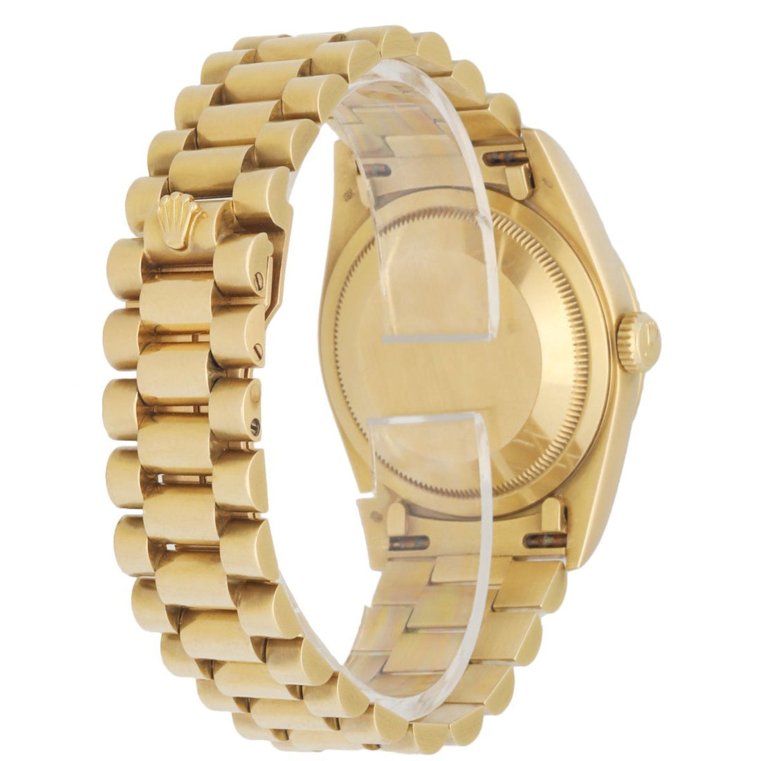 Rolex Day Date 18238 men's watch. 36MM 18K yellow gold case with 18K yellow gold fluted bezel. Champagne dial with gold hands and factory diamonds hour marker. Date display at 3 o'clock position & day display at 12 o'clock position. 18K yellow gold bracelet with 18K yellow gold hidden fold over clasp. Will fit up to 7-Inch wrist. Sapphire crystal and 18K yellow gold case back. Automatic self winding movement. Circa: 1990