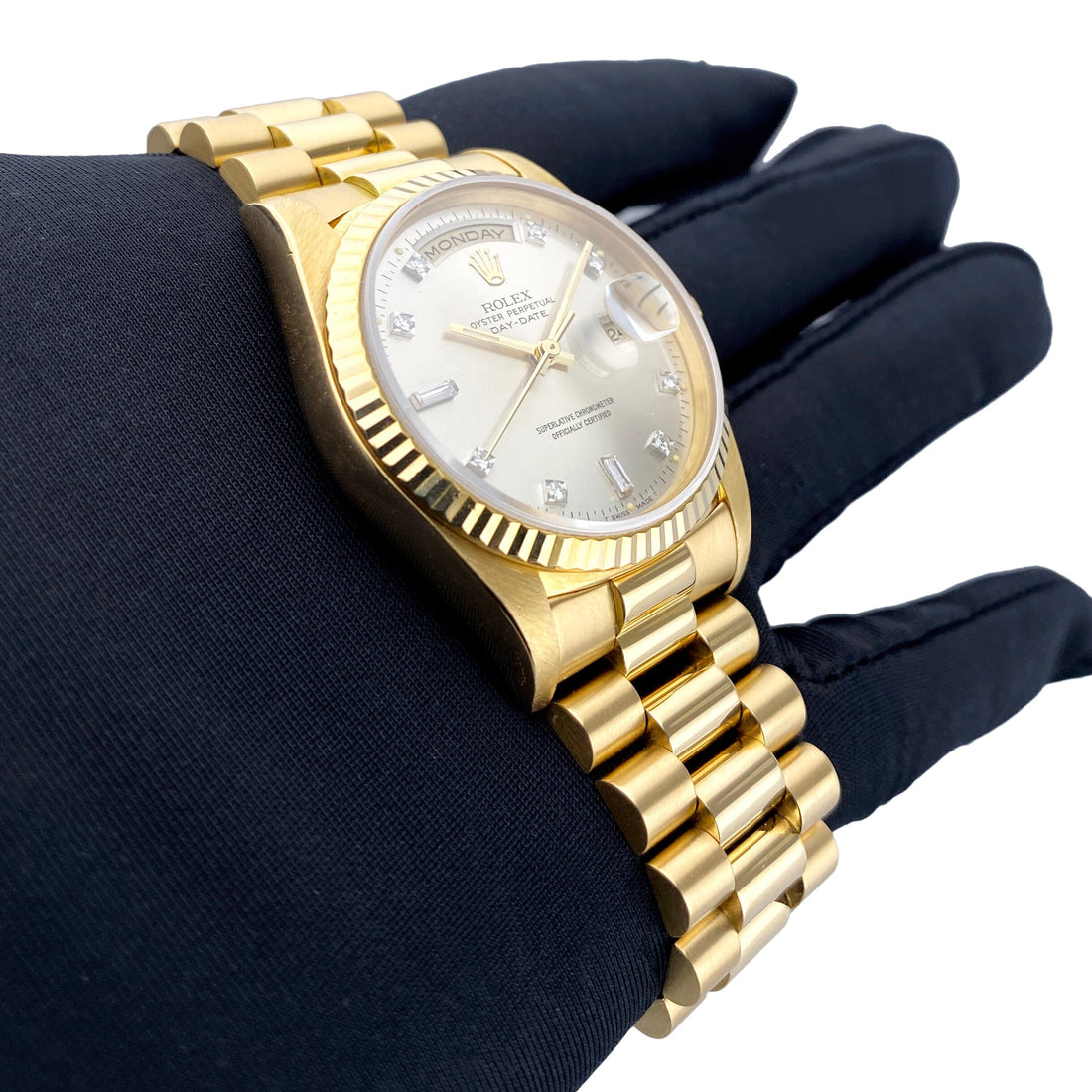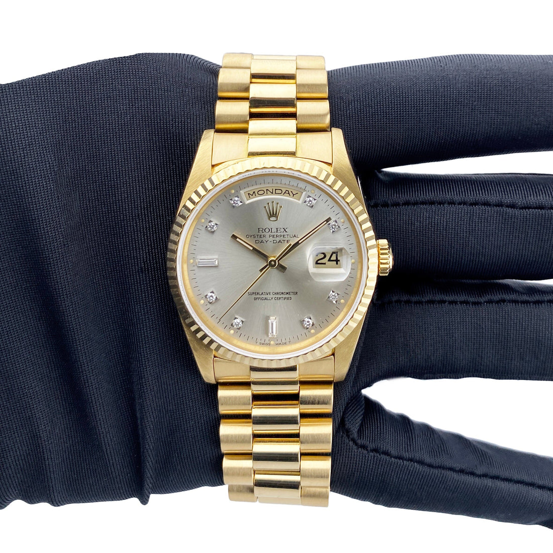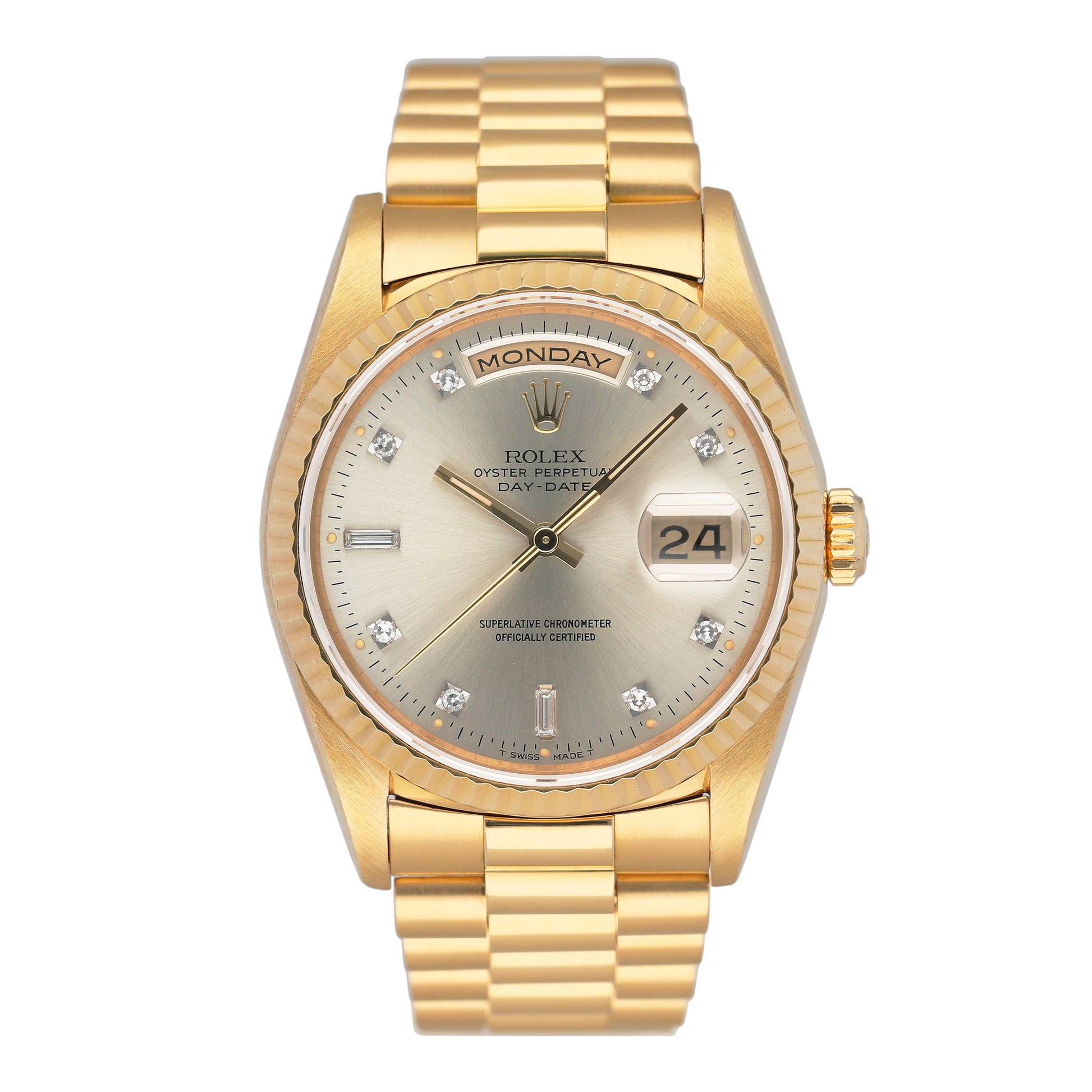 Rolex Day Date 18238 Mens Watch. 36mm 18K yellow gold case. 18K yellow gold fluted bezel. Silver dial with gold hands and factory diamonds hour marker. Date display at 3 o'clock position and day display at 12 o'clock position. 18K yellow gold President bracelet with 18K yellow gold hidden fold over clasp. Will fit up to 6.75-Inch wrist. Sapphire crystal. 18K yellow gold case back. Automatic self-winding movement.
