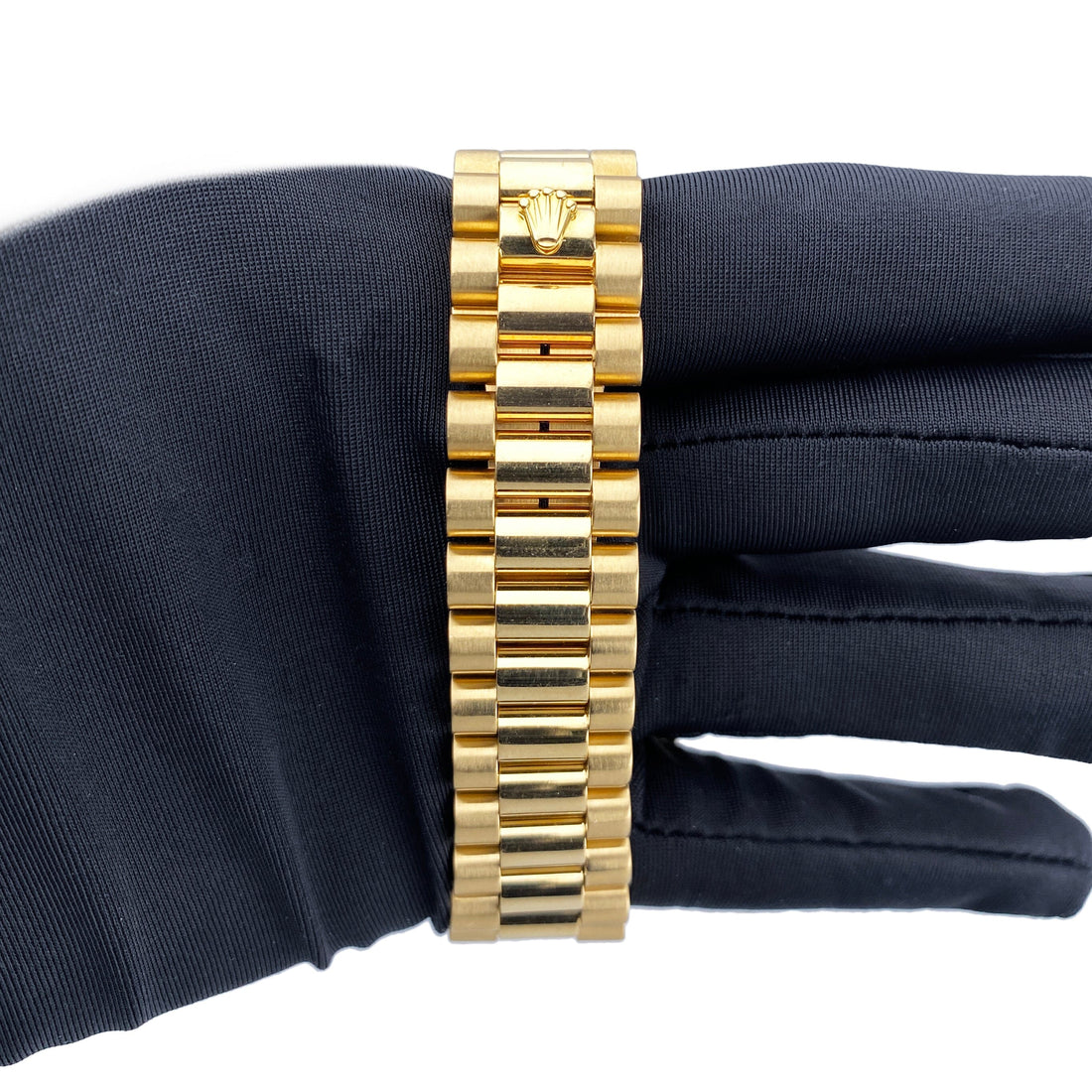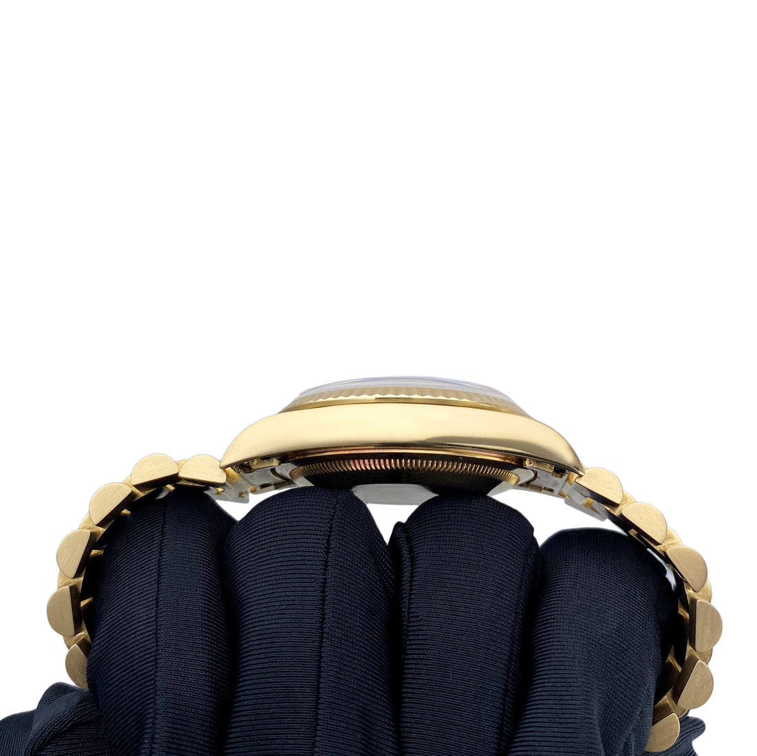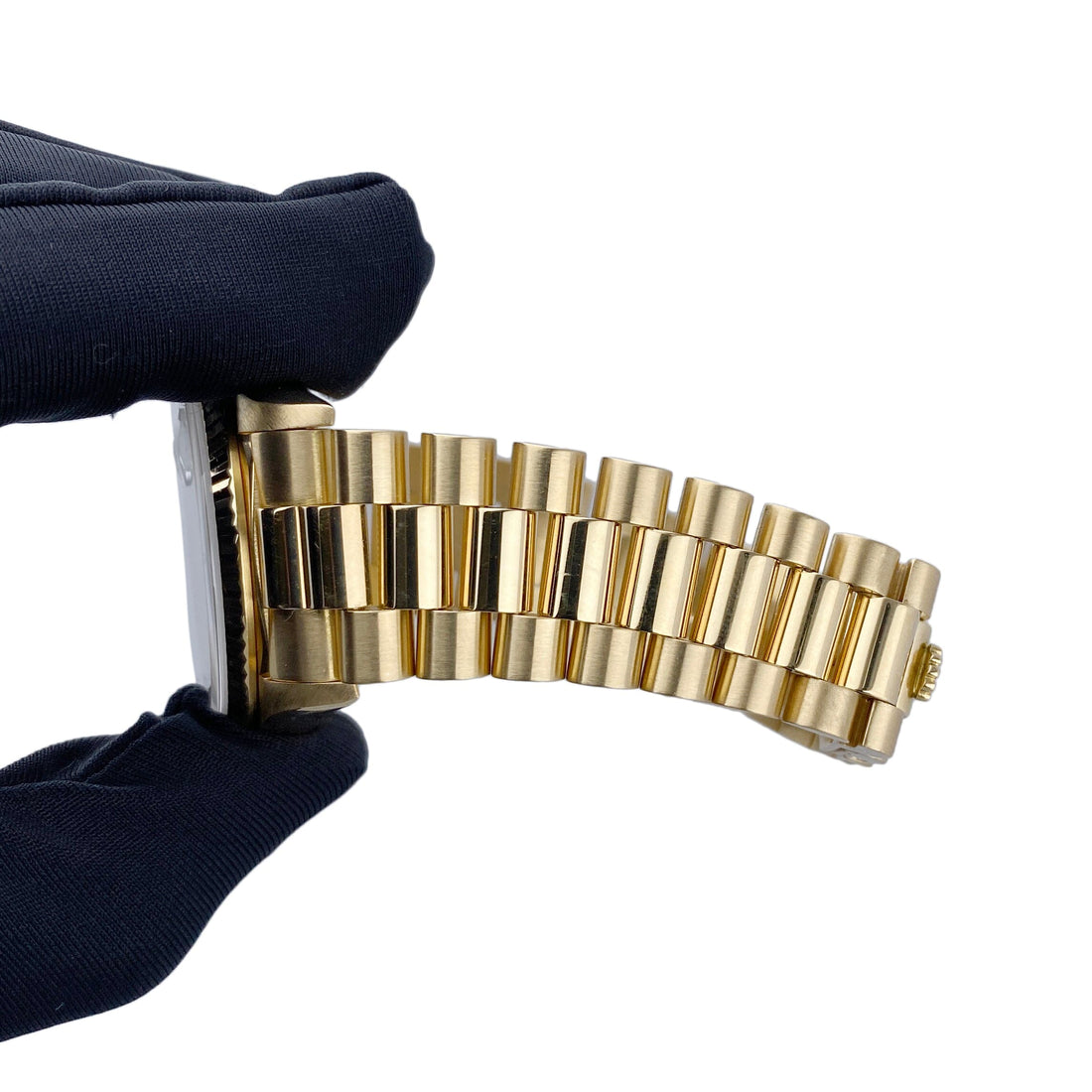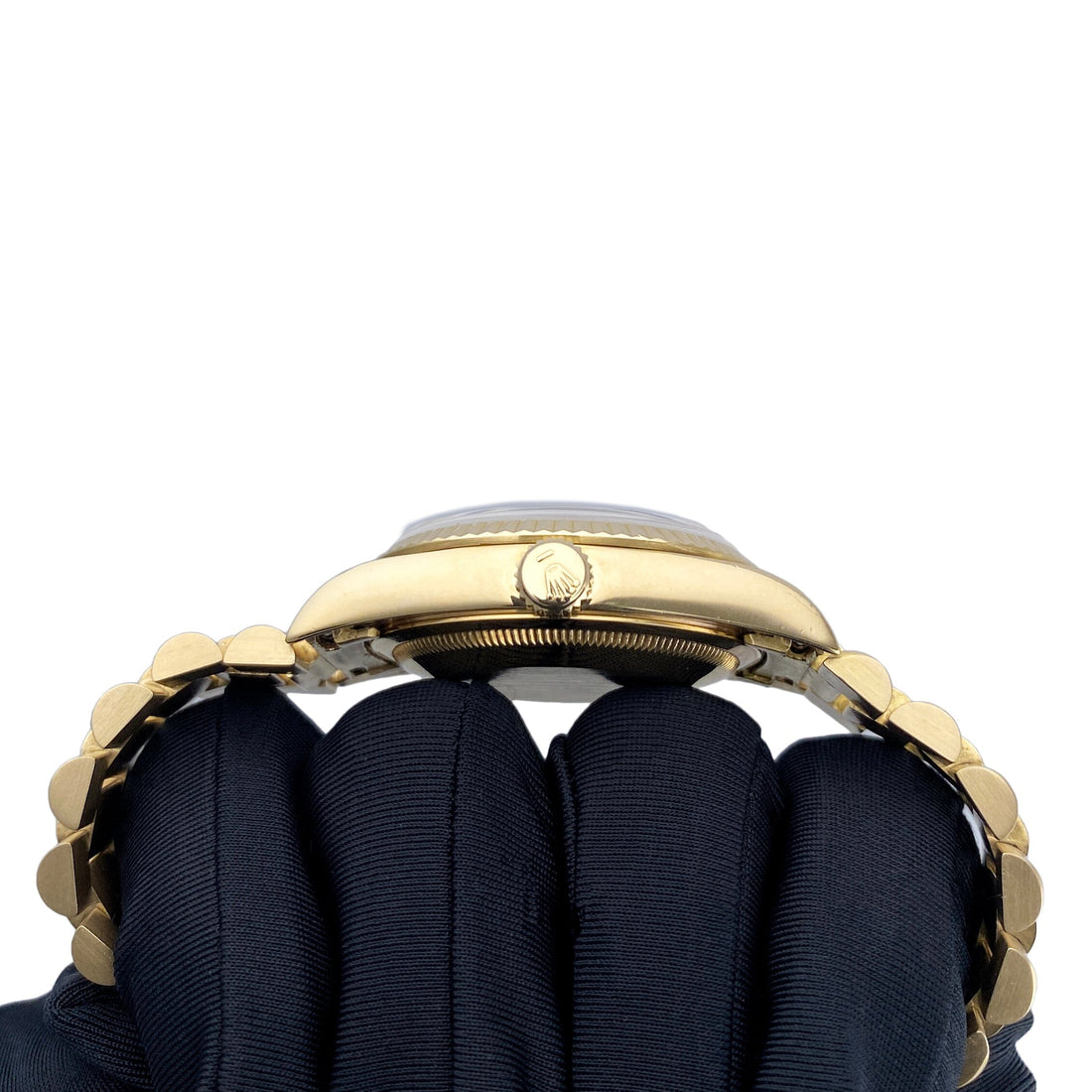 Rolex Day Date 18238 Mens Watch. 36mm 18K yellow gold case. 18K yellow gold fluted bezel. Silver dial with gold hands and factory diamonds hour marker. Date display at 3 o'clock position and day display at 12 o'clock position. 18K yellow gold President bracelet with 18K yellow gold hidden fold over clasp. Will fit up to 6.75-Inch wrist. Sapphire crystal. 18K yellow gold case back. Automatic self-winding movement.
