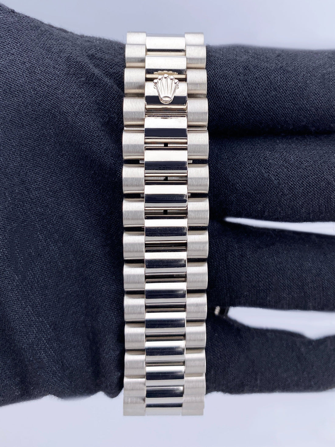 Rolex Day Date 18239 Mens Watch. 36mm 18K white gold case. 18K white gold fluted bezel. Blue dial with luminous gold hands and index hour marker. Date display at 3 o'clock position & day display at 12 o'clock position. 18K white gold President bracelet with 18K white gold hidden fold over clasp. Will fit up to 7.25-Inch wrist. Sapphire crystal and 18K white gold case back. Automatic self winding movement.