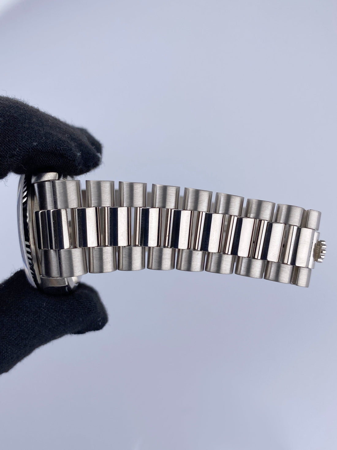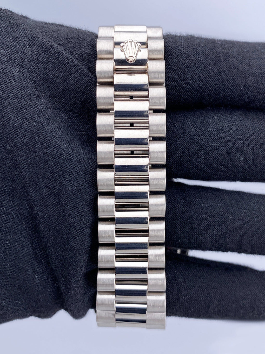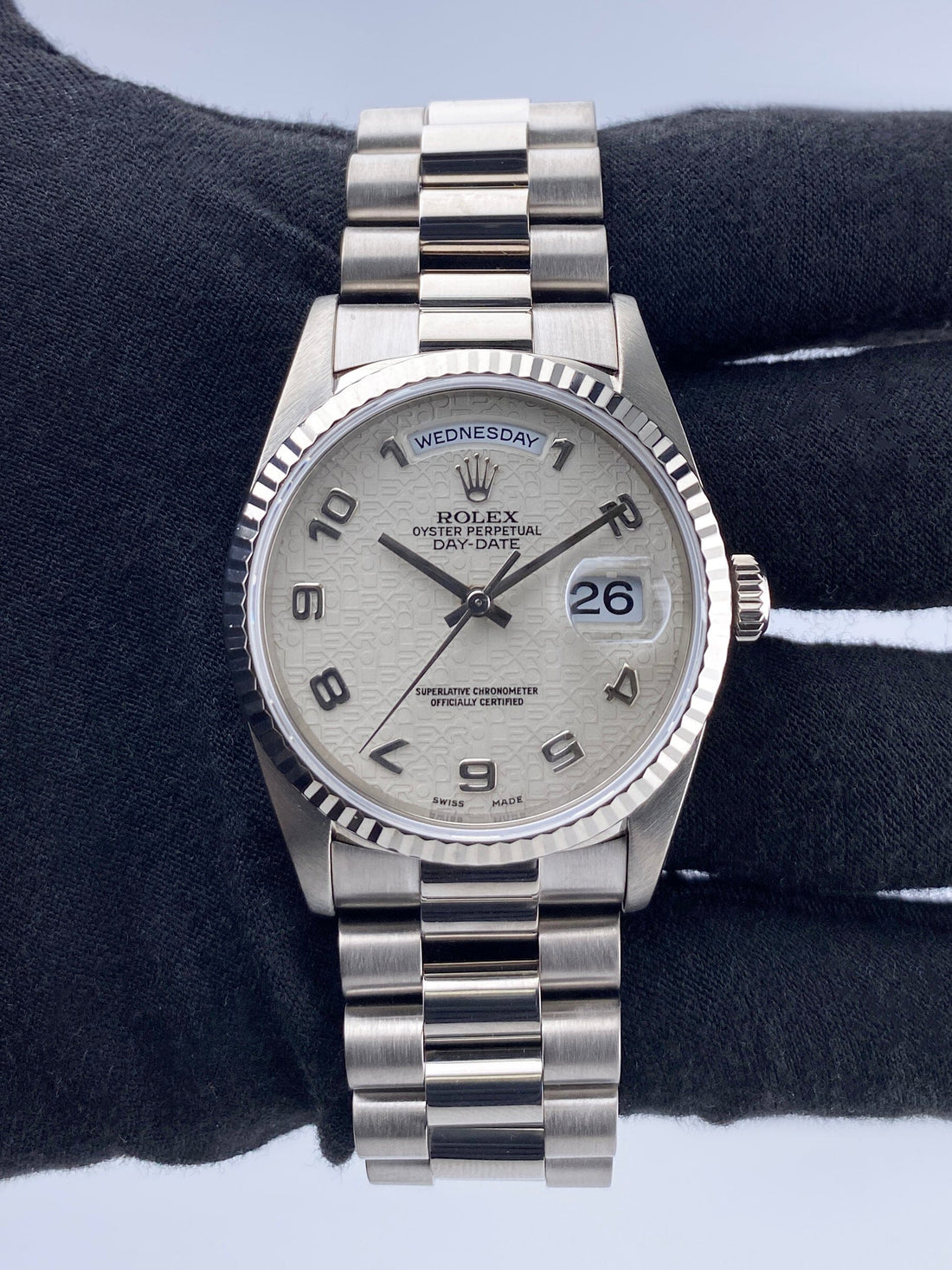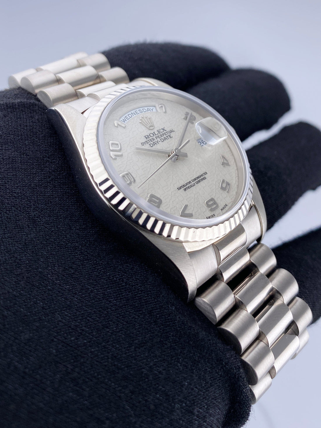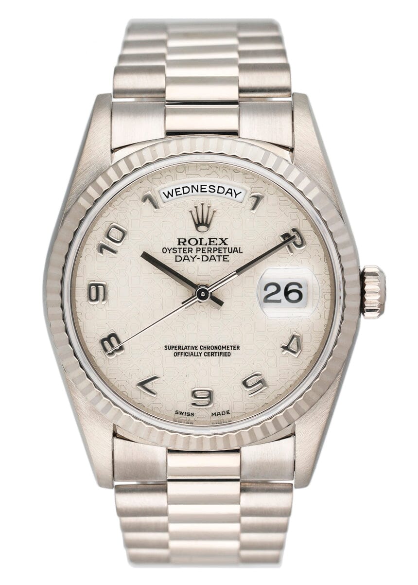 Rolex Day-Date 18239 Mens Watch. 36mm 18K white gold case. 18K white gold fluted bezel. Silver anniversary dial with steel hands and Arabic numeral hour marker. Date display at the 3 o'clock position and day display at 12 o'clock position. 18K white gold President bracelet with hidden fold over clasp. Will fit up to a 6.5-inch wrist. Sapphire crystal. 18K white gold case back. Automatic self-winding chronometer movement.