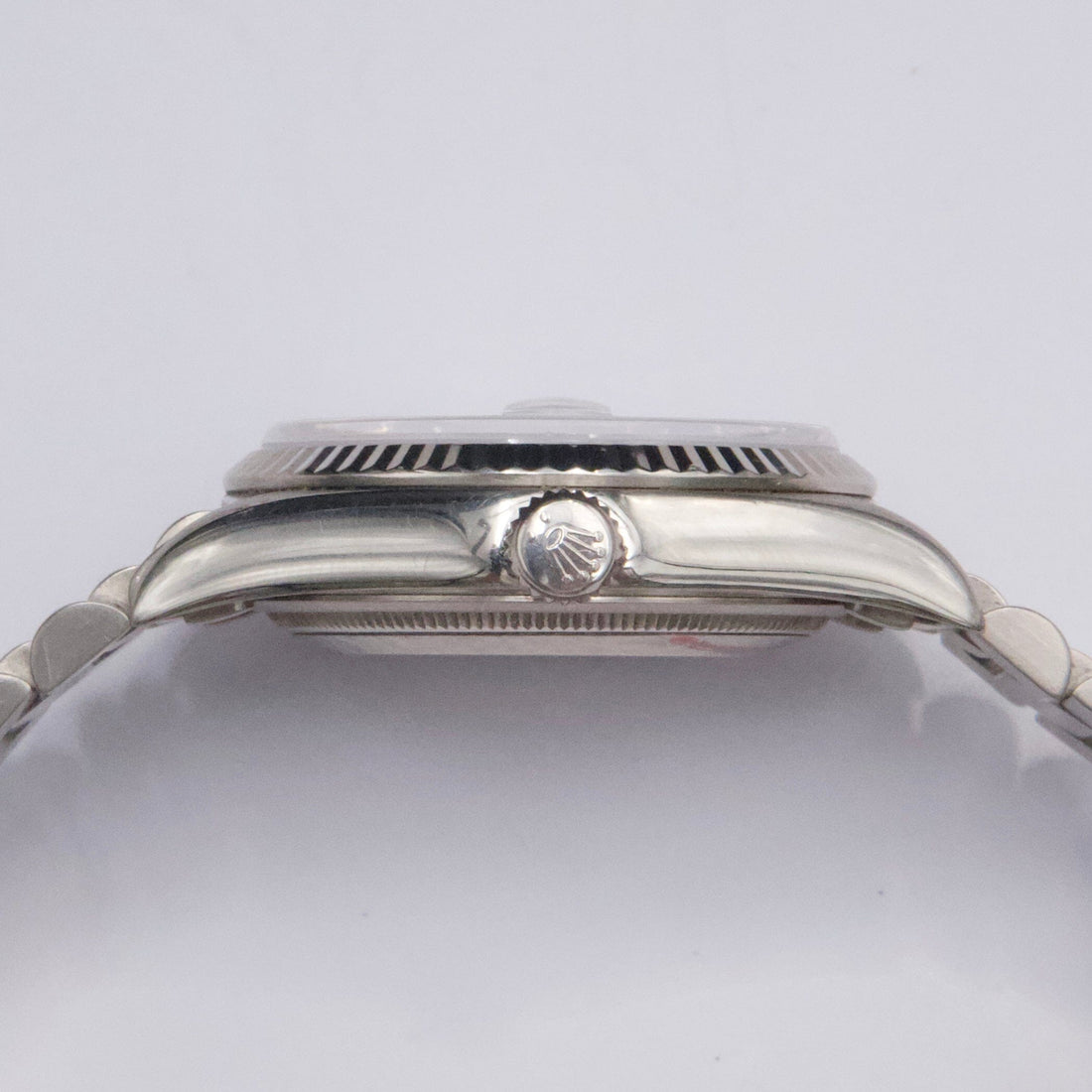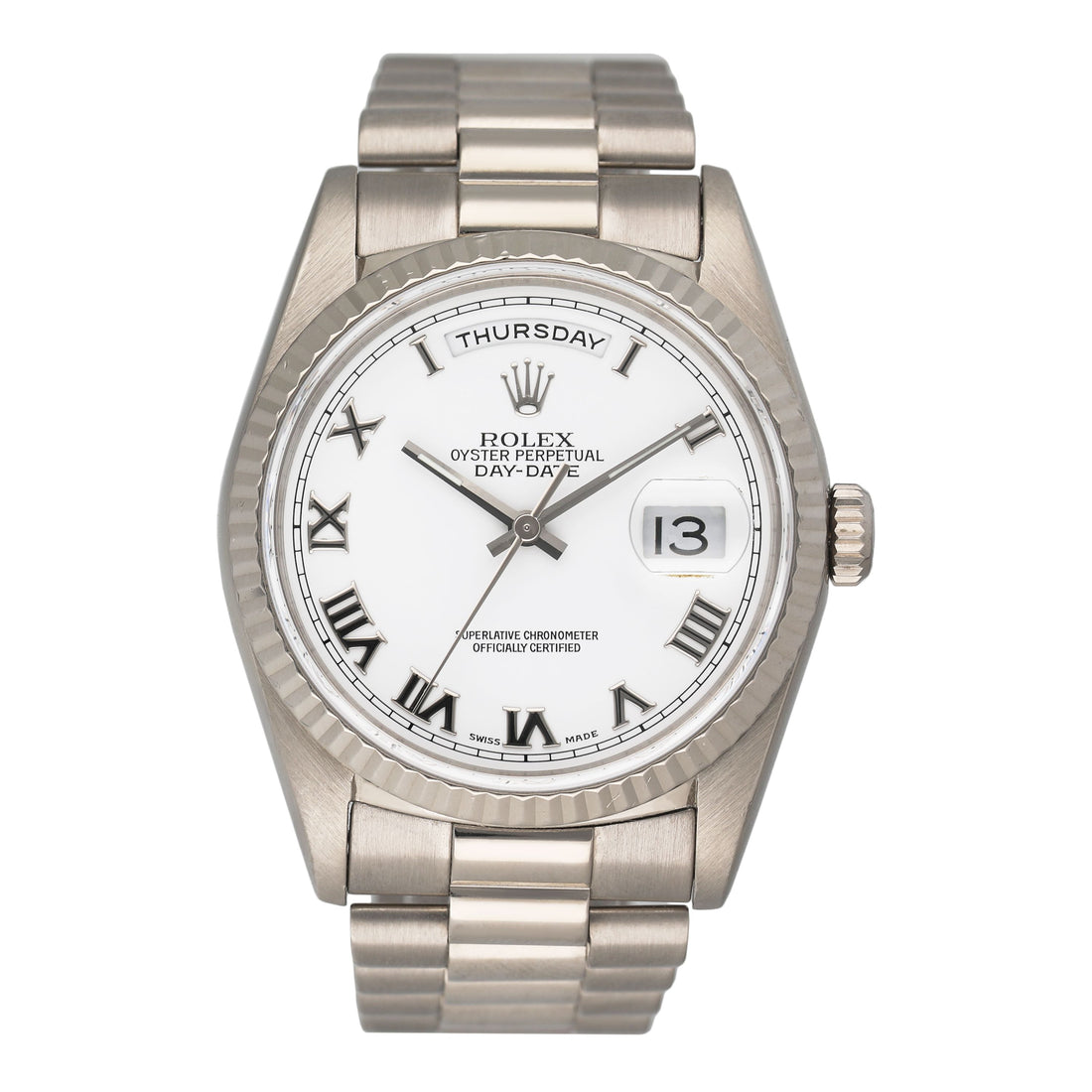 Rolex Day-Date 18239 Mens Watch. 36mm 18K white gold case with 18K white gold fluted bezel. Silver dial with silver tone hands and index hour marker. Minute makers on the outer dial. Date display at 3 o'clock position & day display at 12 o'clock position. 18K white gold President bracelet with 18K white gold hidden fold over clasp. Will fit up to 6-Inch wrist. Sapphire crystal. 18K white gold case back. Automatic self-winding movement. This watch comes with original Box.