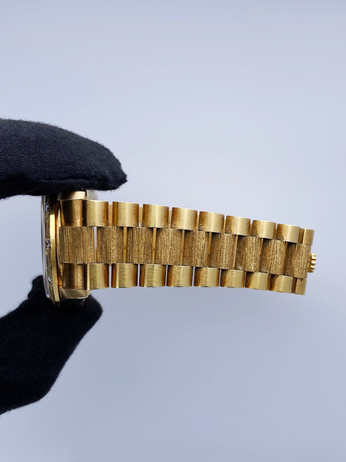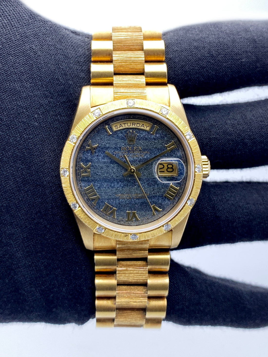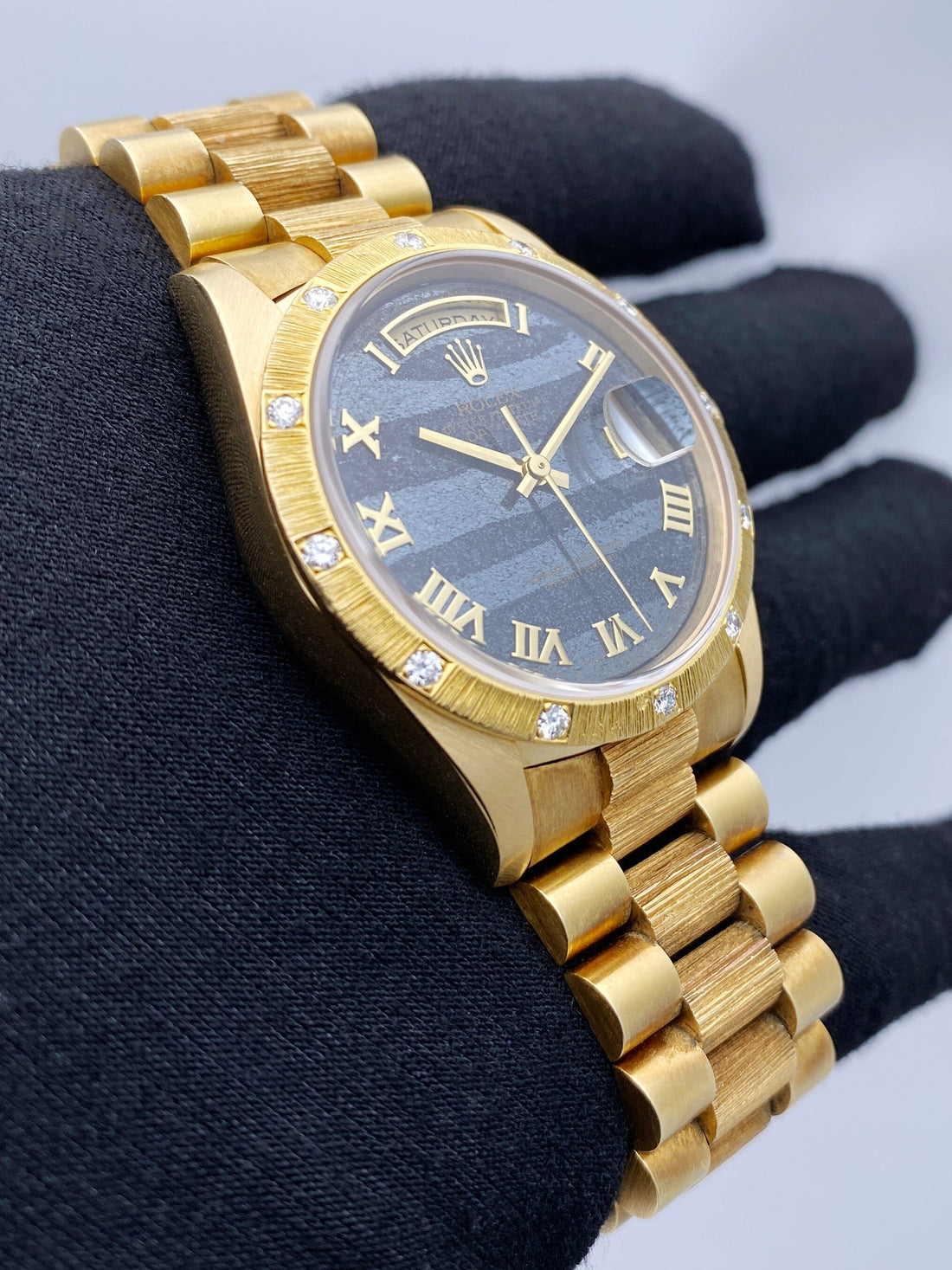 Rolex Day Date 18308 Mens Watch. 36mm 18K yellow gold case. 18K yellow gold bark finish bezel with factory diamonds. Ferrite dial with gold hands and Roman numeral hour marker. Date display at 3 o'clock position and day display at 12 o'clock position. 18K yellow gold bark finish President bracelet with 18K rose gold hidden fold over clasp. Will fit up to 6.75-Inch wrist. Sapphire crystal. 18K yellow gold case back. Automatic self-winding movement.