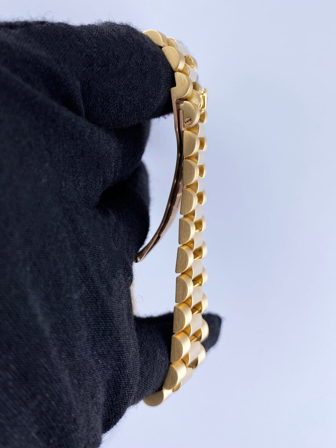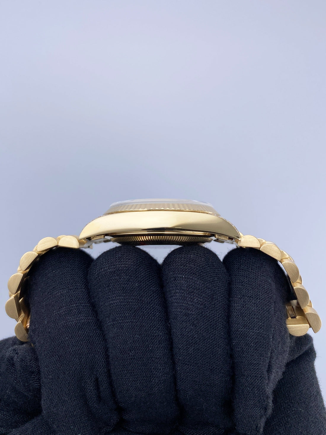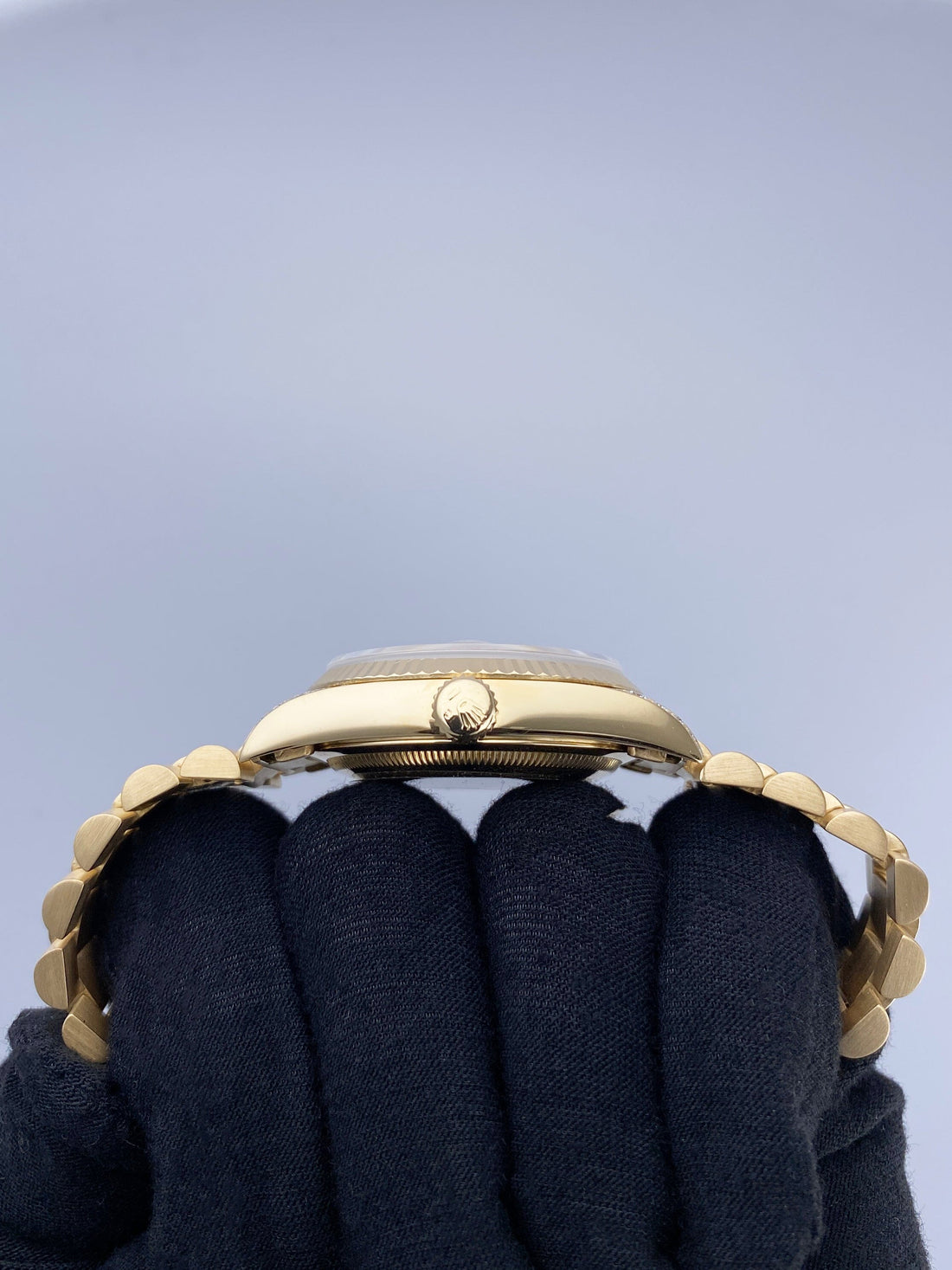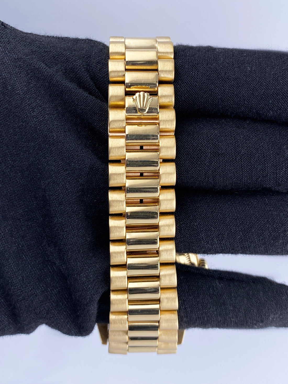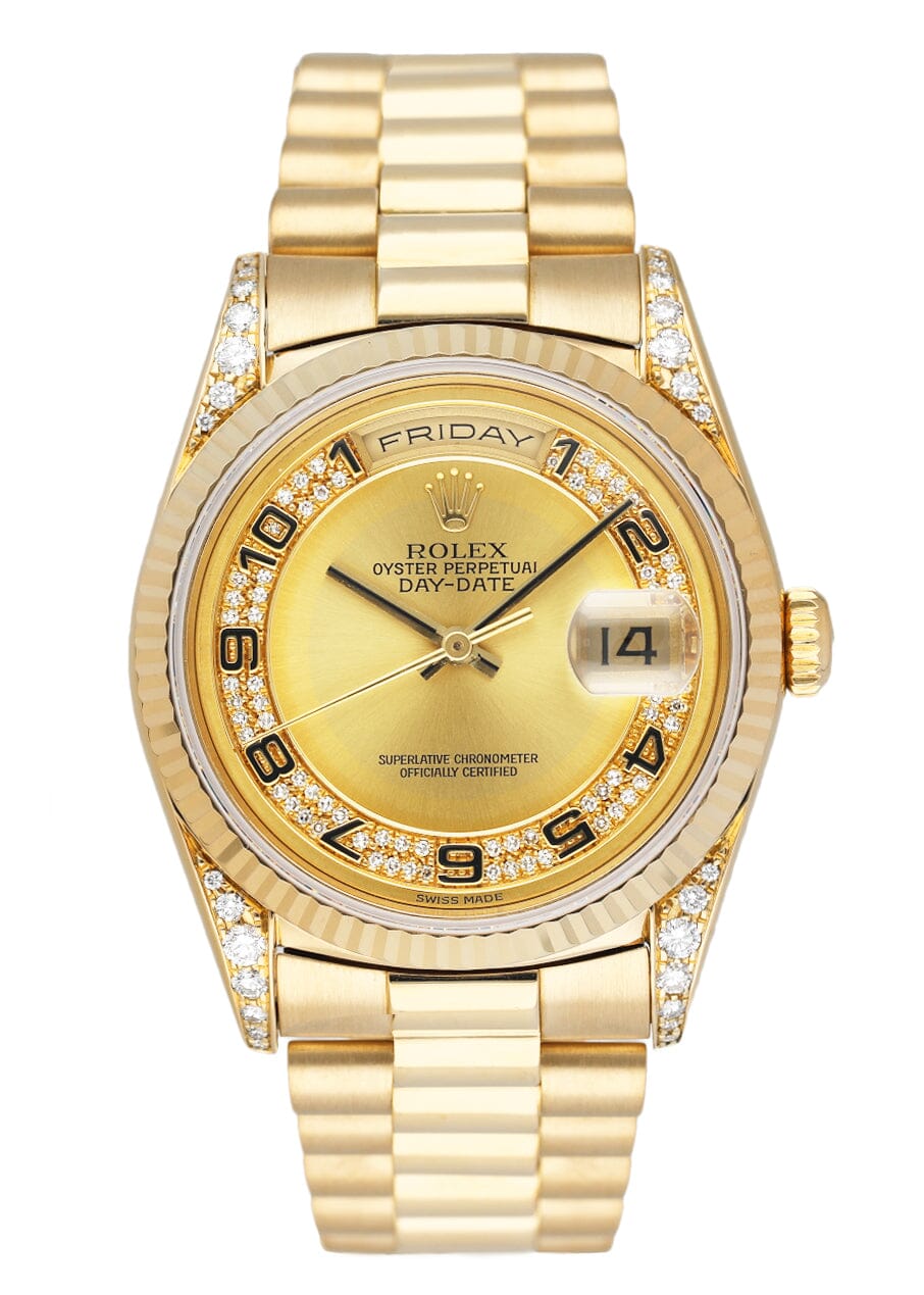 Rolex Day-Date 18338 Mens Watch. 36mm 18K yellow gold case with factory diamond. 18K yellow gold fluted bezel. Champagne dial with gold hands and Arabic numeral hour markers. Factory diamond around the outer dial. Date display at the 3 o'clock position and day display at the 12 o'clock position. 18K yellow gold President bracelet with hidden fold over clasp. Will fit up to a 7.25-inch wrist. Sapphire crystal. 18K yellow gold case back. Automatic self-winding chronometer movement.