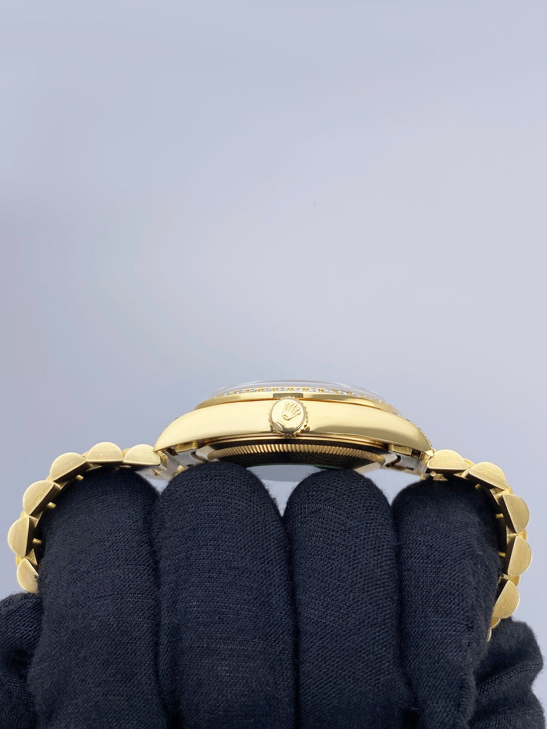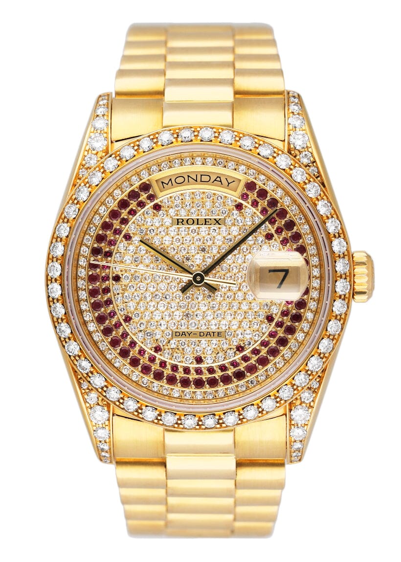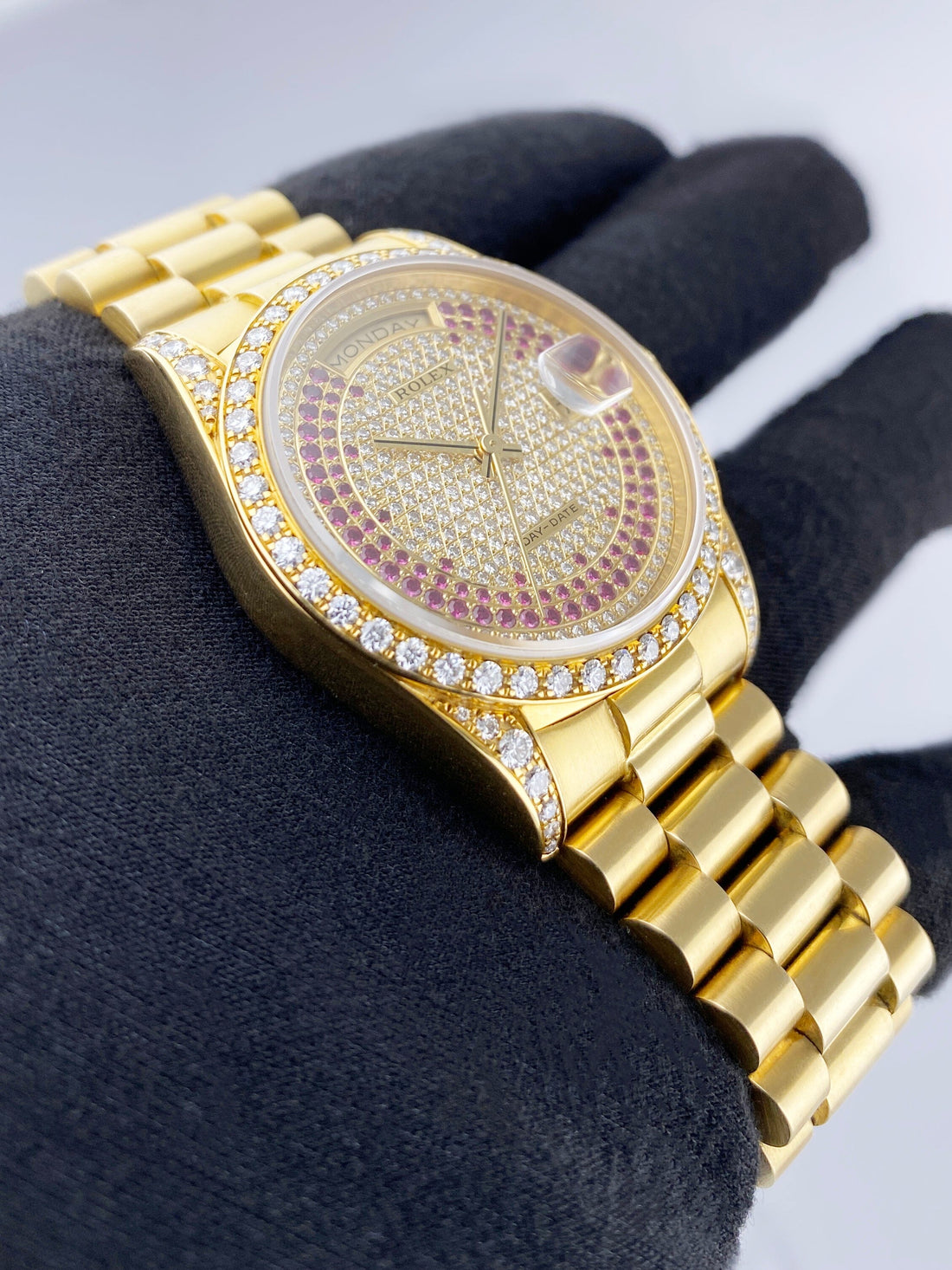 Rolex Day-Date 18388 Mens Watch. 36mm 18K yellow gold and factory diamonds case. 18K yellow gold bezel with factory diamonds. Pave with diamond and ruby dial. Gold hands and ruby hour marker. Day display at 12 o'clock position & date display at 3 o'clock position. 18K yellow gold president bracelet with 18K yellow gold hidden fold over clasp. Will fit up to 6.75-Inch wrist. Sapphire crystal. 18K yellow gold case back. Automatic self-winding movement.