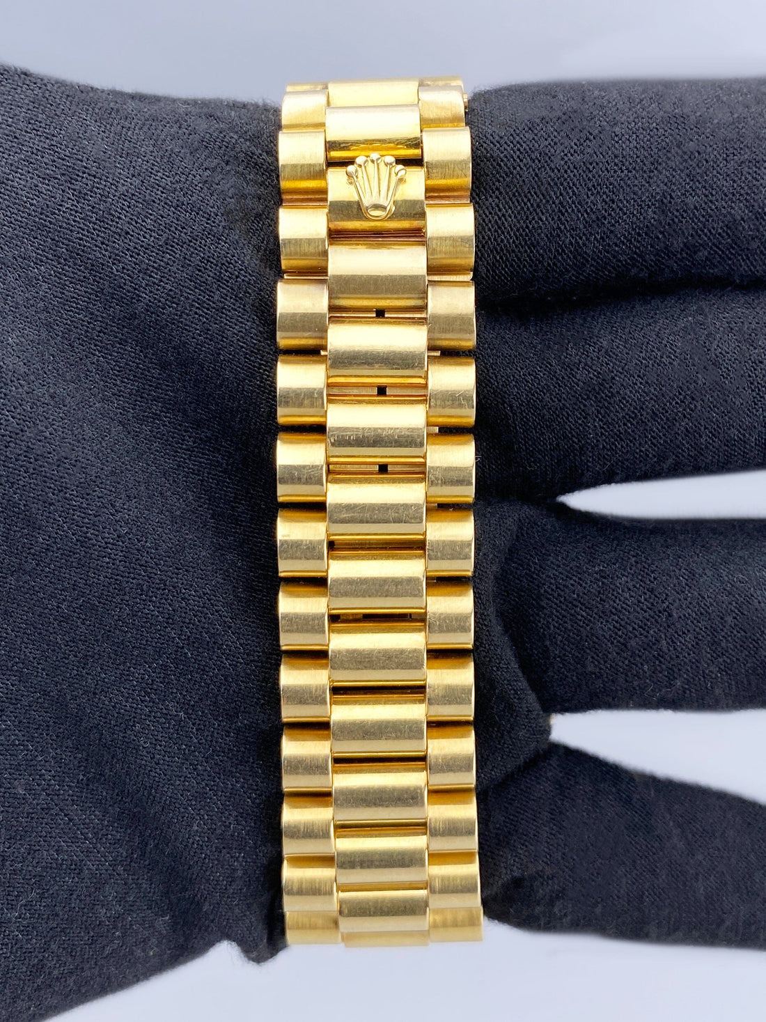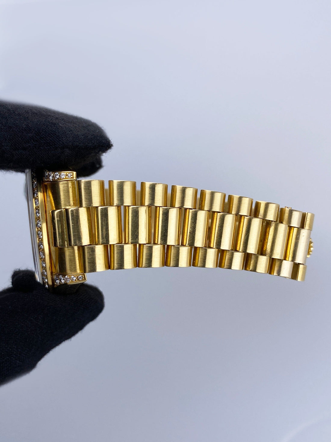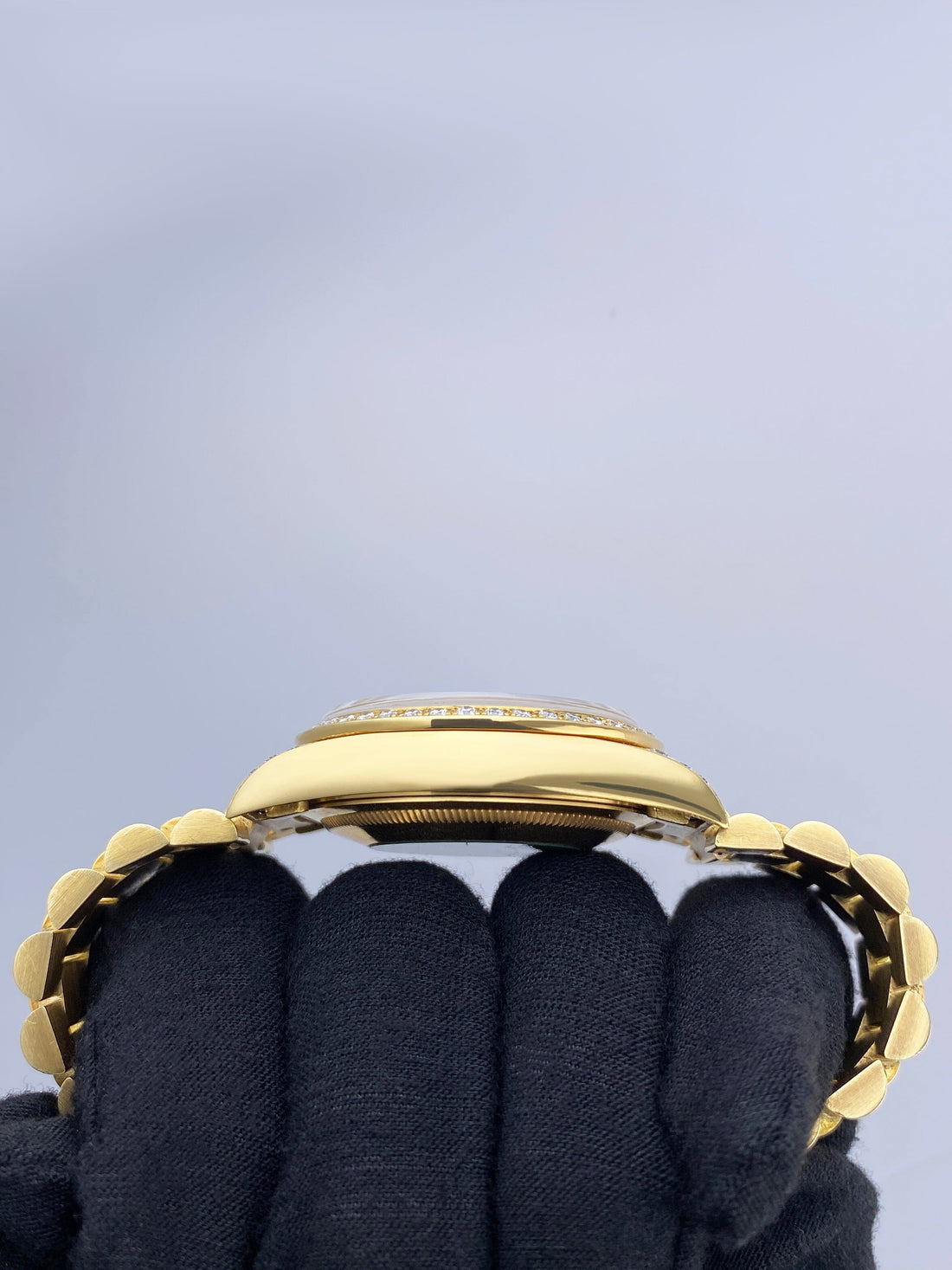 Rolex Day-Date 18388 Mens Watch. 36mm 18K yellow gold and factory diamonds case. 18K yellow gold bezel with factory diamonds. Pave with diamond and ruby dial. Gold hands and ruby hour marker. Day display at 12 o'clock position & date display at 3 o'clock position. 18K yellow gold president bracelet with 18K yellow gold hidden fold over clasp. Will fit up to 6.75-Inch wrist. Sapphire crystal. 18K yellow gold case back. Automatic self-winding movement.