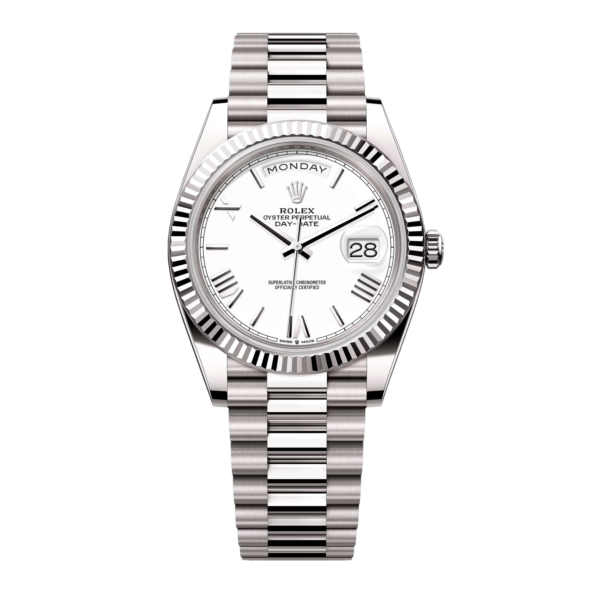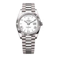 Rolex Day-Date 228239 Mens watch. 40mm 18K white gold case. 18K white gold fluted bezel. White dial with white gold hands and Roman numeral hour marker. Day display at 12 o'clock and date display at 3 o'clock position. 18K white gold President bracelet with 18K white gold hidden fold over clasp. Will fit up to an 7-inch wrist. Sapphire crystal. 18K white gold case back. Automatic self-winding movement with up to 70 hours power reserve. This watch comes with original Box and Papers.