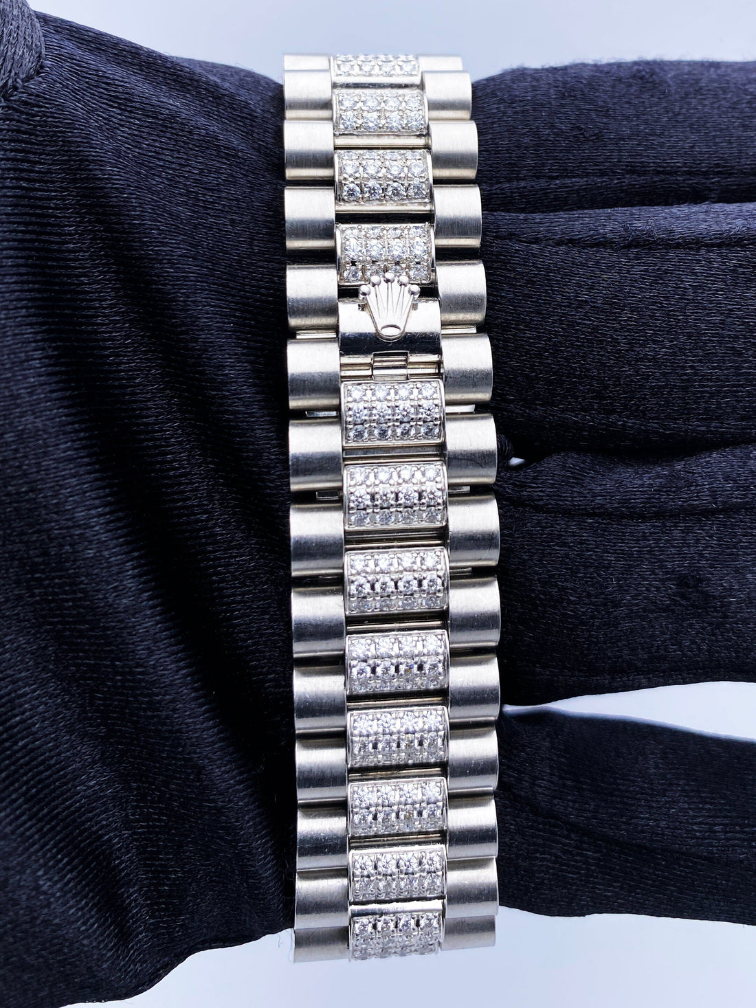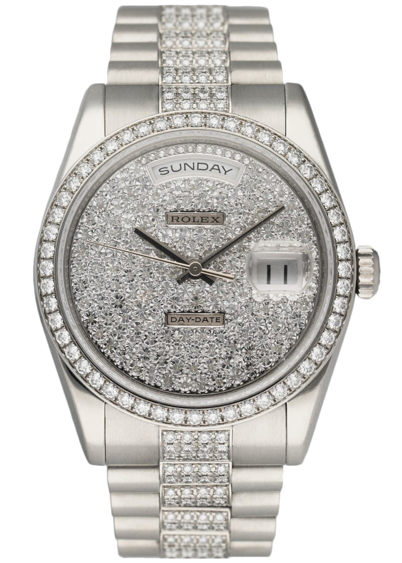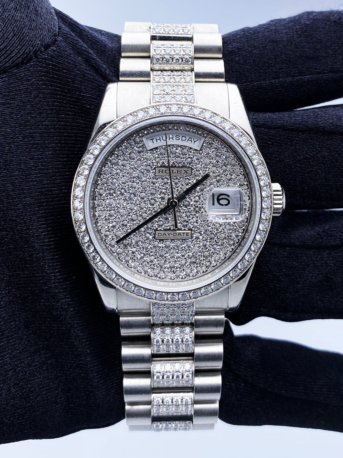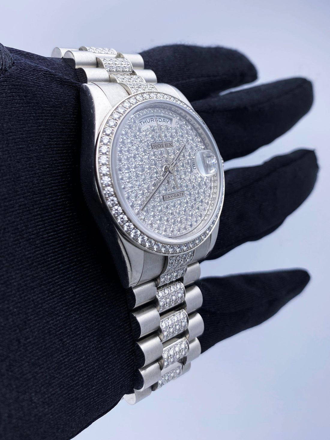 Rolex Day-Date President 118346 Mens Watch. 36mm platinum case. Platinum bezel with original factory diamond set insert. Pave diamond dial with silver-tone hands. Date display at the 3 o'clock position. Day display at the 12 o'clock position. Platinum & original factory diamond set President bracelet with hidden fold over platinum clasp. Will fit up to a 7-inch wrist. Automatic self-winding movement. Circa: 2007. This watch comes with original Box and Papers.