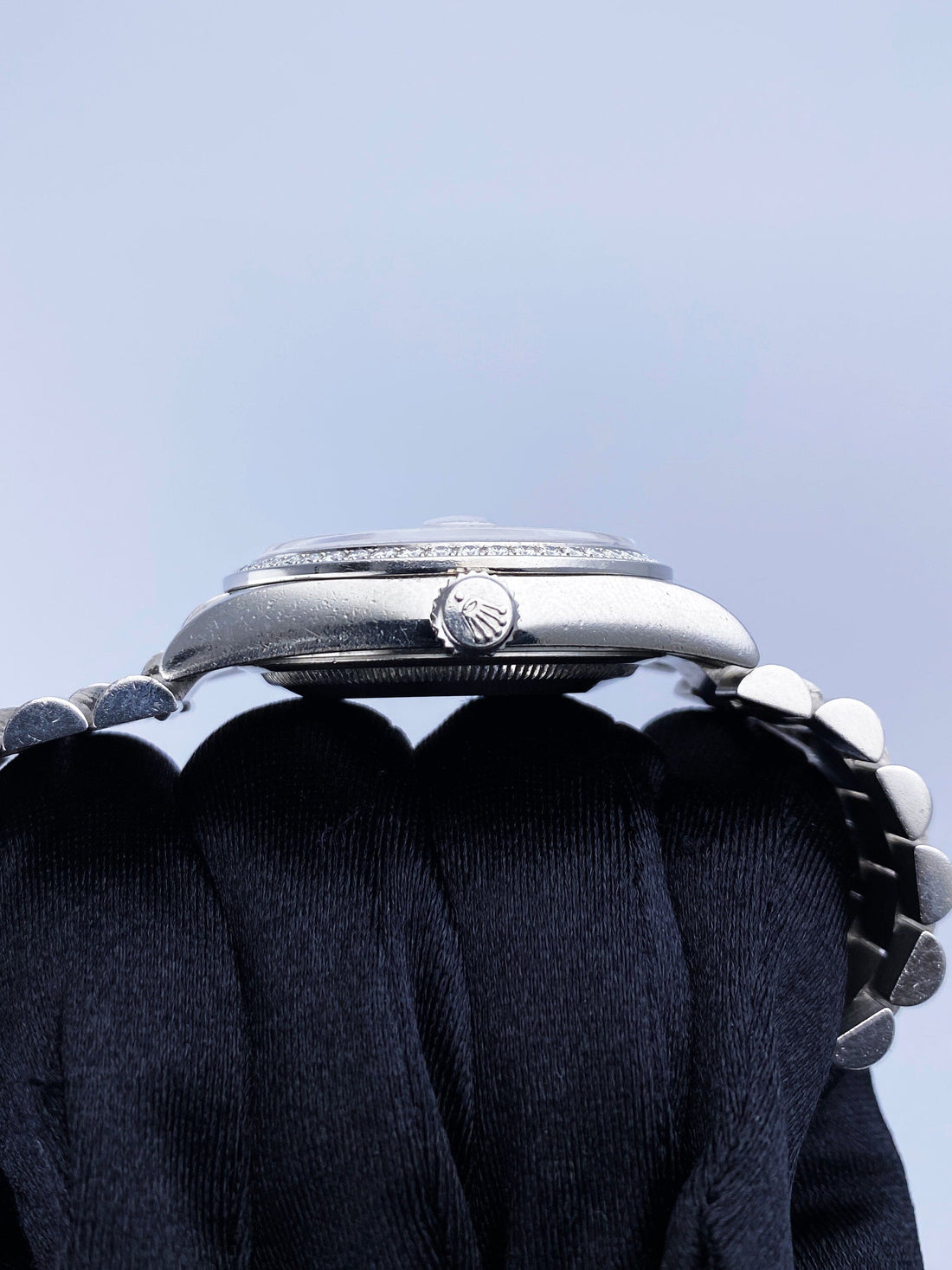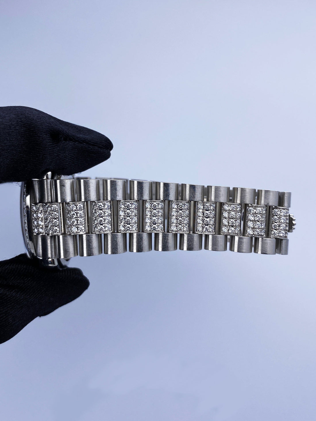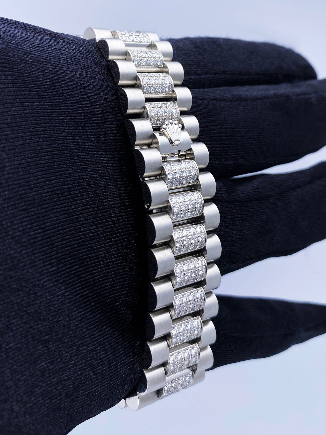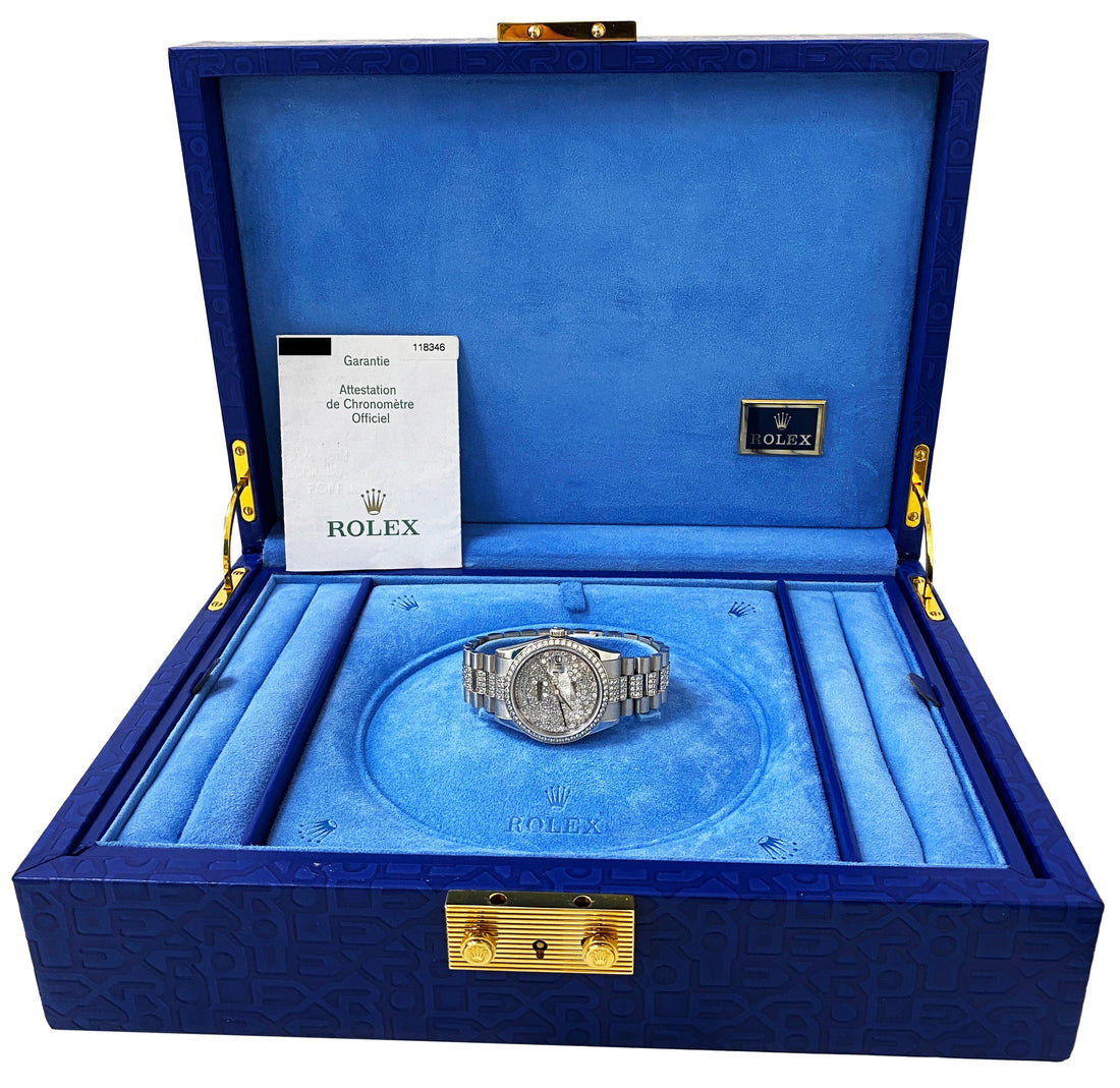 Rolex Day-Date President 118346 Mens Watch. 36mm platinum case. Platinum bezel with original factory diamond set insert. Pave diamond dial with silver-tone hands. Date display at the 3 o'clock position. Day display at the 12 o'clock position. Platinum & original factory diamond set President bracelet with hidden fold over platinum clasp. Will fit up to a 7-inch wrist. Automatic self-winding movement. Circa: 2007. This watch comes with original Box and Papers.