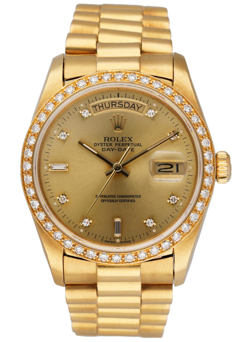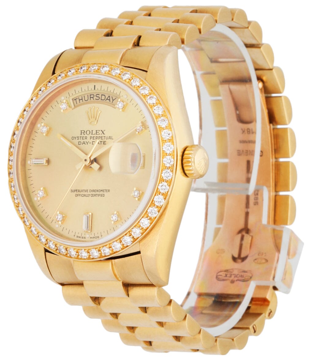 Rolex Oyster Perpetual Day-Date President 18048 Mens Watch. 36mm 18k yellow gold case. 18k yellow gold bezel with factory diamonds. Champagne dial with gold hands and factory diamonds hour marker. Day display at 12 o'clock position. Date display at 3 o'clock position. Single quickset date function. Sapphire crystal glass. Solid 18k yellow gold President bracelet with hidden fold over clasp. Will fit up to a 6.75-inch wrist. Automatic self-wind movement.