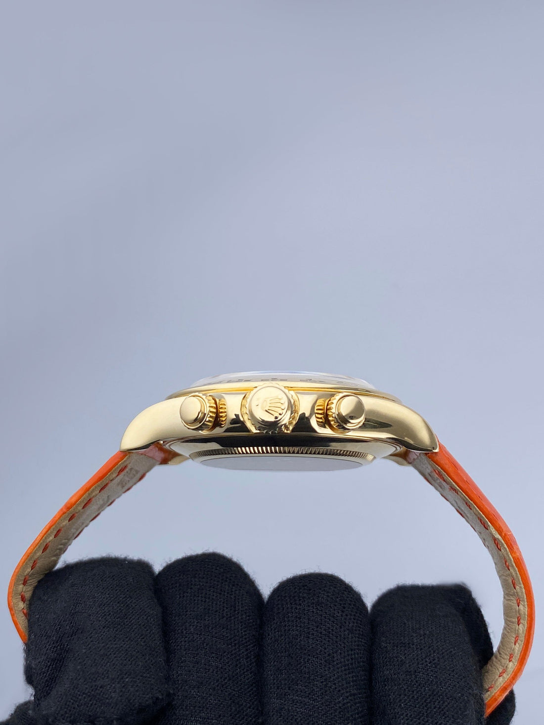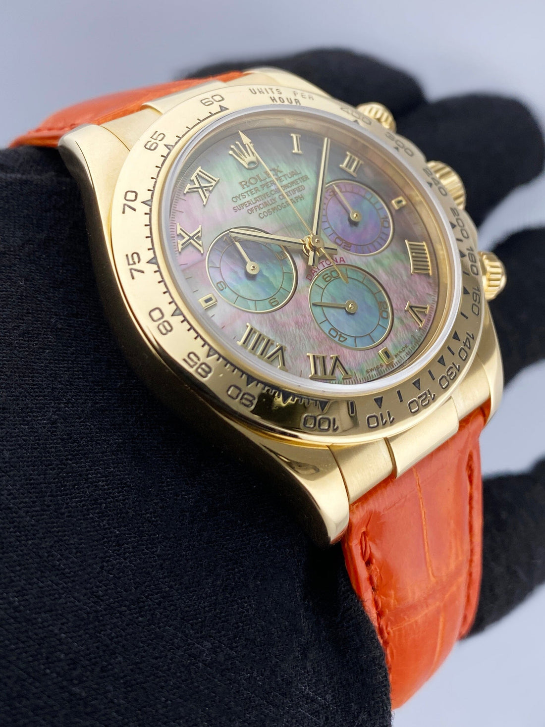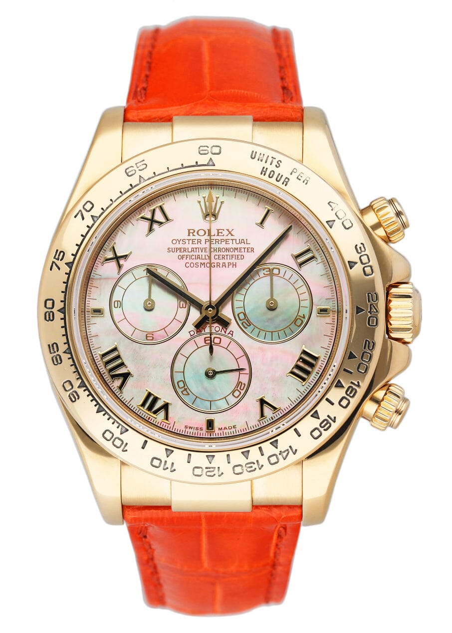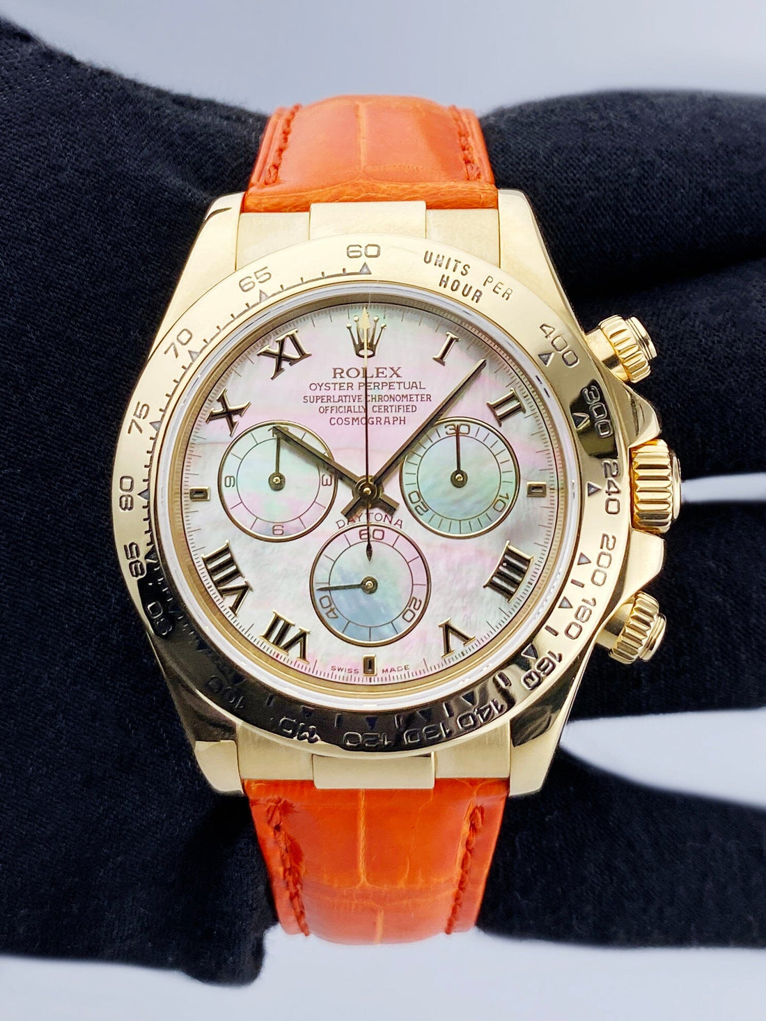 Rolex Oyster Perpetual Daytona 116518 Mens Watch. 40mm 18K yellow gold case with 18K yellow gold tachymeter bezel. Mother of pearl dial with gold hands and Roman numeral hour marker. Three sub-dials. Small seconds hand at 6 o'clock. 30-minute counter at 3 o'clock. 12-hour counter at 9 o'clock. Minute maker on the outer dial. Orange leather strap with 18K yellow gold fold over clasp with safety. Will fit up to 6.5-Inch wrist. Sapphire crystal. 18K yellow gold case back. Automatic self-winding movement.