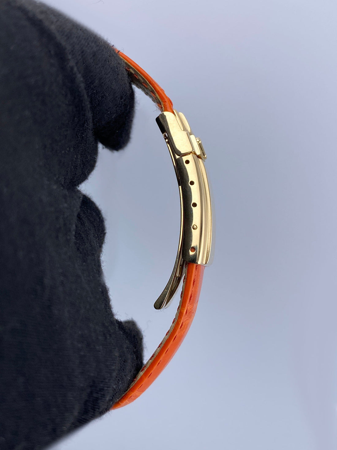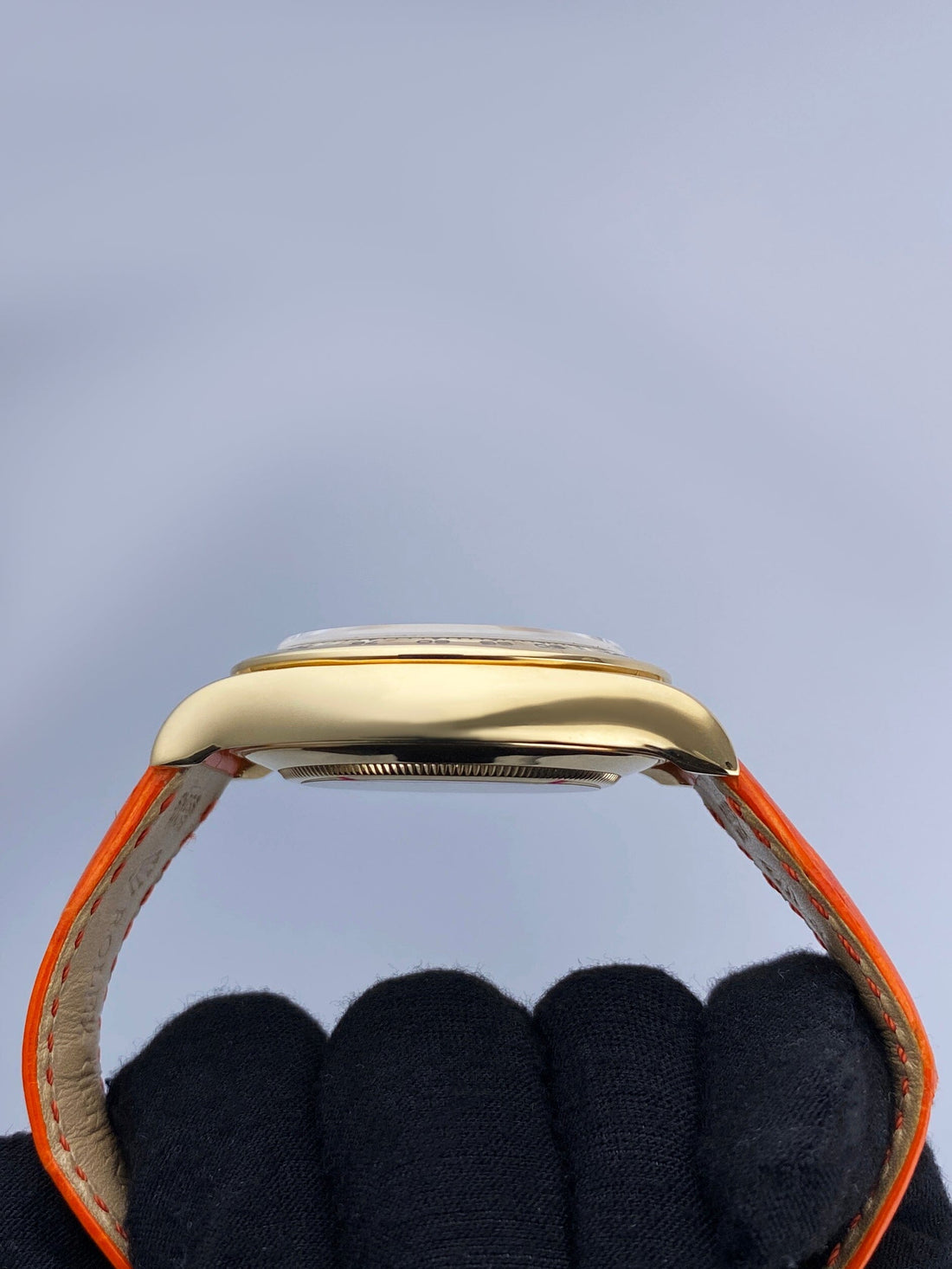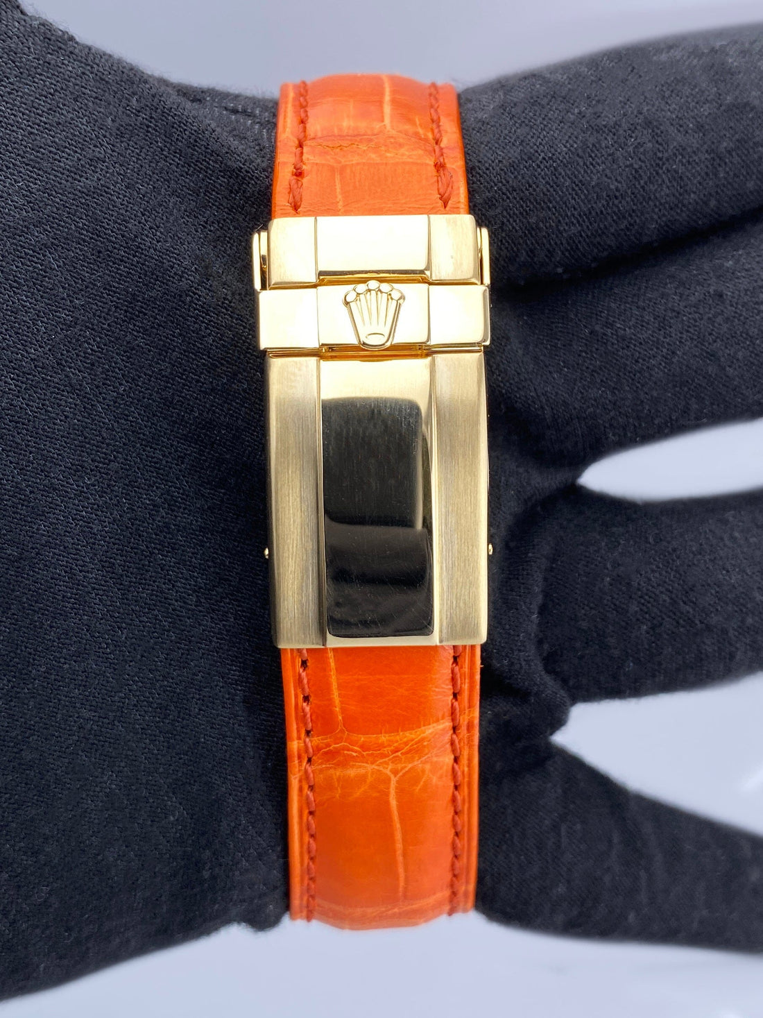 Rolex Oyster Perpetual Daytona 116518 Mens Watch. 40mm 18K yellow gold case with 18K yellow gold tachymeter bezel. Mother of pearl dial with gold hands and Roman numeral hour marker. Three sub-dials. Small seconds hand at 6 o'clock. 30-minute counter at 3 o'clock. 12-hour counter at 9 o'clock. Minute maker on the outer dial. Orange leather strap with 18K yellow gold fold over clasp with safety. Will fit up to 6.5-Inch wrist. Sapphire crystal. 18K yellow gold case back. Automatic self-winding movement.