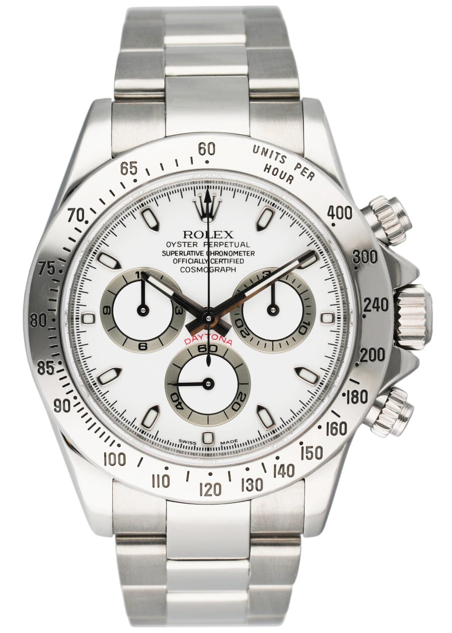 Rolex Oyster Perpetual Daytona 116520 Mens Watch. 40mm stainless steel case with stainless steel tachymeter bezel. White dial with luminous sliver hands and index hour marker. Three sub-dials. Small seconds hand at 6 o'clock. 30-minute counter at 3 o'clock. 12-hour counter at 9 o'clock. Minute maker on the outer dial. Stainless steel Oyster bracelet with fold over clasp with safety. Will fit up to 7-Inch wrist. Sapphire crystal. Stainless steel case back. Automatic self-winding movement. This watch comes with original Box and Papers.