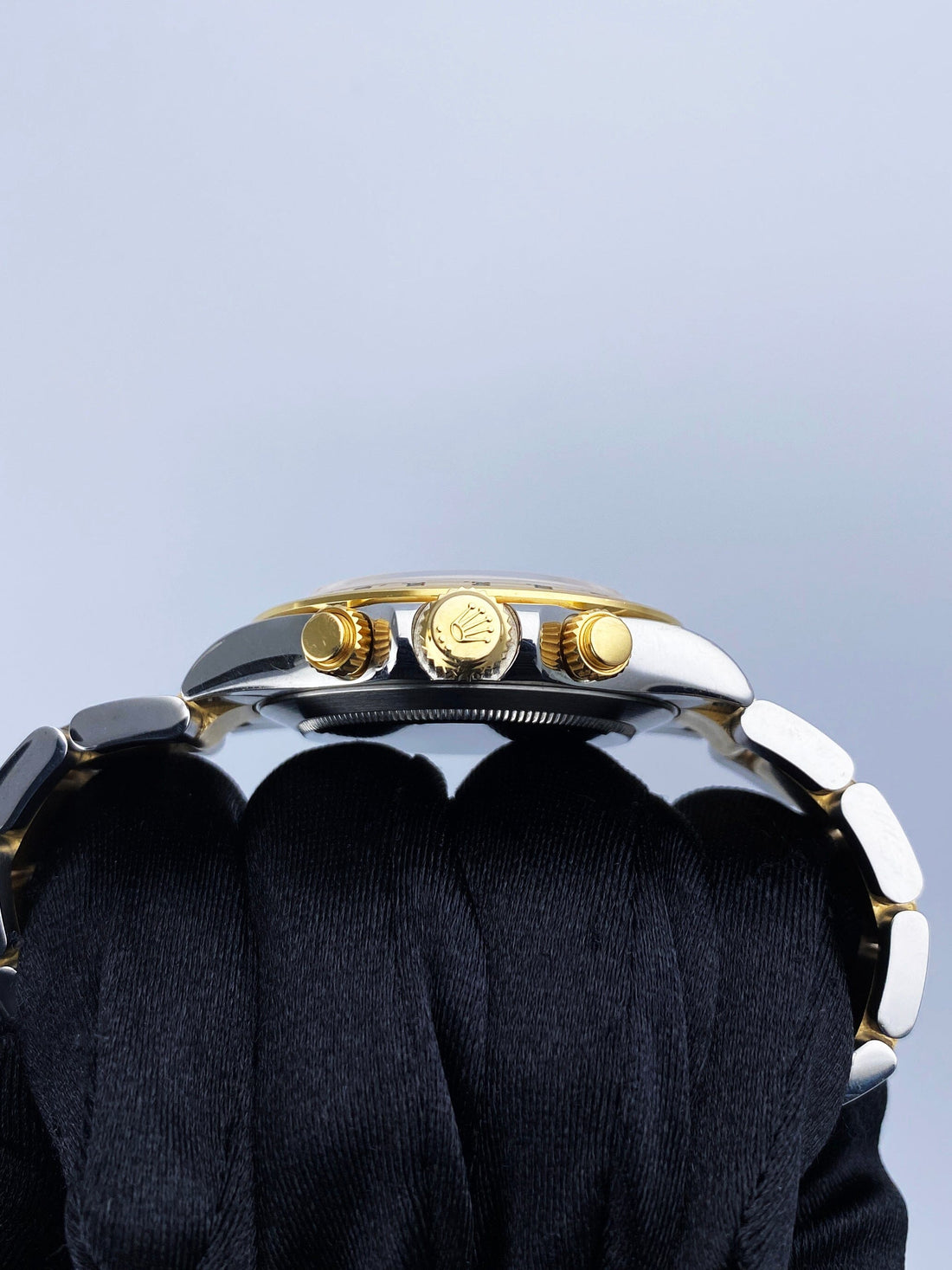 Rolex Oyster Perpetual Daytona 116523 Mens Watch. 40mm stainless steel case with 18K yellow gold tachymeter bezel. Mother of pearl dial with gold hands and factory diamond hour marker. Three sub-dials. Small seconds hand at 6 o'clock. 30-minute counter at 3 o'clock. 12-hour counter at 9 o'clock. Minute maker on the outer dial. Stainless steel and 18K yellow gold Oyster bracelet with fold over clasp with safety. Will fit up to 7.5-Inch wrist. Sapphire crystal. Stainless steel case back. Automatic self-winding movement.