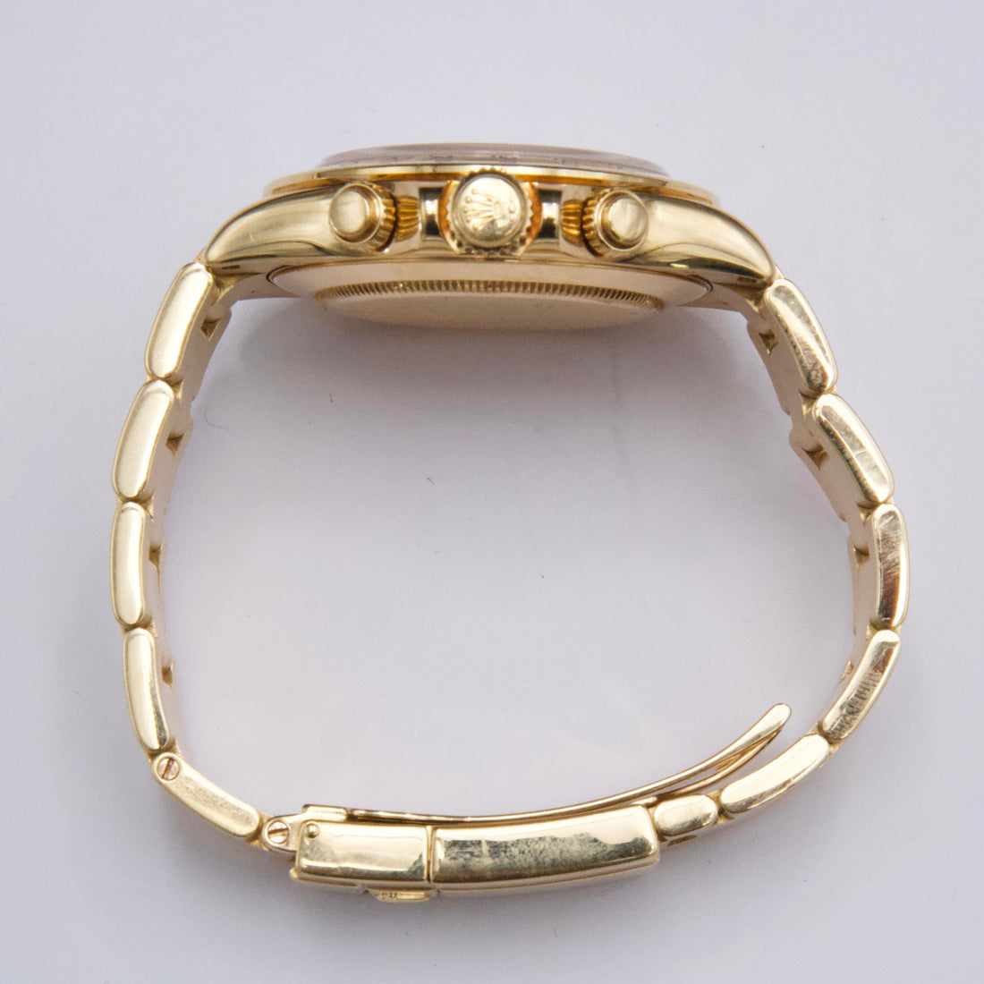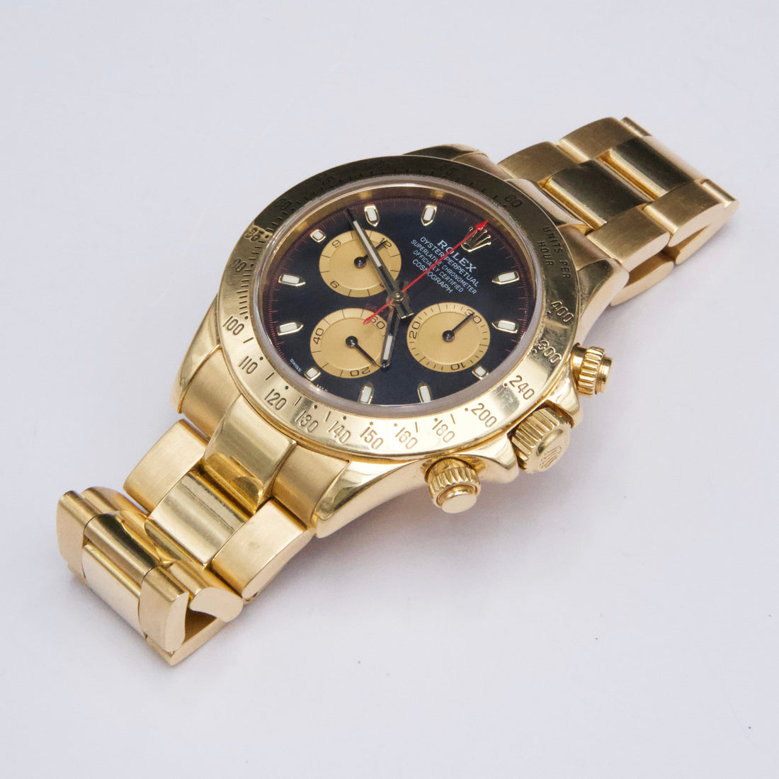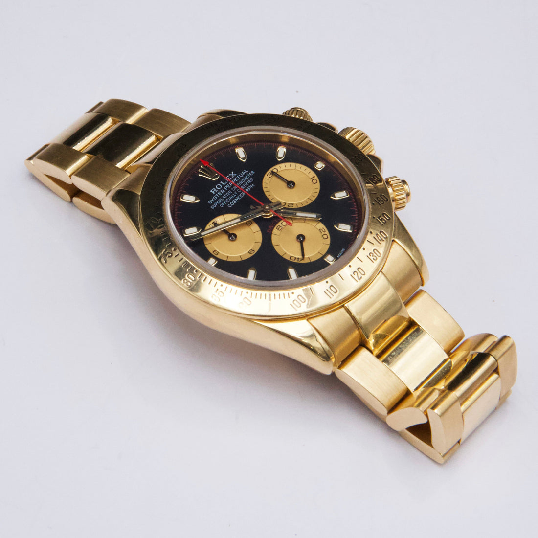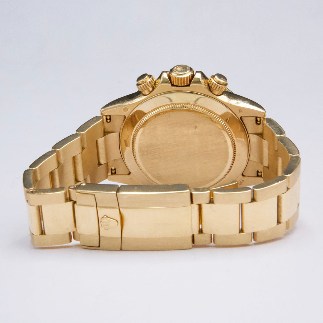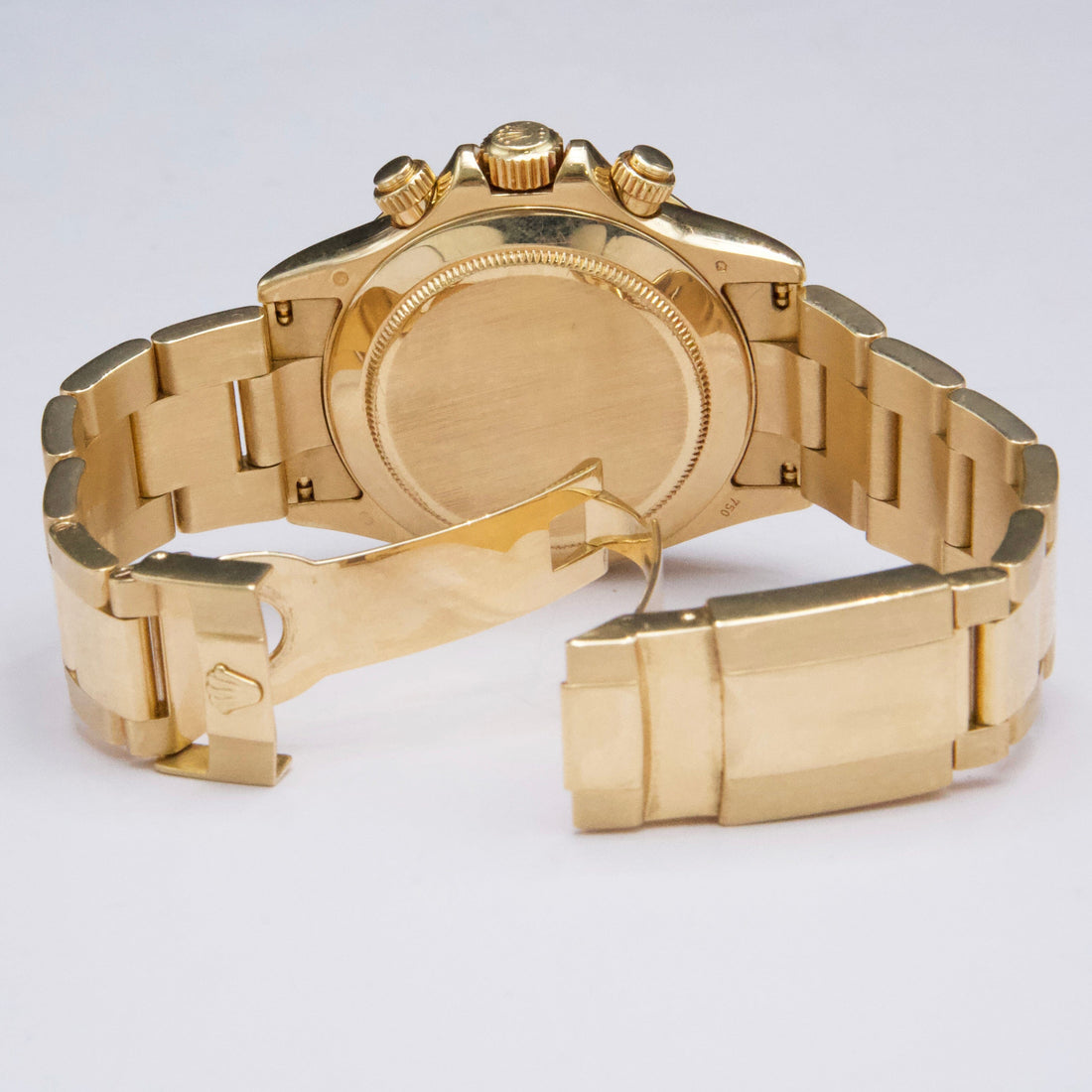 Rolex Oyster Perpetual Daytona 116528 Mens Watch. 40mm 18K yellow gold case. 18K yellow gold bezel. Black dial with gold hands and index hour marker. Three Champagne sub-dials: small second, 30 minute and 12 hour register. 18K yellow gold Oyster bracelet with fold over clasp with safety. Will fit up to 7-Inch wrist. Sapphire crystal. 18K yellow gold case back. Automatic self winding movement. This watch come with original Box and Papers.
