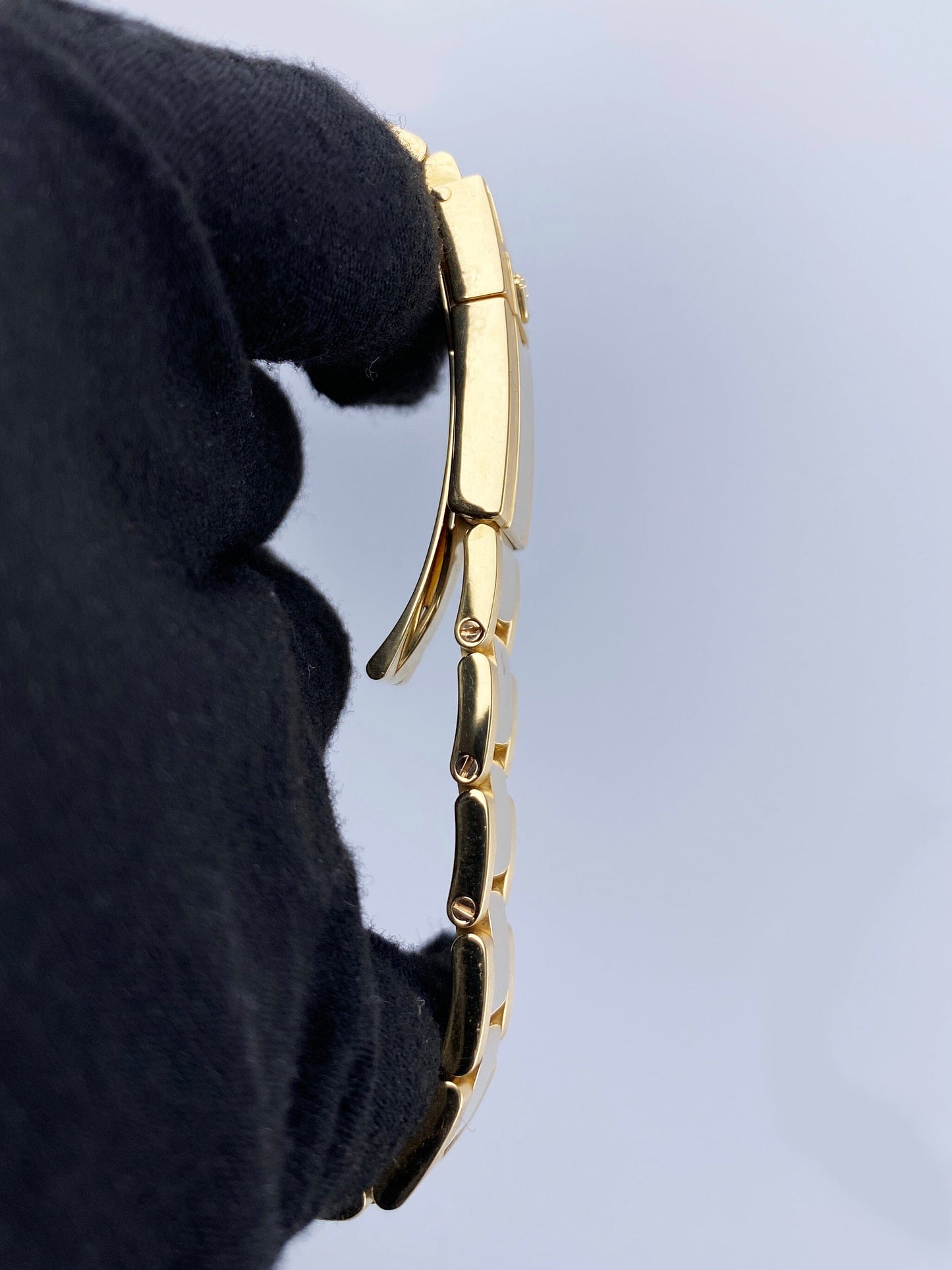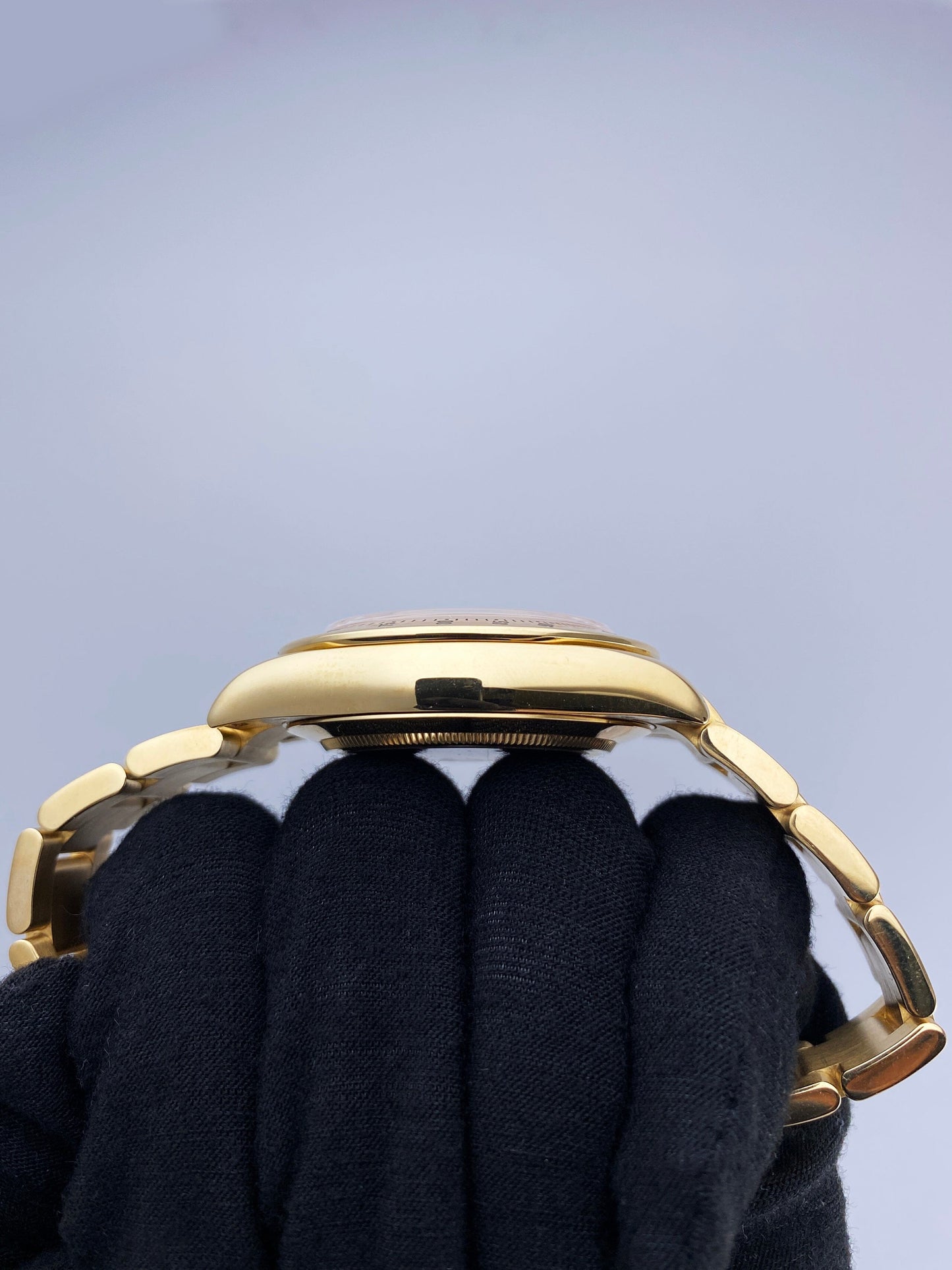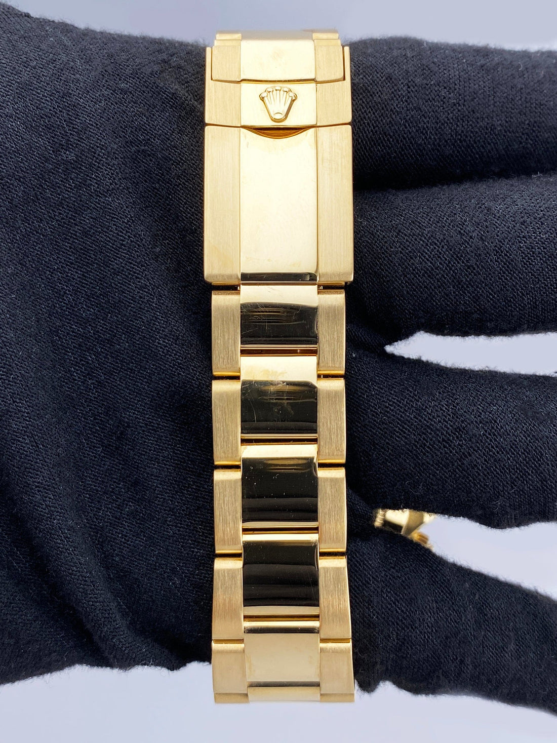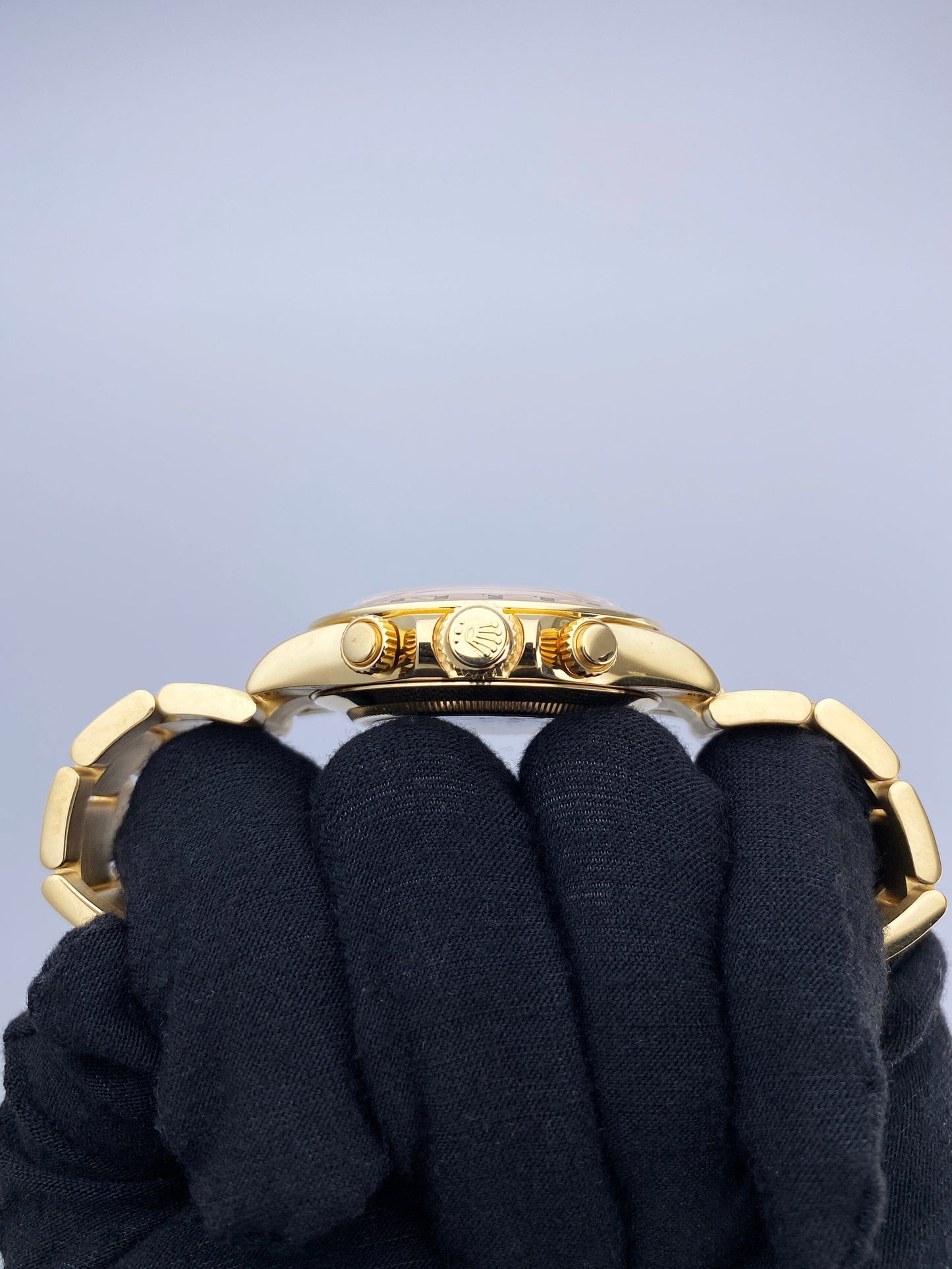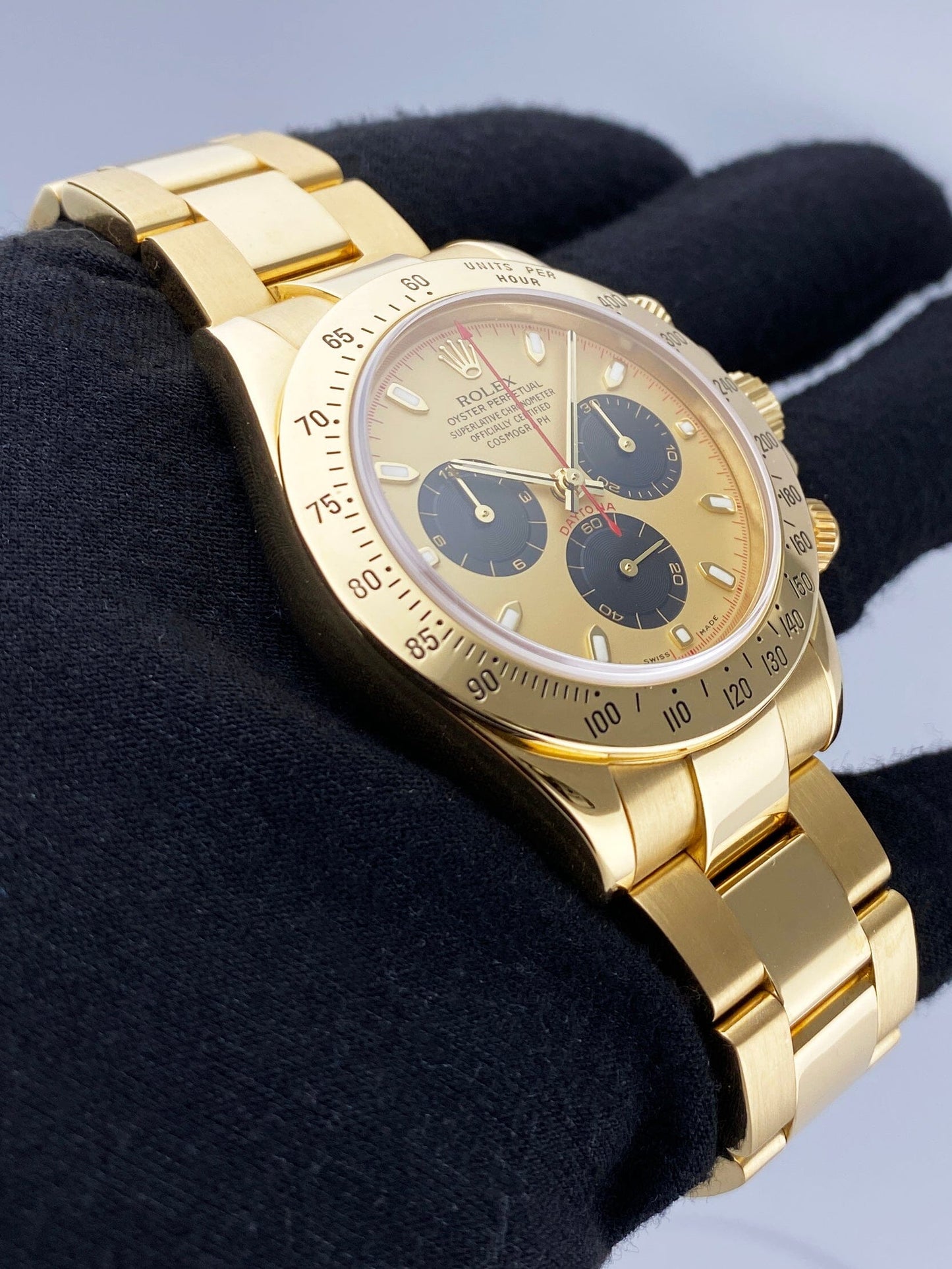 Rolex Oyster Perpetual Daytona 116528 Mens Watch. 40mm 18K yellow gold case. 18K yellow gold bezel. Champagne dial with gold hands and index hour marker. Three sub-dials: small second, 30 minute and 12 hour register. 18K yellow gold Oyster bracelet with fold over clasp with safety. Will fit up to 7-Inch wrist. Sapphire crystal. 18K yellow gold case back. Automatic self winding movement. This watch comes with original Box and Papers.