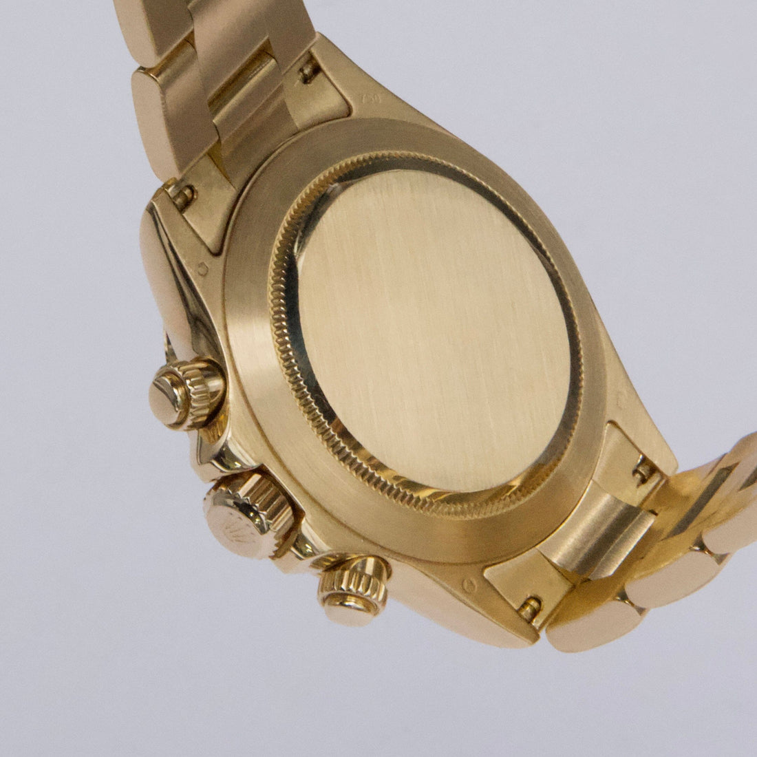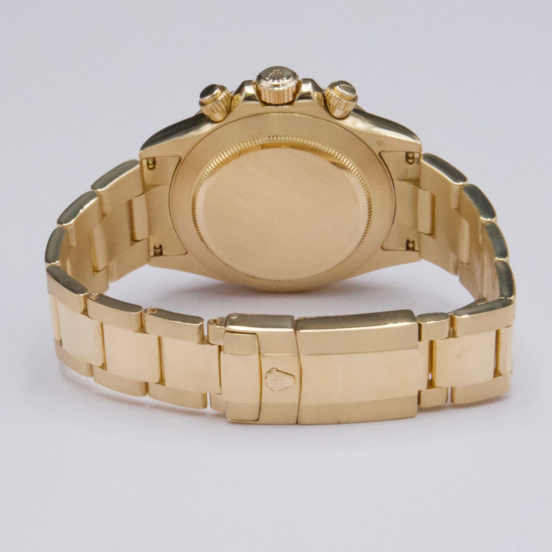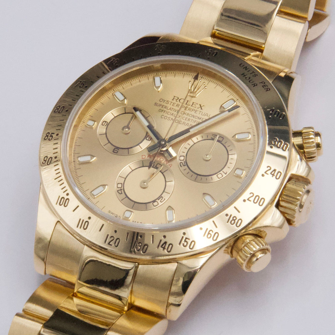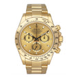 Rolex Oyster Perpetual Daytona 116528 Mens Watch. 40mm 18K yellow gold case. 18K yellow gold bezel. Champagne dial with gold hands and index hour marker. Three sub-dials: small second, 30 minute and 12 hour register. 18K yellow gold Oyster bracelet with fold over clasp with safety. Will fit up to 7-Inch wrist. Sapphire crystal. 18K yellow gold case back. Automatic self winding movement. This watch comes with original Box and Papers.